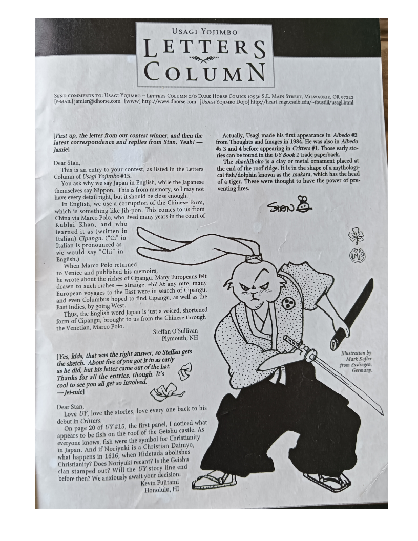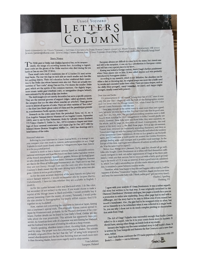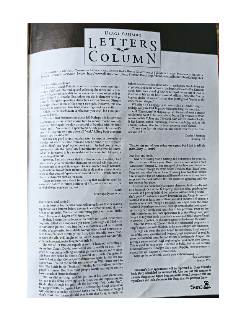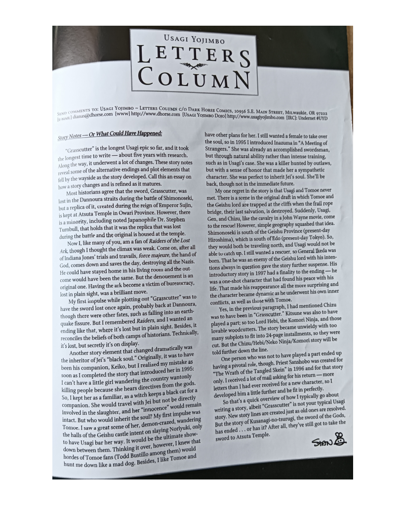 >>152986447>Now I'm only guessing here, but I suspect when Stan first mentioned a Wong Fei-Hong x Usagi story in that letter from the Fantagraphics era, he may have gotten some inaccurate information or just didn't do the research himself to realize that the two lived in completely separate eras. This seems an easy fact to check up on these days but back in the late 80s early 90s you would have had to actually track down a book on Chinese history of the 1800s to know. It really makes you appreciate how much easier we have it these days.I do think it's likely he just wasn't aware of the timeline discrepancy, yes. With that said, it can easily be worked around- after all Usagi is not Musashi, he could easily meet Wong... Xuetulei or something. Around the same time Usagi is happening, you still had the Shaolin temple and everything.I think odds are as the comic is tightening down on its setting (with Grasscutter explicitly tying it to real Japanese legend and historical events as opposed to a more loose setting where it's clearly Japan but specific names are changed), he just realised having Usagi leave the country, adventure, and come back, was a bit too unlikely for the setting, especially if he didn't want Usagi to spend years in this trip.