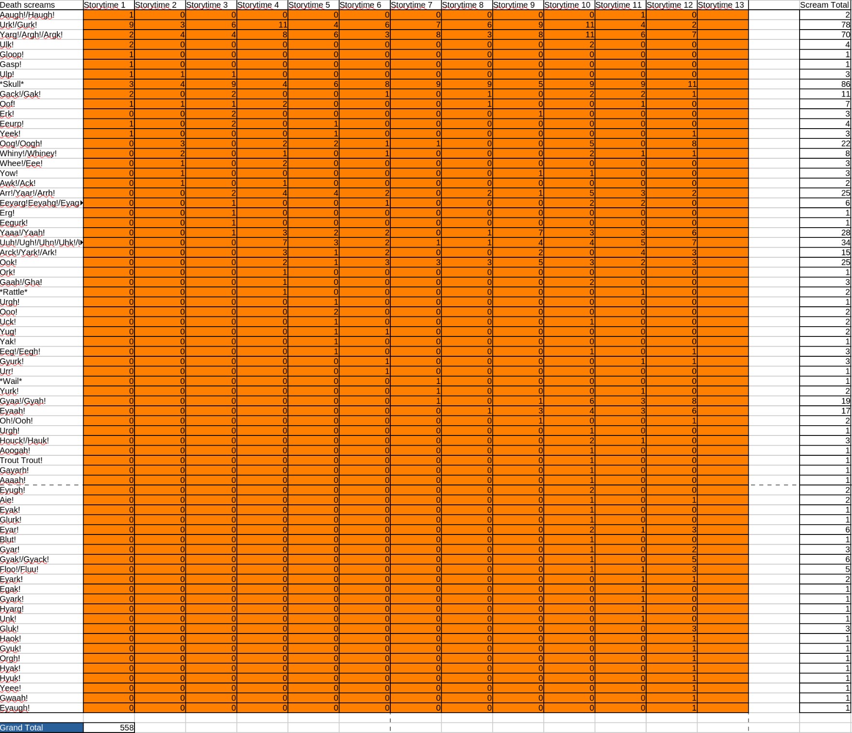 Welcome back to the death rattle tally! Here are the new screams found in today's storytime:>Gluk!: 3>Haok!: 1>Gyuk!: 1>Orgh!: 1>Hyak!: 1>Hyuk!: 1>Yeee!: 1>Gwaah!: 1>Eyaugh!: 1See attachment for total cry so far. As always, if you have any questions about the count, feel free to ask.