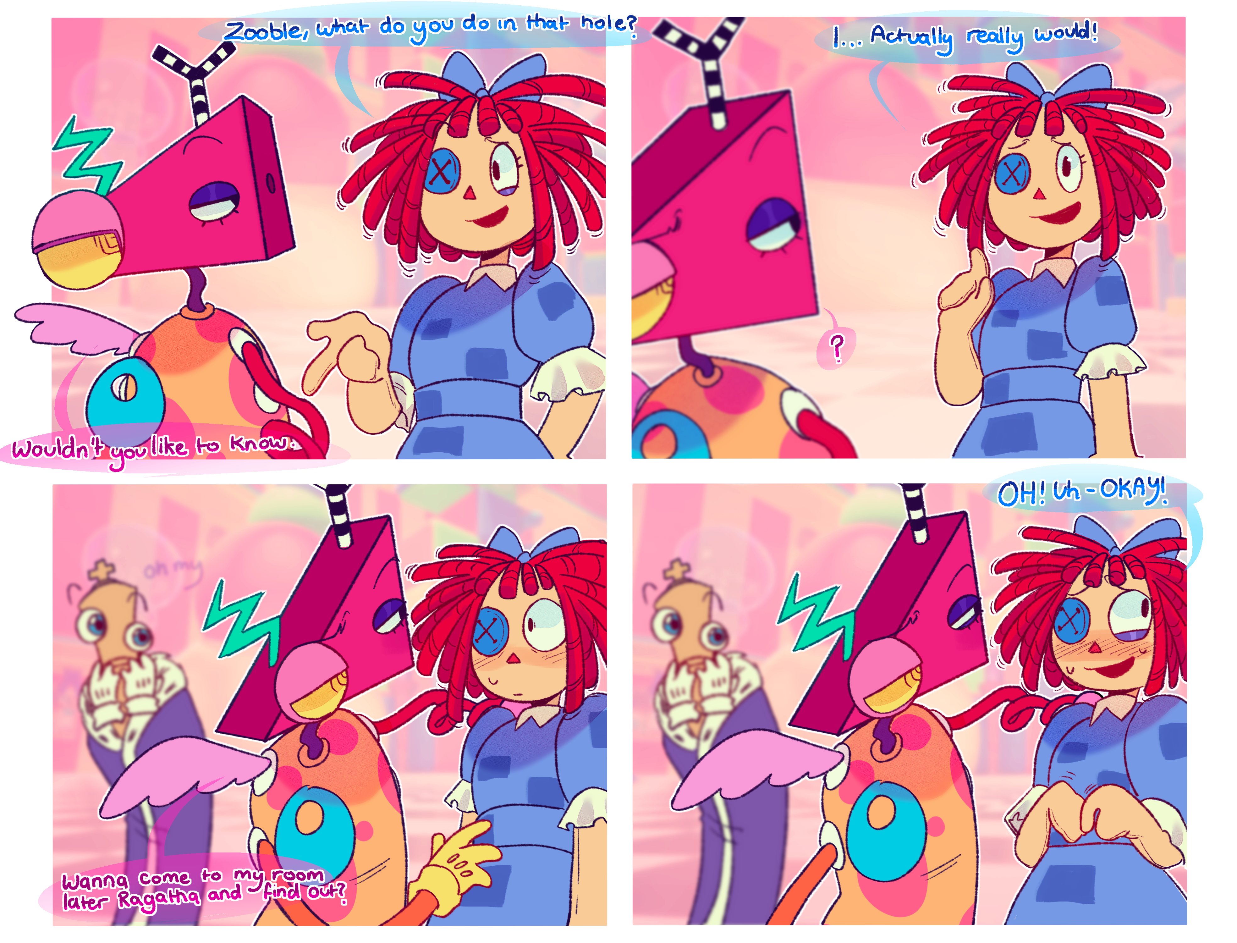 >R: Oh, we're doing a school adventure again?>J: Good, Jax didn't let Gangle finish the last one>G: Uh, my next plan was... less appropriate for children...>P: Okay, I see where this is going>K: Now class today we'll be learning abo*BANG*>J: Alright ladies, and Zooble, my AK friend here wants to find out which of you wants to be the lucky one