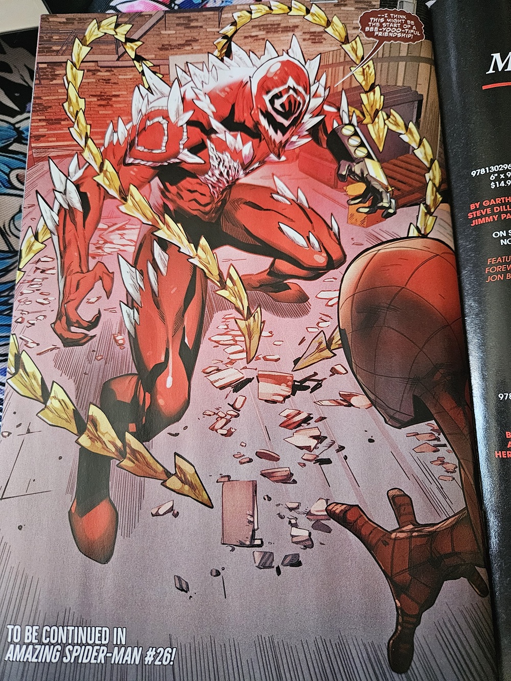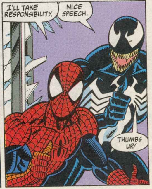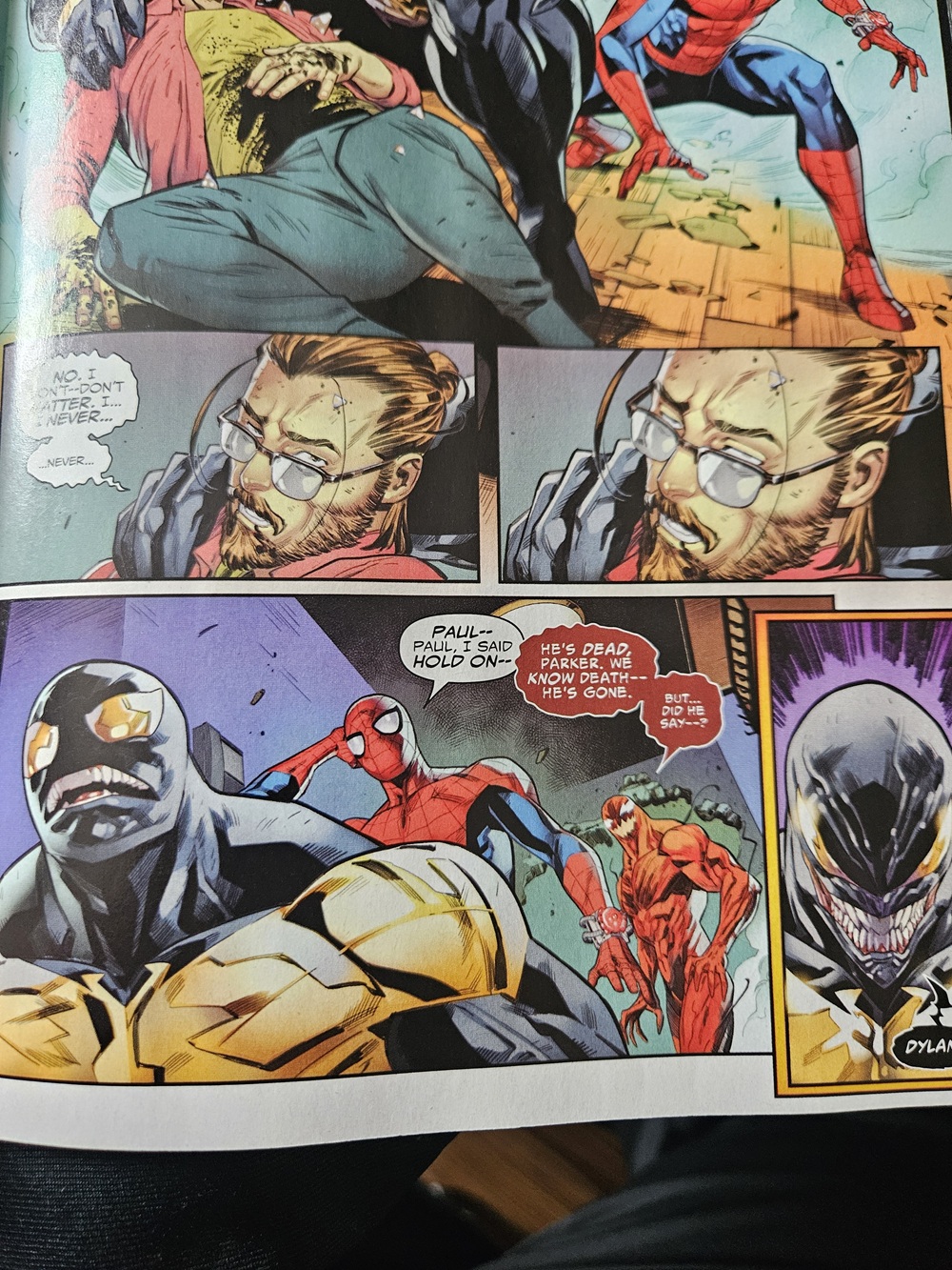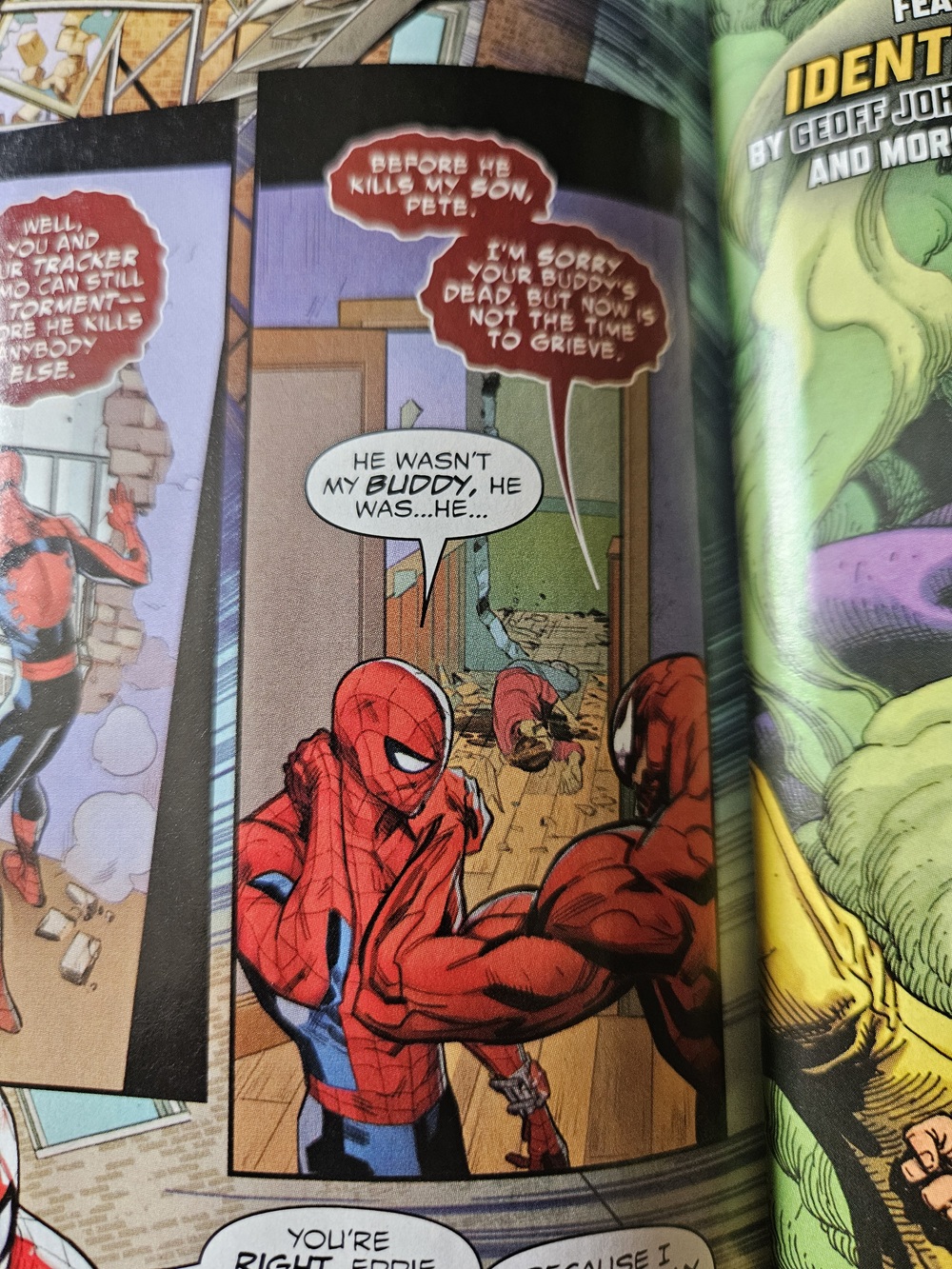 MJ and Venom went after Dylan (who has shrapnel in his leg after Paul destroyed on of the Shocker Gauntlets) in the sewers and found him and they hug it out when Dylan learns Paul is dead. All while Peter and Eddie fight Torment. Eddie wants to kill him for killing his family, but Peter keeps stopping him and convinces him to take him in alive. But Carnage gets pissed off with Eddie and then this happens.