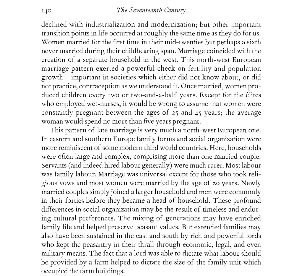 >>153004825>Women married for the first time in their mid-twenties but perhaps a sixth never married during their childbearing span. Marriage coincided with the creation of a separate household in the west. This north-west European marriage pattern exerted a powerful check on fertility and population growth - important in societies which either did not know about, or did not practice, contraception as we understand it. Once married, women produced children every two or two-and-a-half years. Except for the elites who employed wet-nurses, it would be wrong to assume that women were constantly pregnant between the ages of 25 and 45 years; the average woman would spend no more than five years pregnant. This pattern of late marriage is very much a north-west European one. In eastern and southern Europe family forms and social organization were more reminiscent of some modern third world countries. Here, households were often large and complex, comprising more than one married couple. Servants (and indeed hired labour generally) were much rarer. Most labour was family labour. Marriage was universal except for those who took religious vows and most women were married by the age of 20 years. Newly married couples simply joined a larger household and men were commonly in their forties before they became a head of household.Source - Early Modern Europe: An Oxford Historytl;dr version - in north and west europe women married in their early-to-mid twenties, younger women marrying older men was only seen with any regularity in south and east europe, particularly in those areas occupied by the ottoman turks.