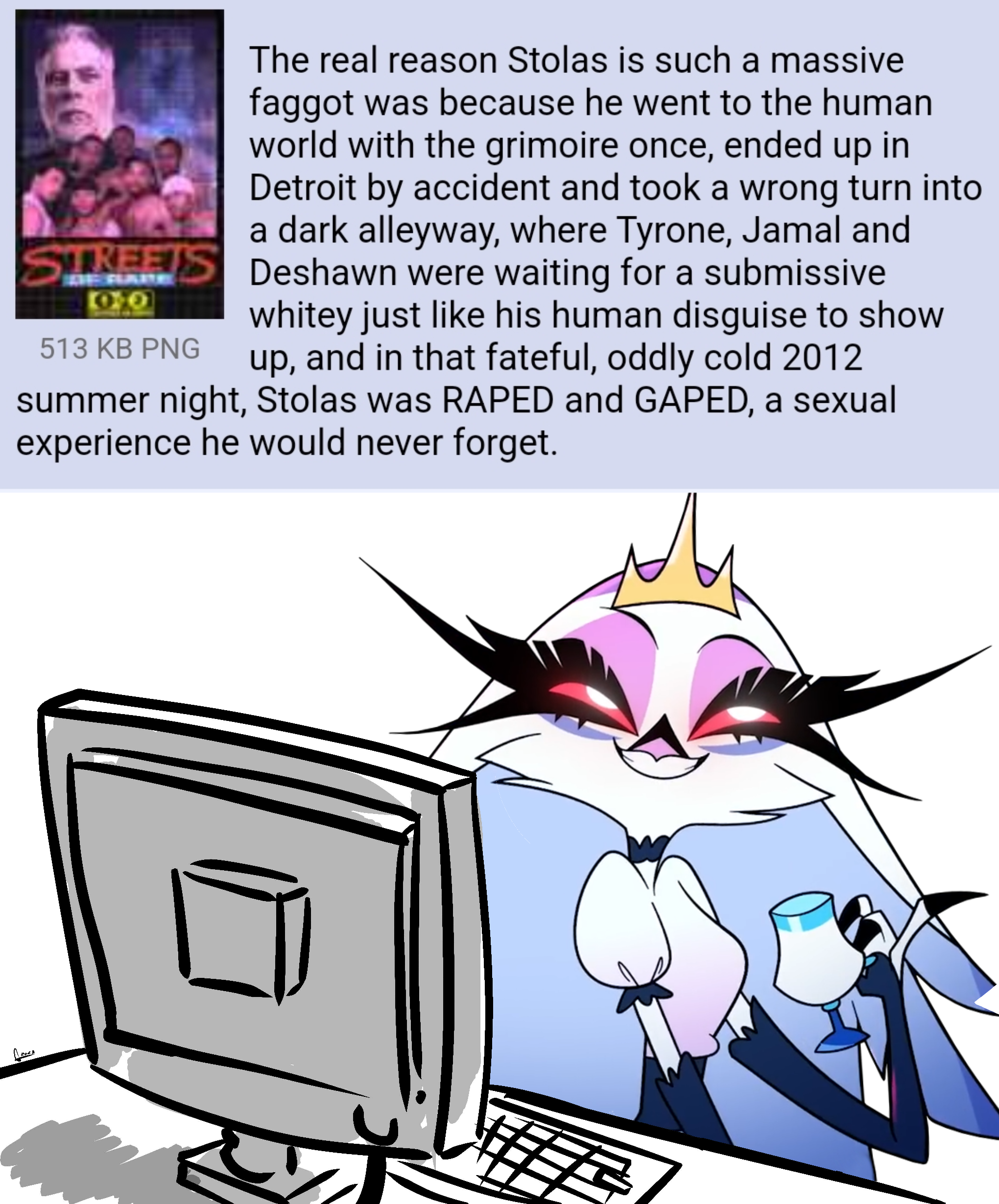 I disagree. As said, Stolas/Stola will be a Blitzosexual regardless of what outcome. However, Blitzo is going to fuck anything. I'd say Stola would gladly bring you in for a threesome so long as she had blitzo at one end of her, and that would get her in the mood that it would be a pleasant experience.