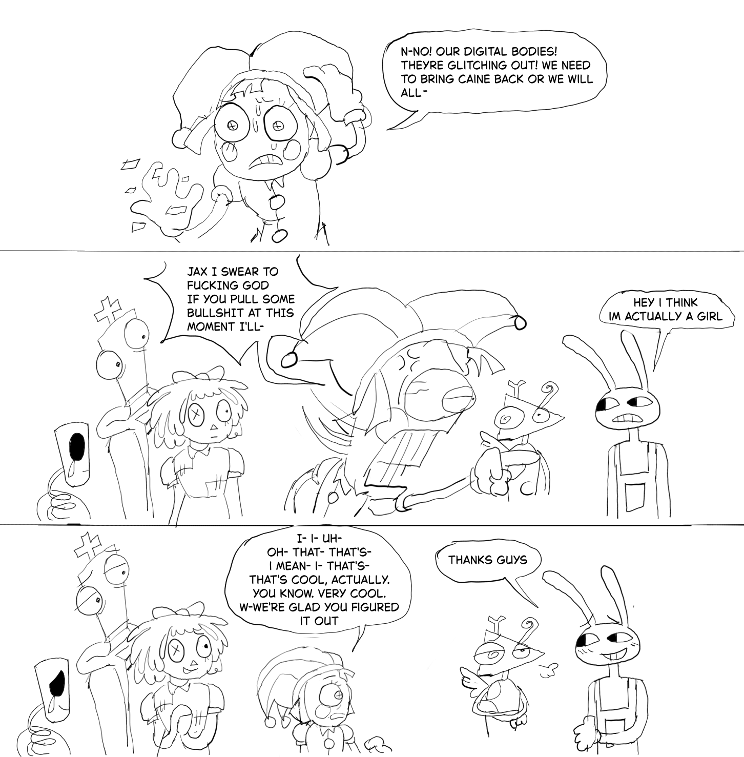>>153020958>CliffhangingPomni, for having all her fingers.>BoxingRagatha, her dolly body can take a punch.>WonderbreadRagatha again, she’s rich and curvy.>Appreciating floor tilesJax