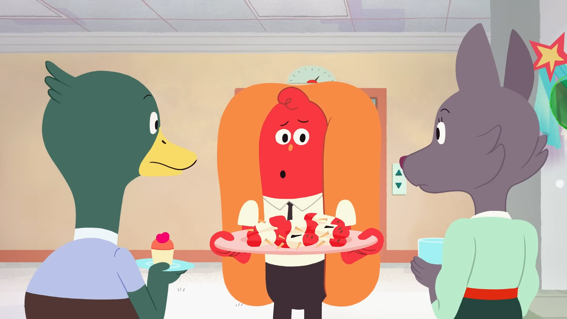 The setting is just Apple & Onion all over again, except this one also has animal characters intercating with food people. What's the cohesion here? Such a strange choice.