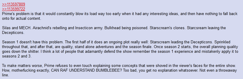 >>153031516It didn't. It's a huge pile of interesting subplots that don't go anywhere and constant treasure hunts with the most boring, stick in the mud Optimus possible. The animation direction is also pretty bad, with characters making pointless dynamic poses when shooting shooting while standing in the open or jumping around empty spaces and everything being stuck in limbo, where points of reference and interactions with the surrounding area and/or characters rarely matter. Most fights are a CGI equivalent of jingling the keys to keep your attention. It's a mess.The only actually good things about it are the Decepticons, who are almost universally great (with notable exception of the most boring Soundwave ever, who for some reason gets hyped for not talking and being a walking plot device with zero personality), Ratchet and Arcee.