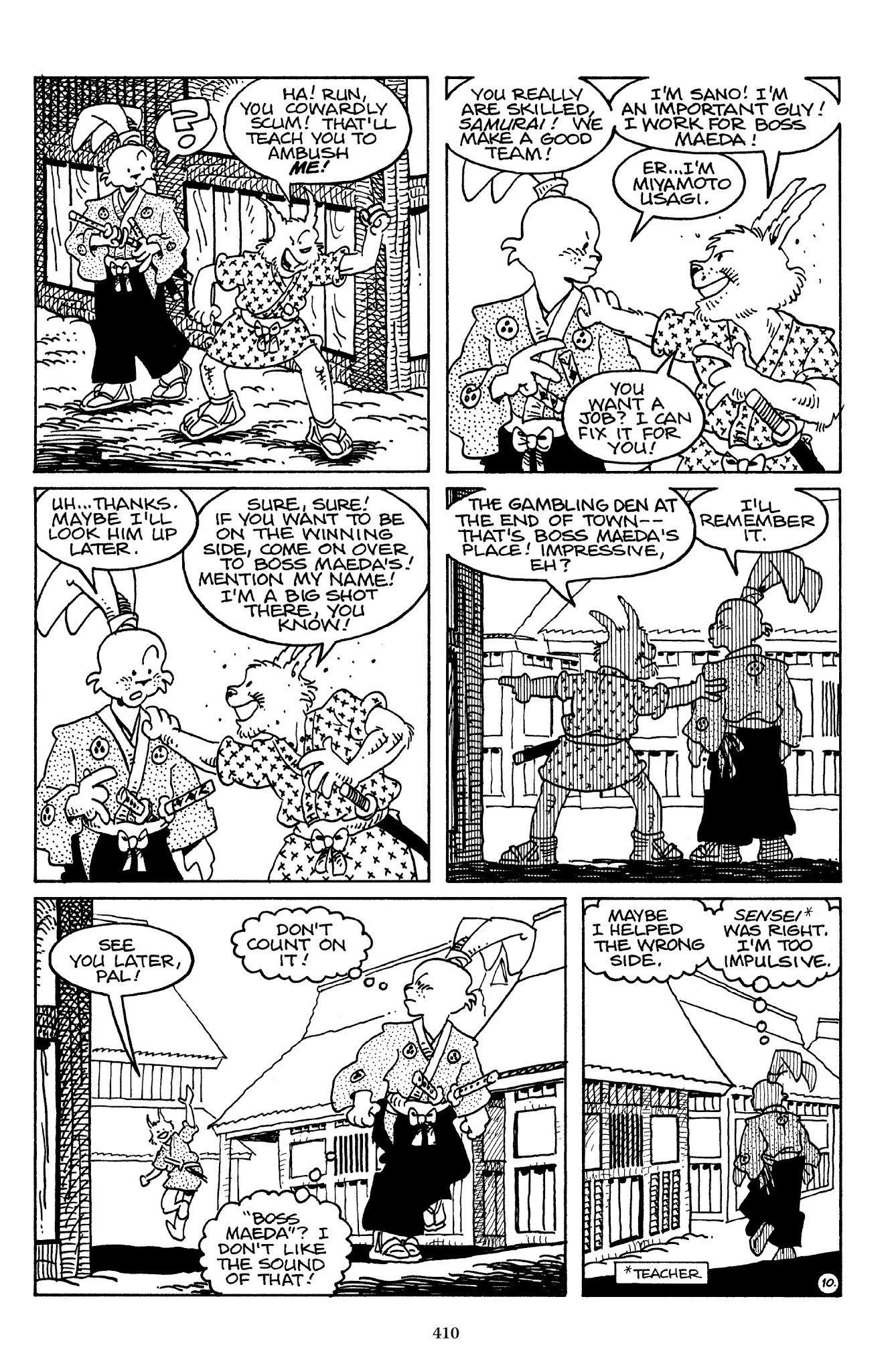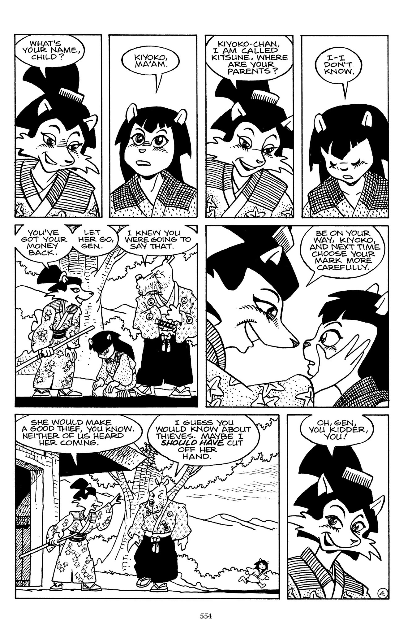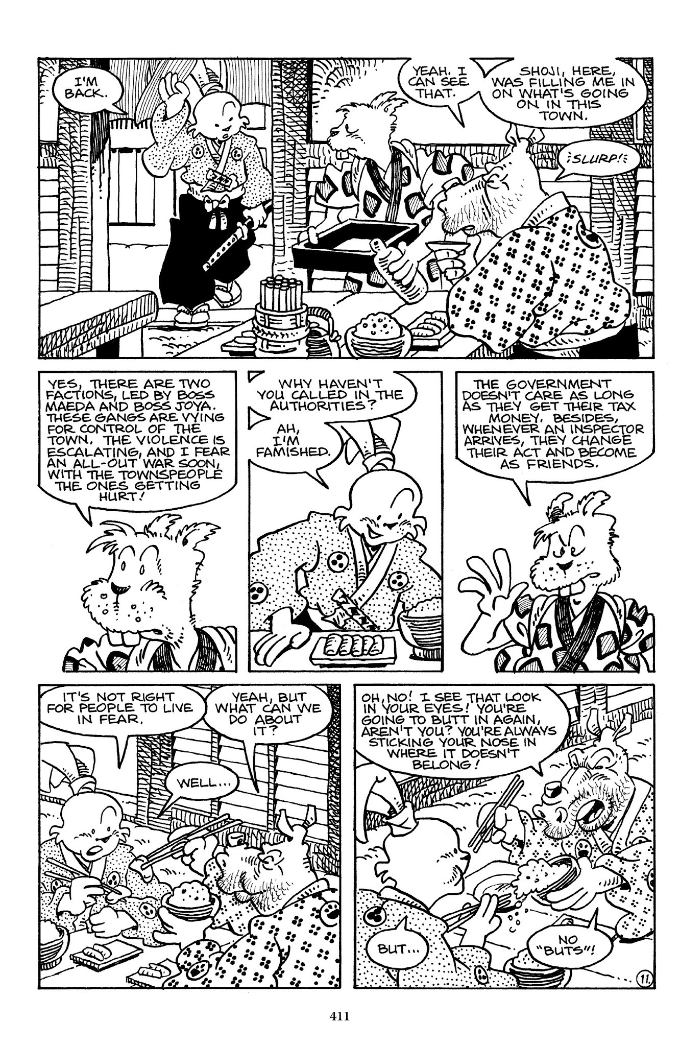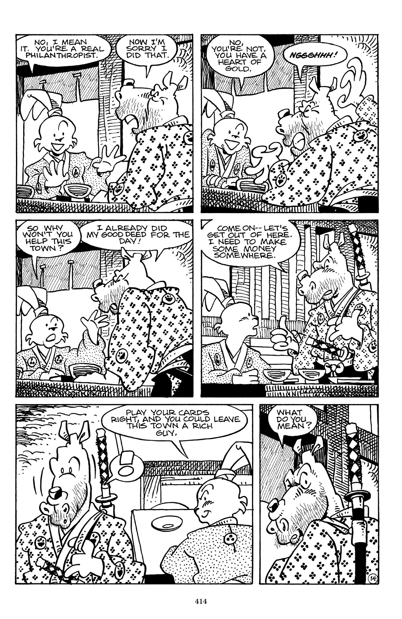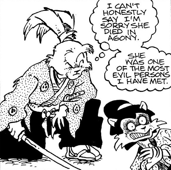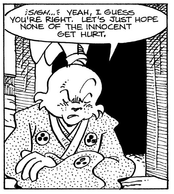 I can't believe how evil Usagi is, encouraging a child to go learn swordfighting with a hermit in the mountain. Does he not get he's endangering him, setting him up to be possibly killed in the future in a fight?