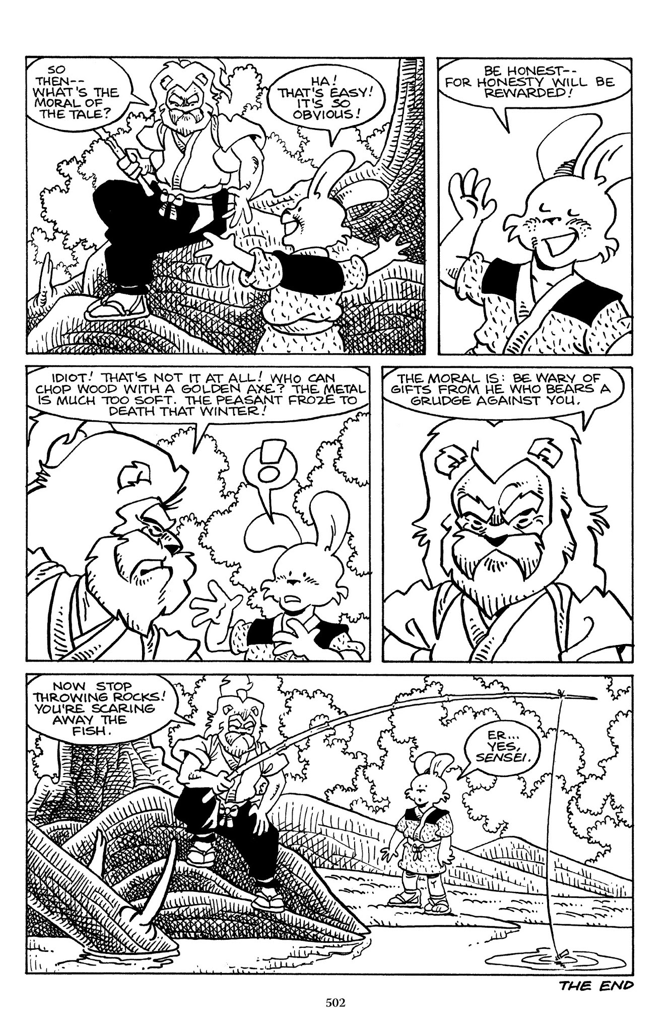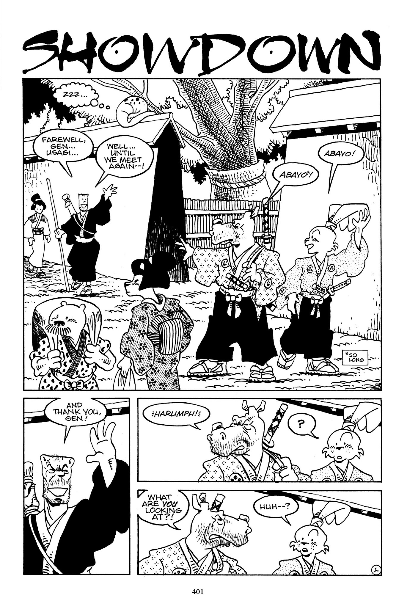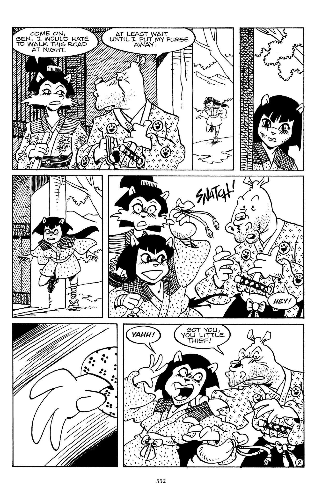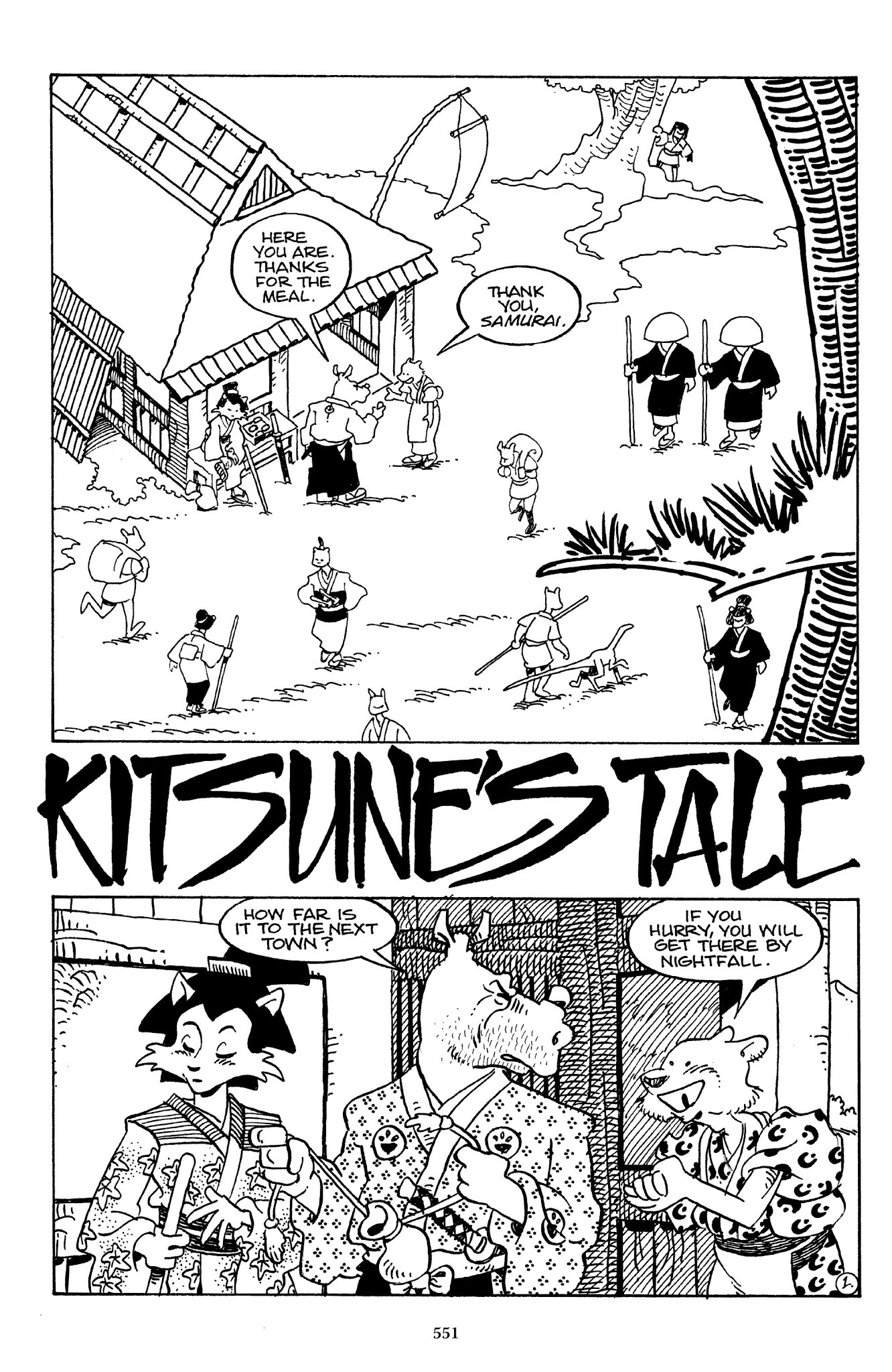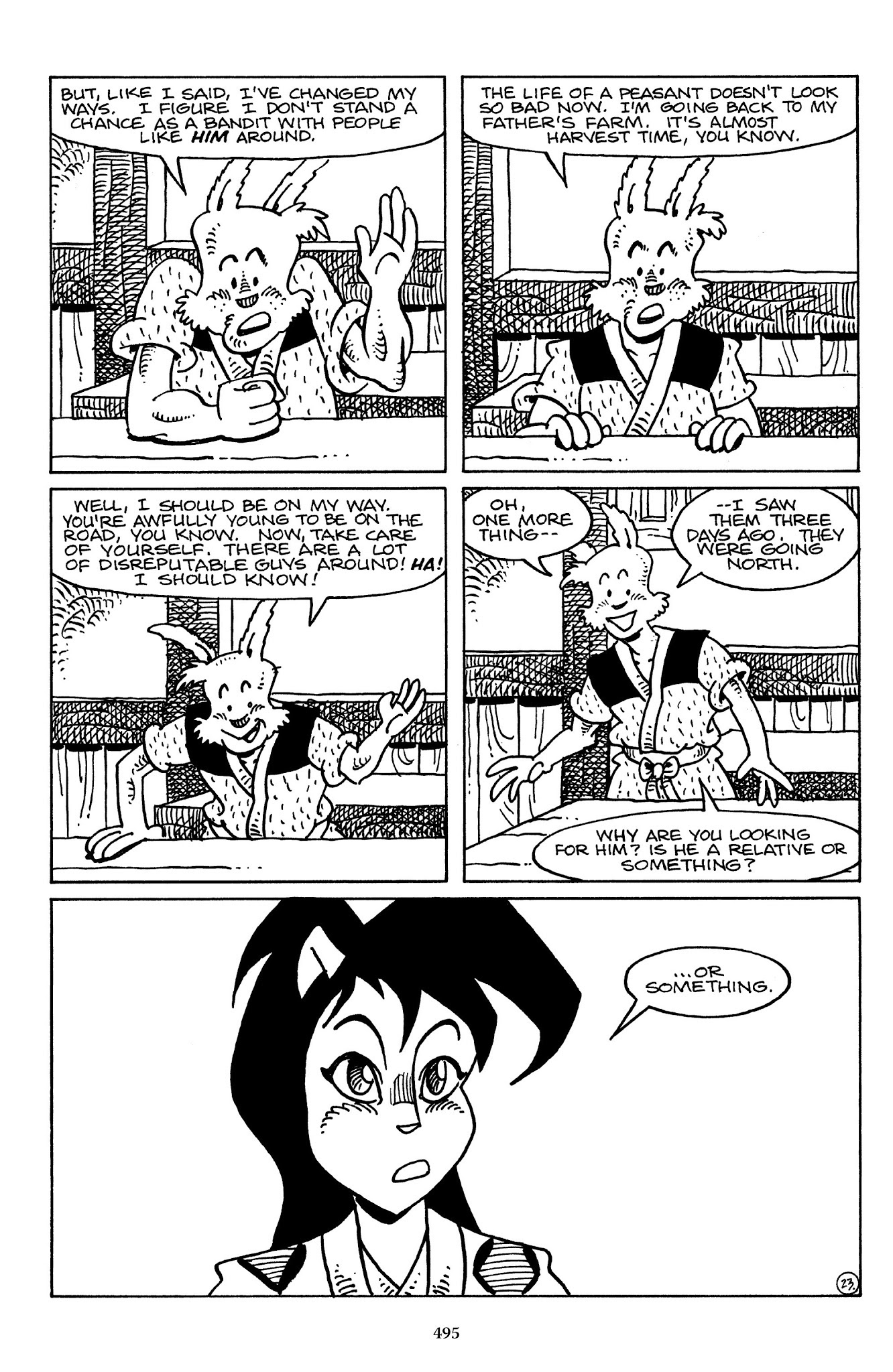I can't believe how evil Usagi is, encouraging a child to go learn swordfighting with a hermit in the mountain. Does he not get he's endangering him, setting him up to be possibly killed in the future in a fight?