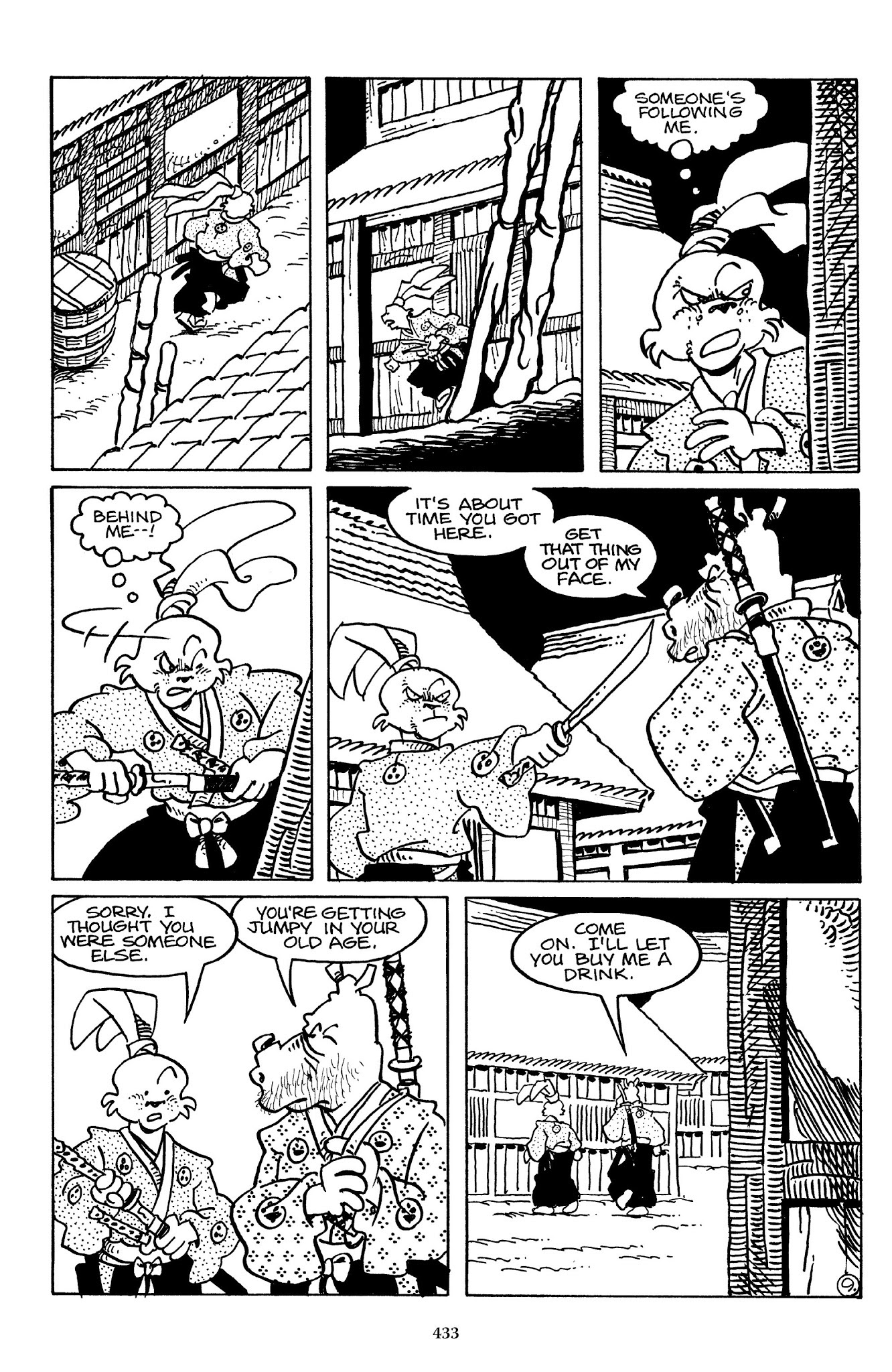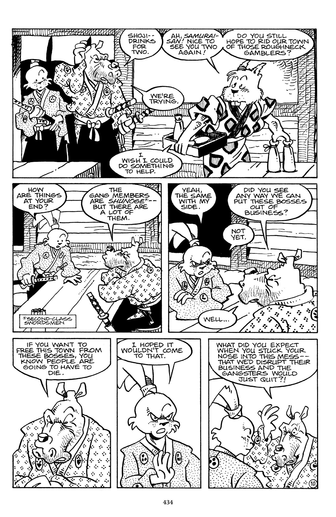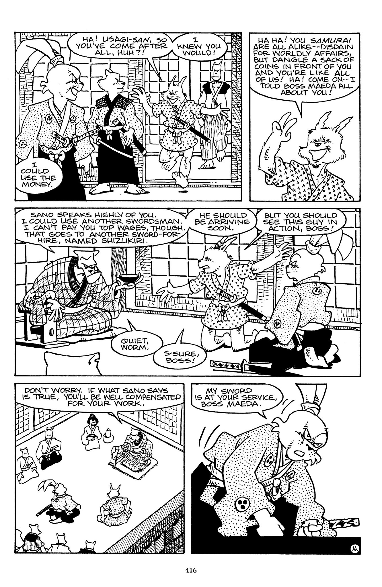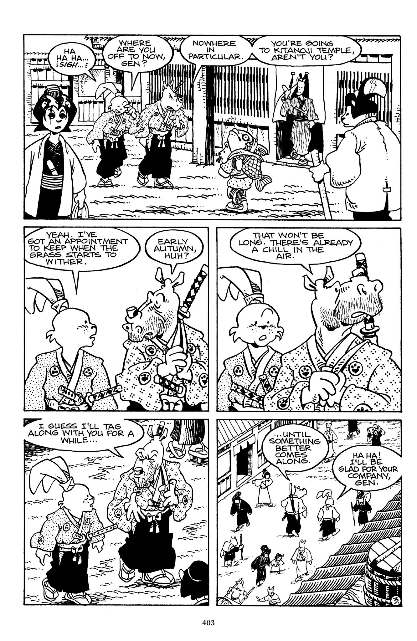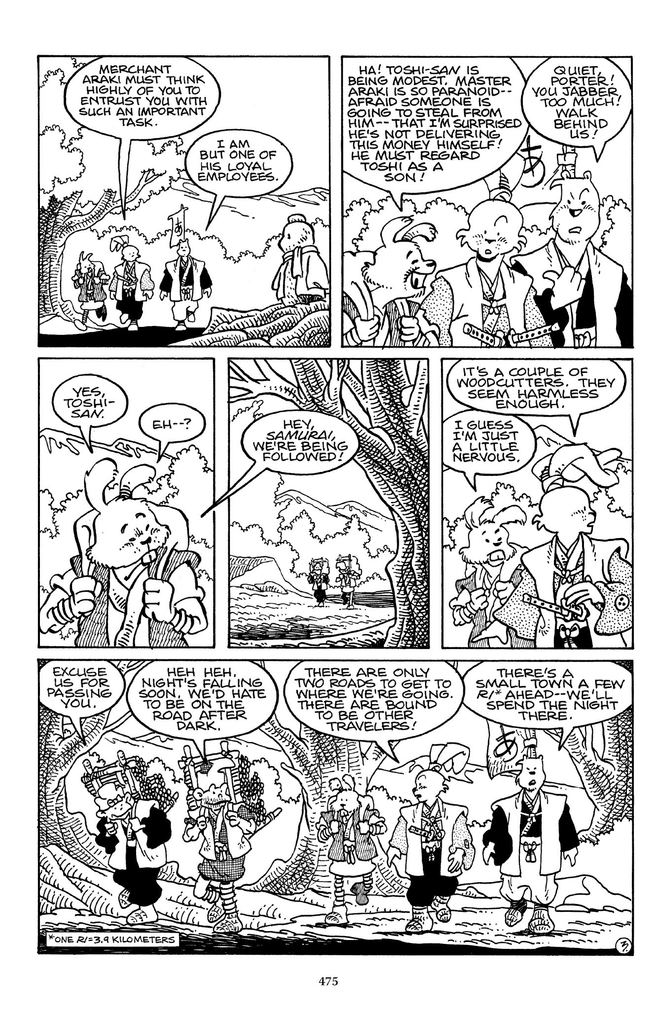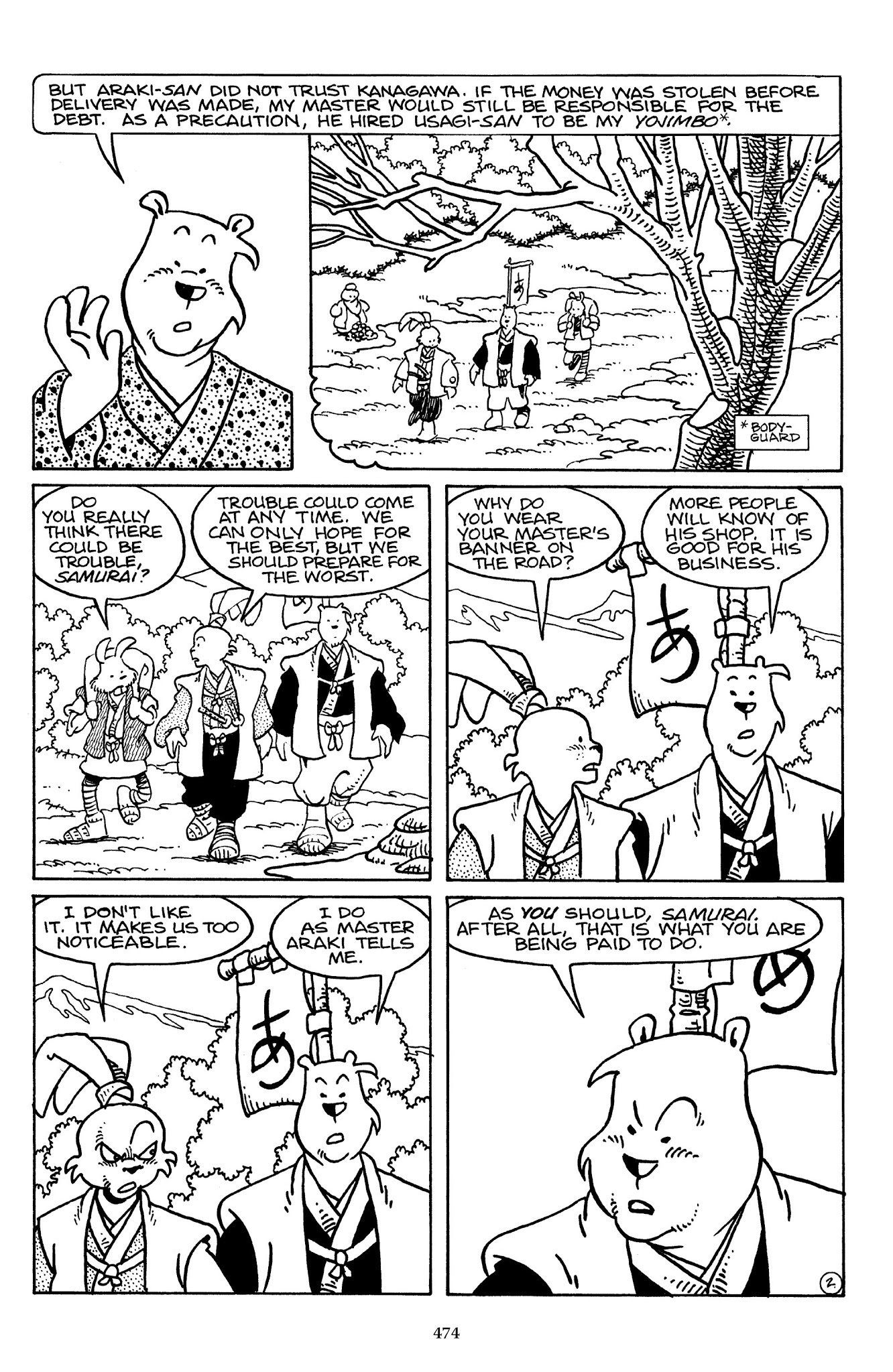 I can't believe how evil Usagi is, encouraging a child to go learn swordfighting with a hermit in the mountain. Does he not get he's endangering him, setting him up to be possibly killed in the future in a fight?