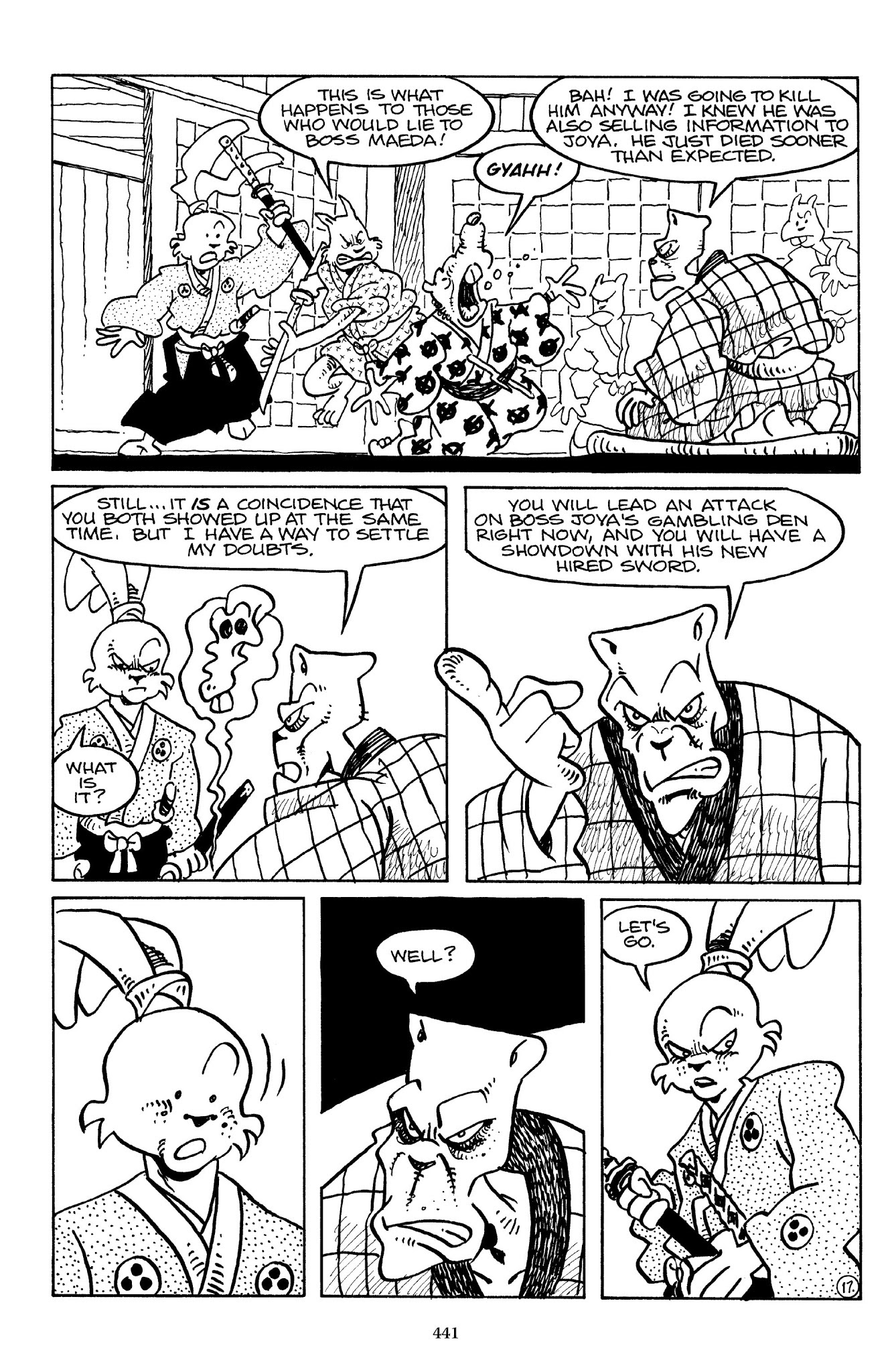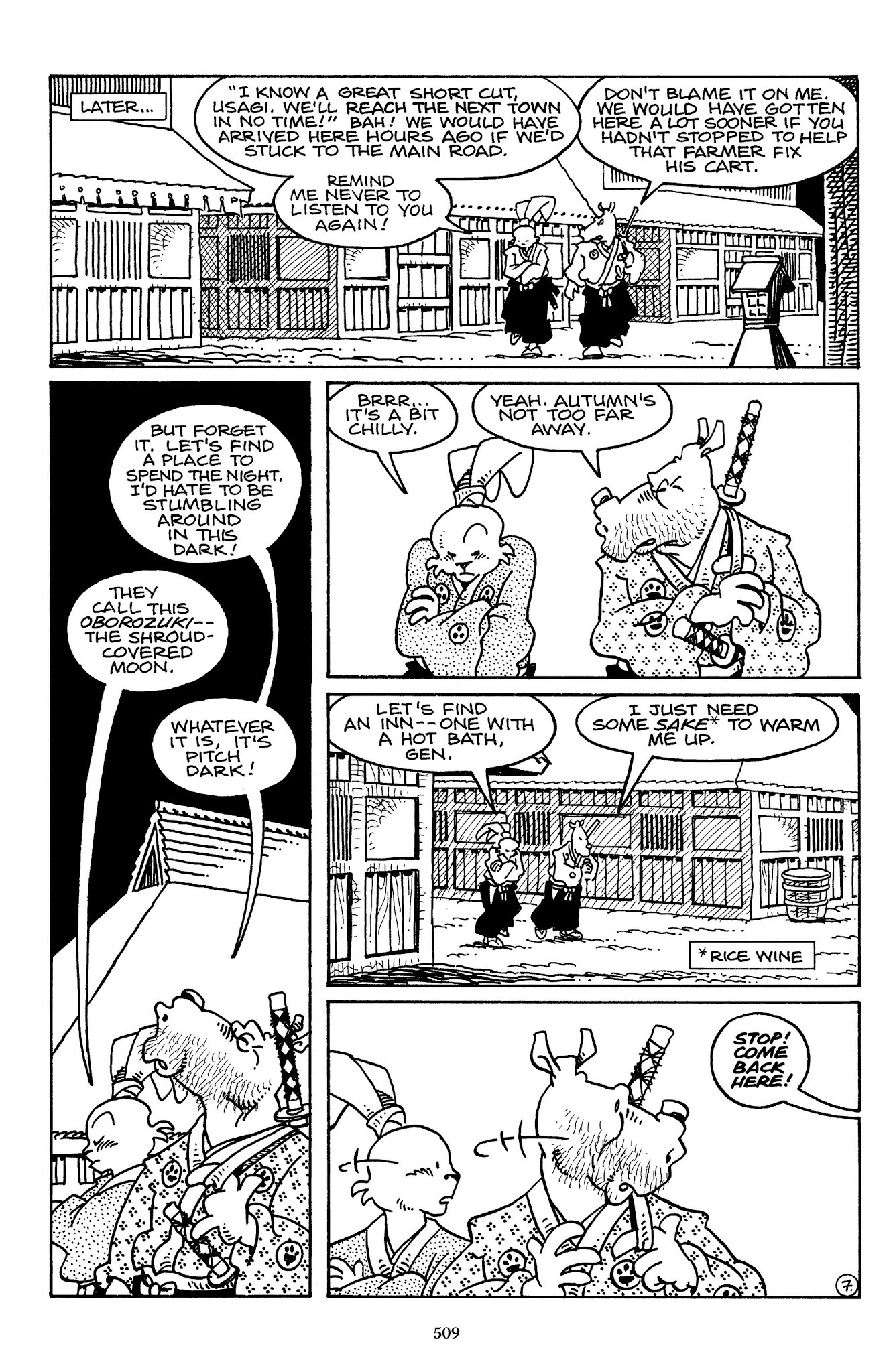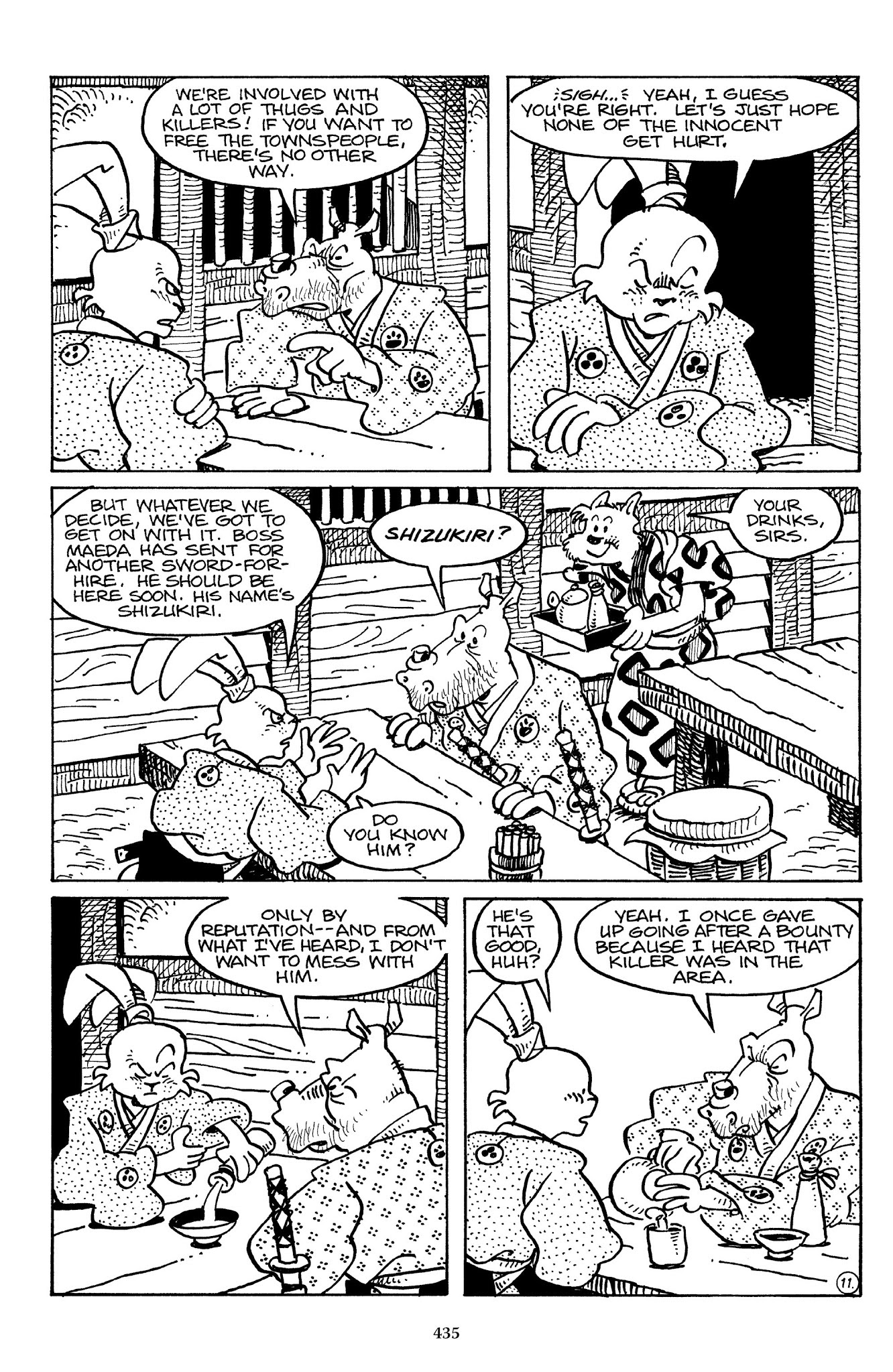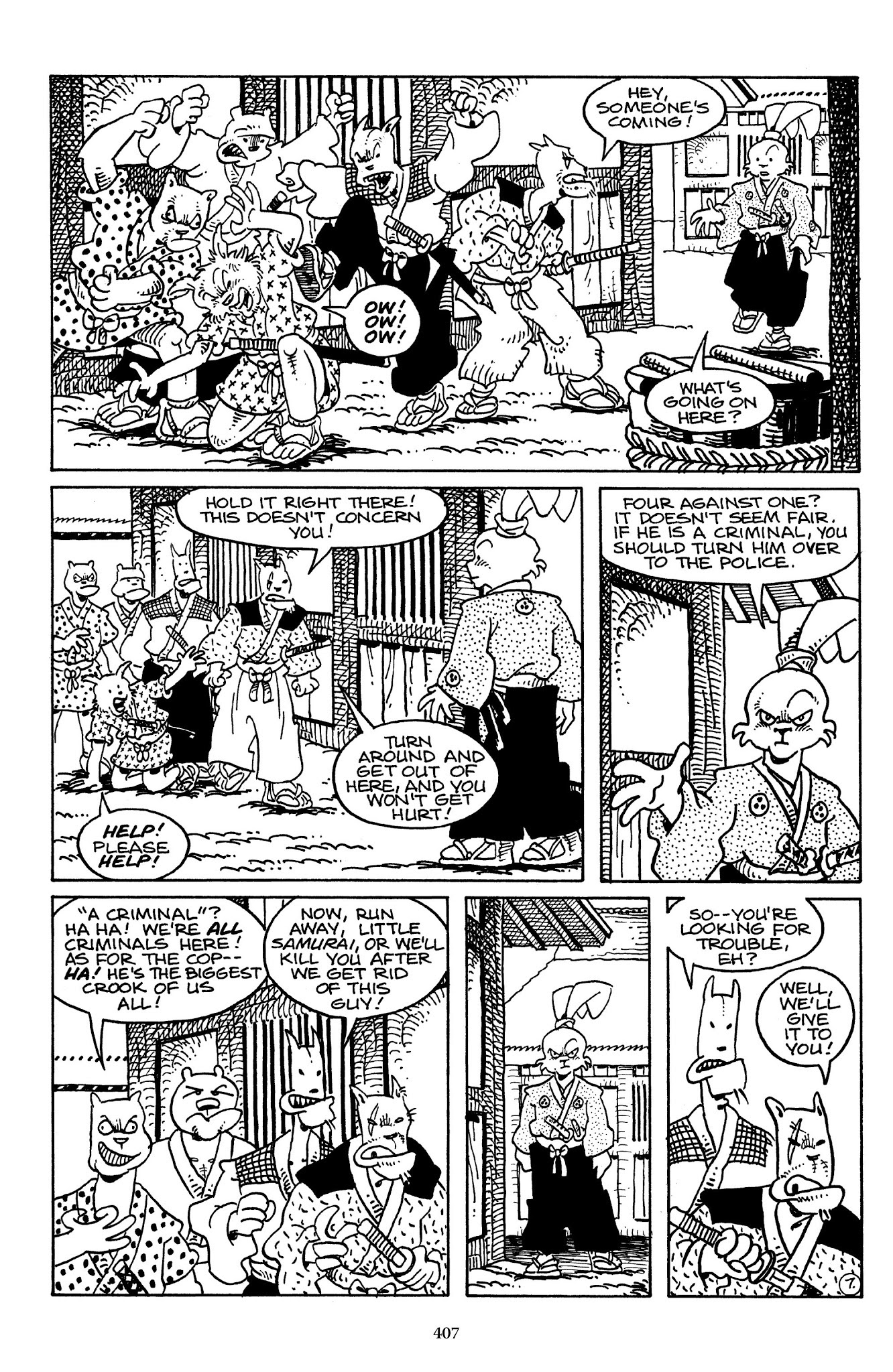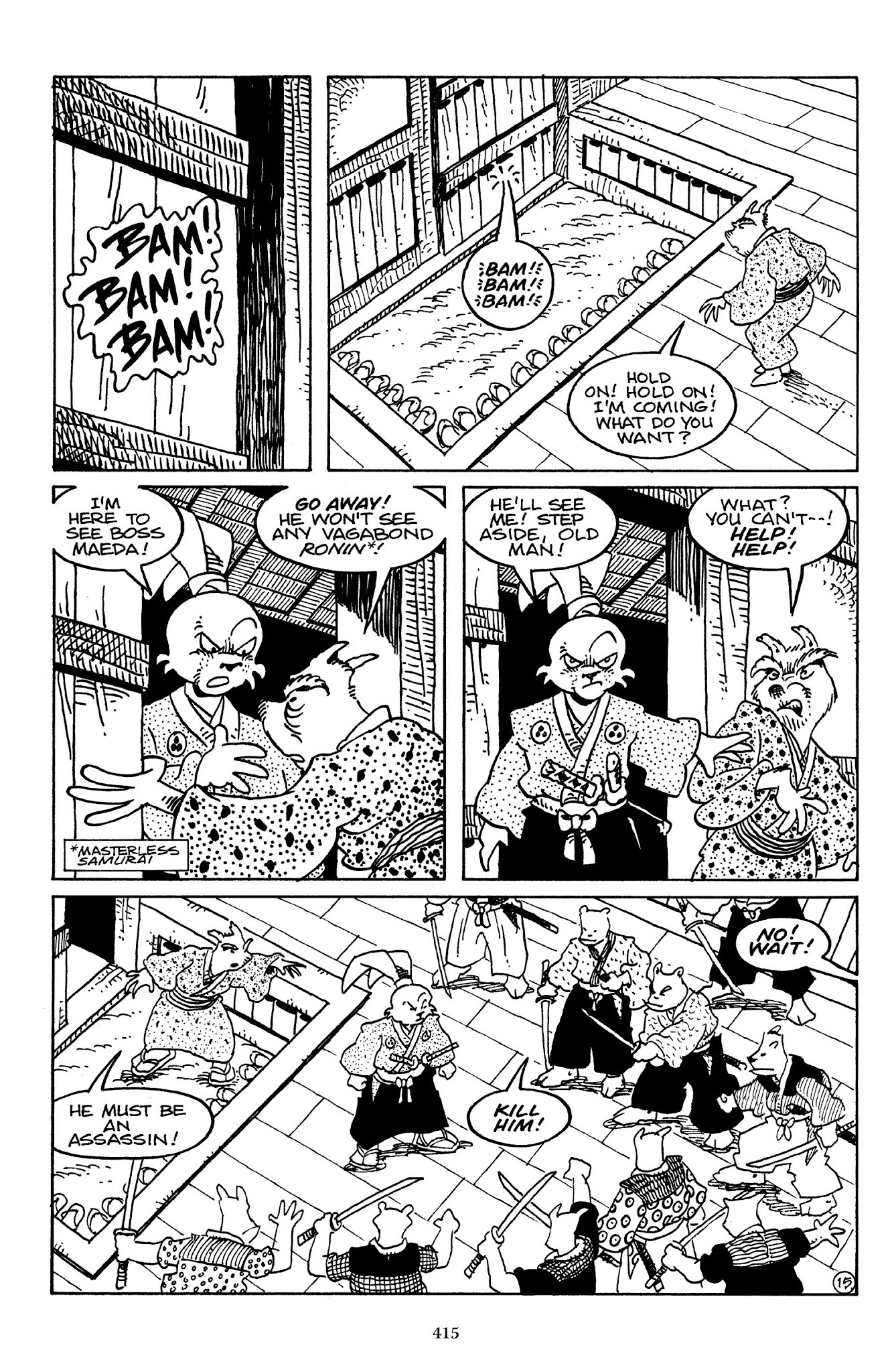 I can't believe how evil Usagi is, encouraging a child to go learn swordfighting with a hermit in the mountain. Does he not get he's endangering him, setting him up to be possibly killed in the future in a fight?