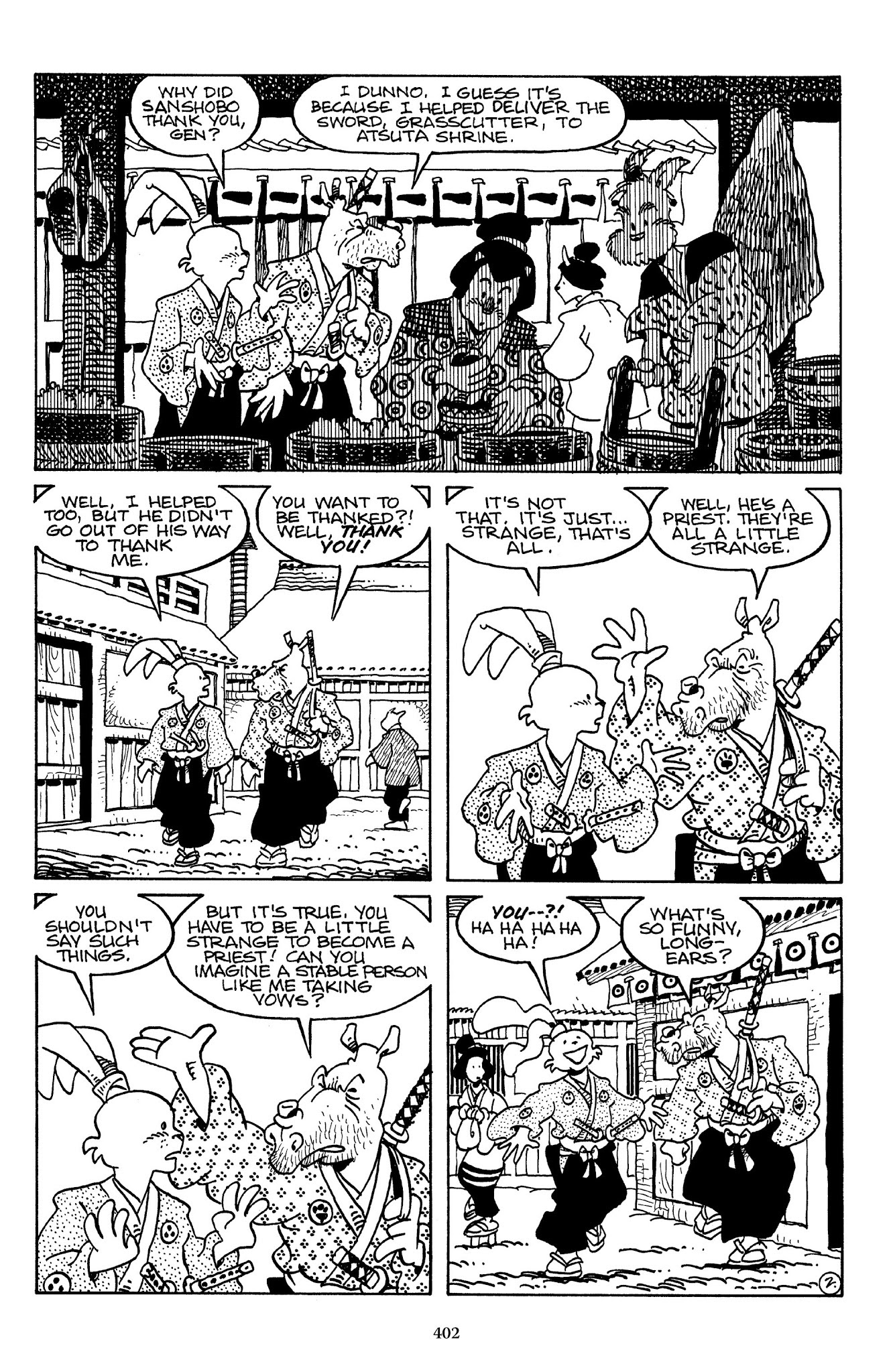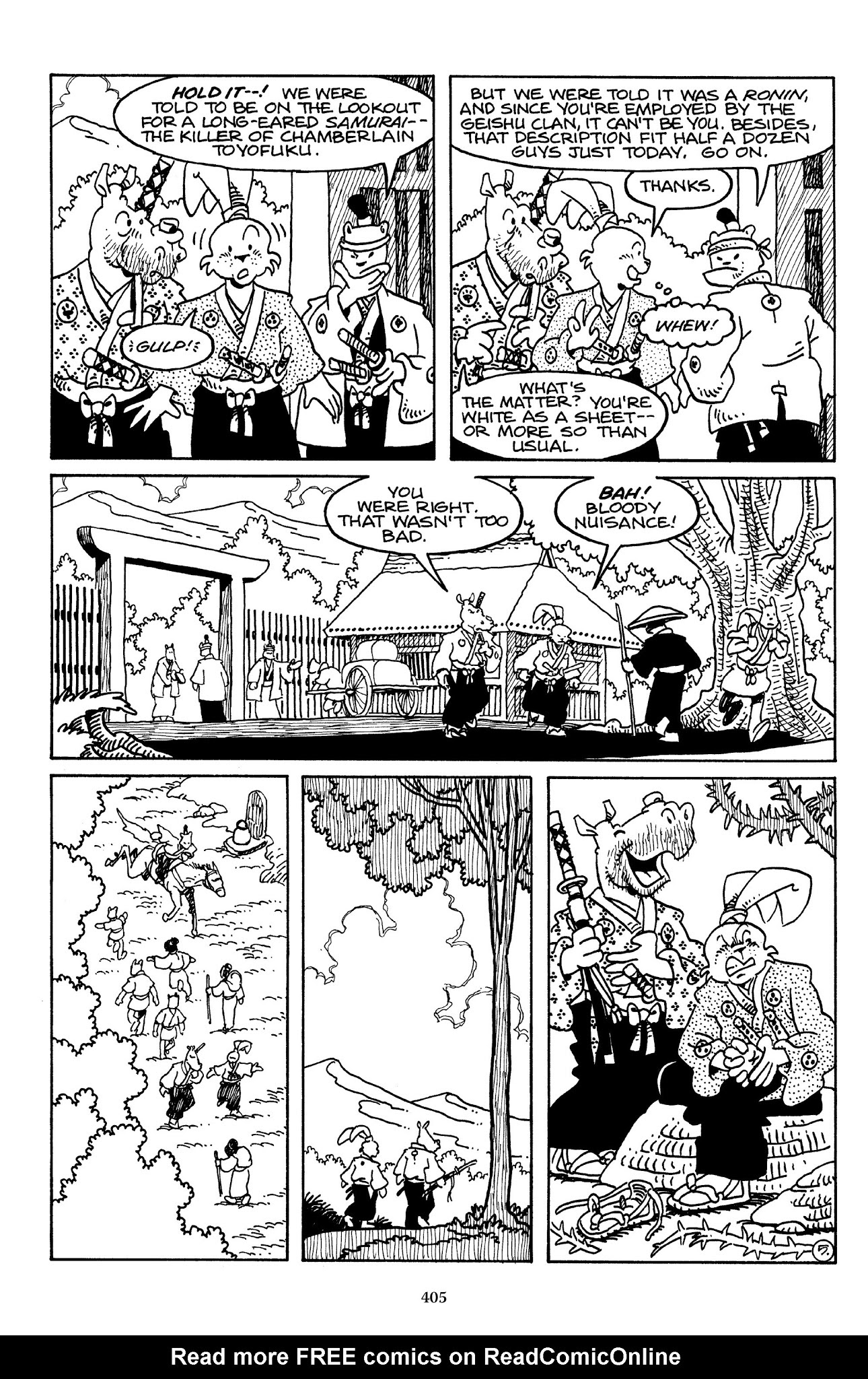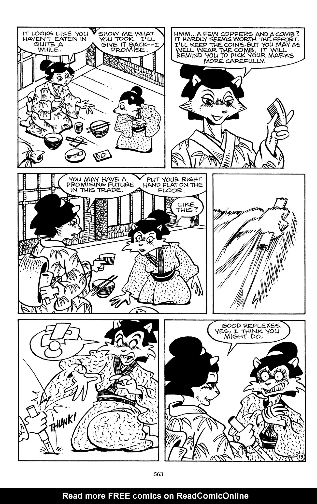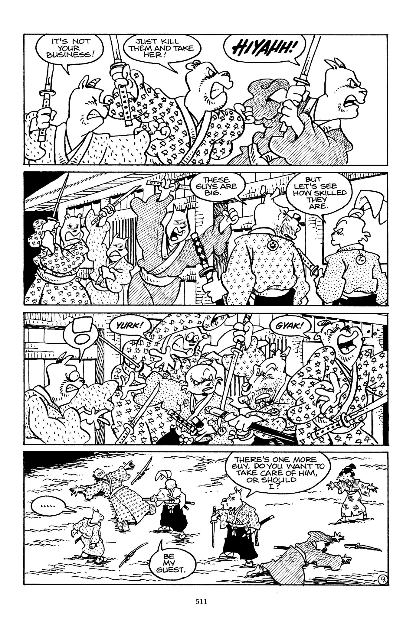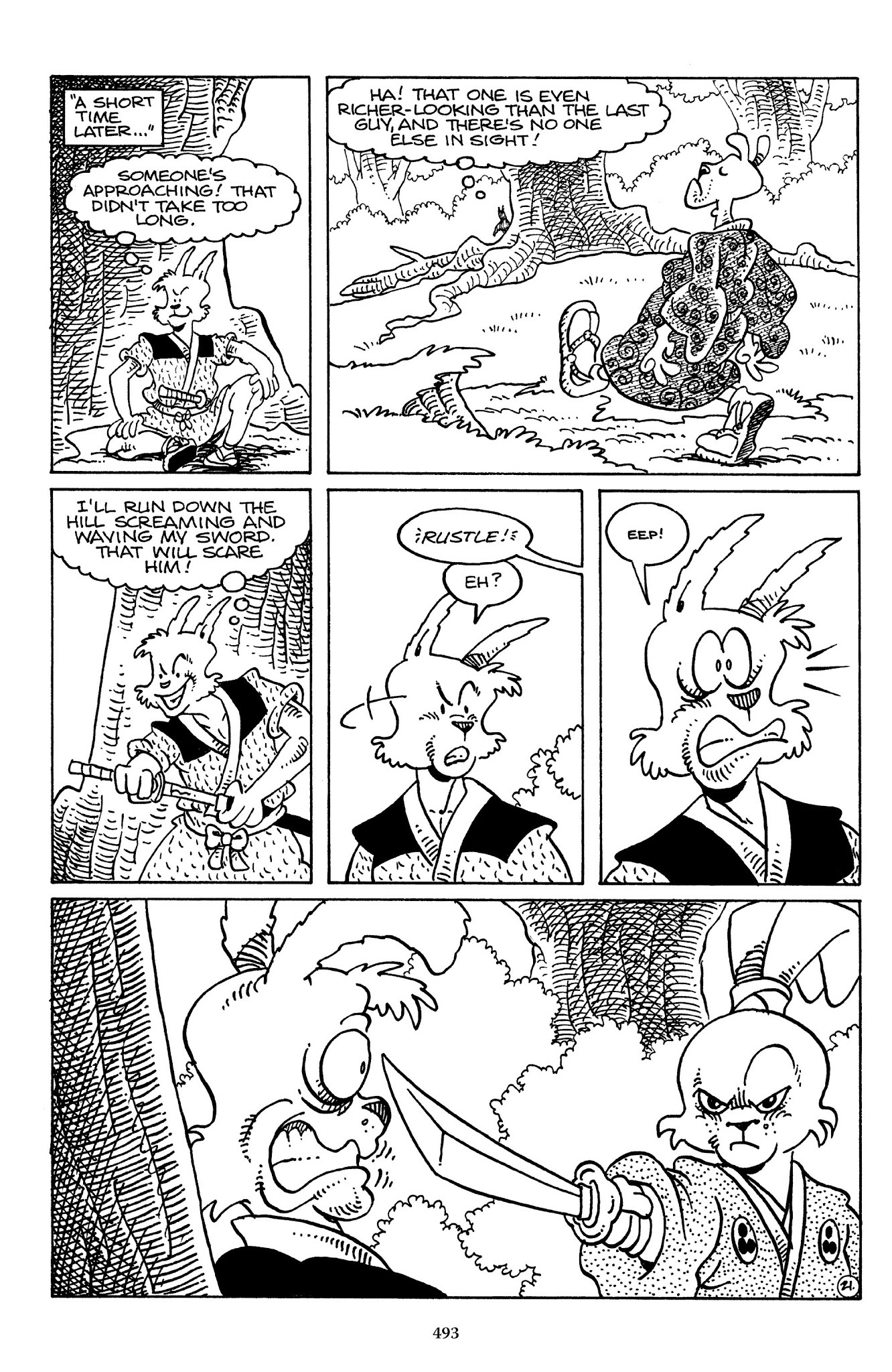 I can't believe how evil Usagi is, encouraging a child to go learn swordfighting with a hermit in the mountain. Does he not get he's endangering him, setting him up to be possibly killed in the future in a fight?