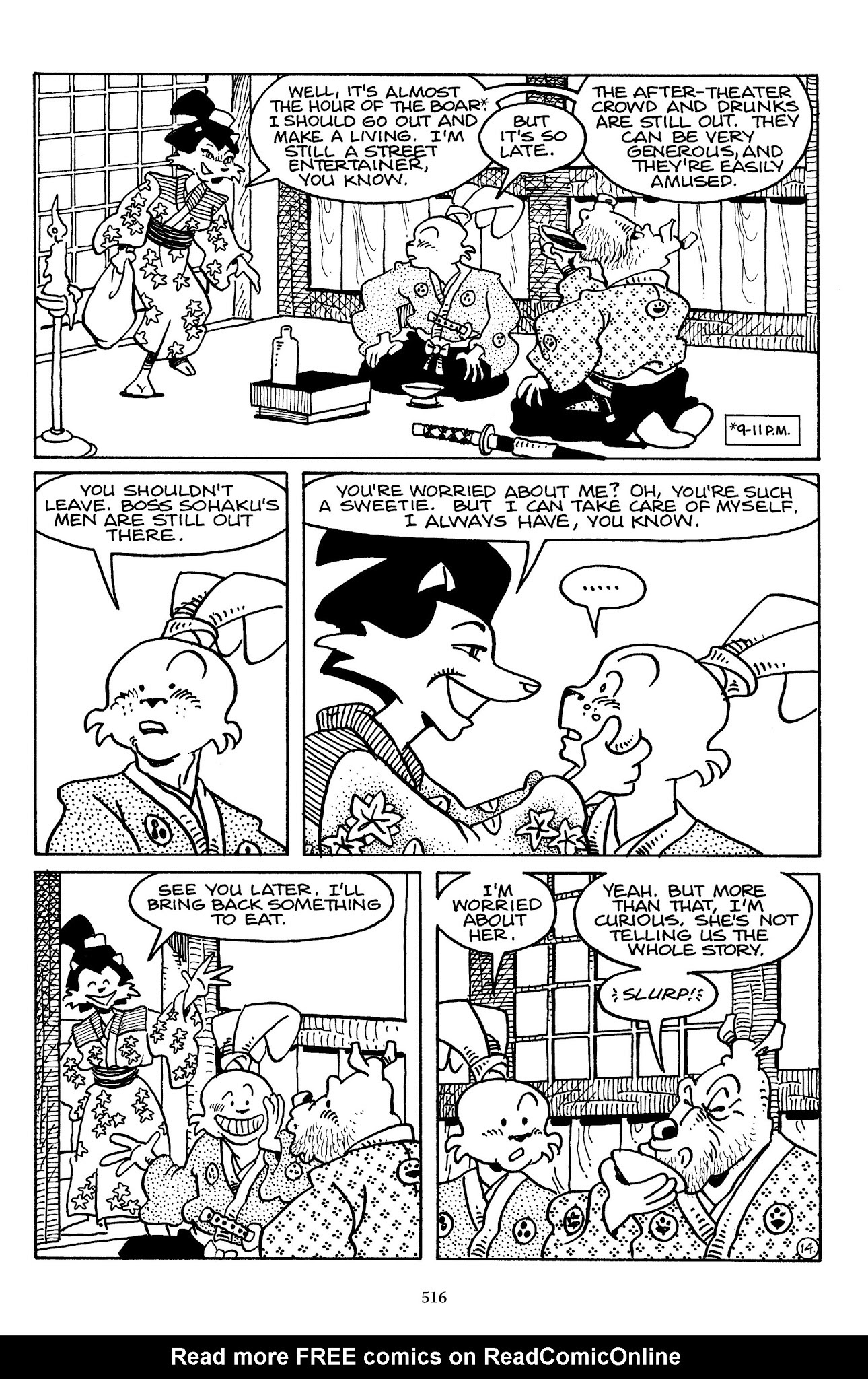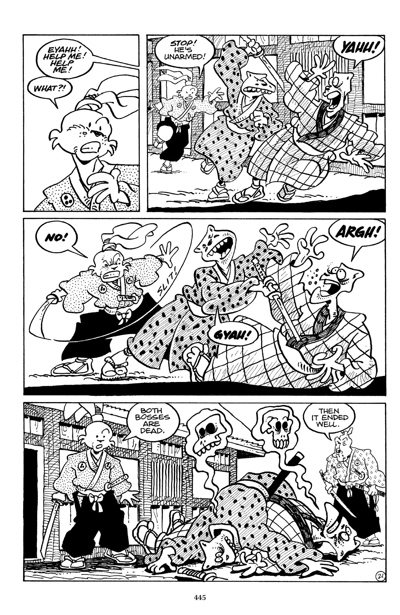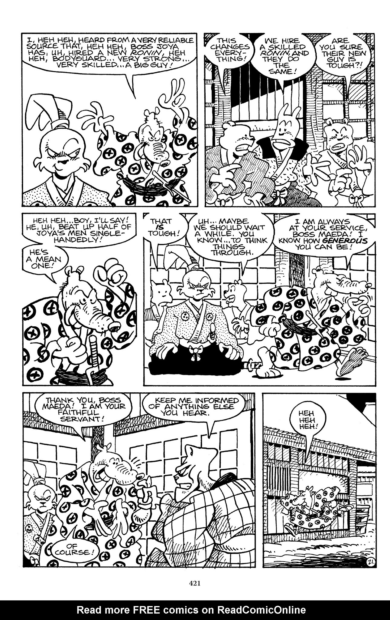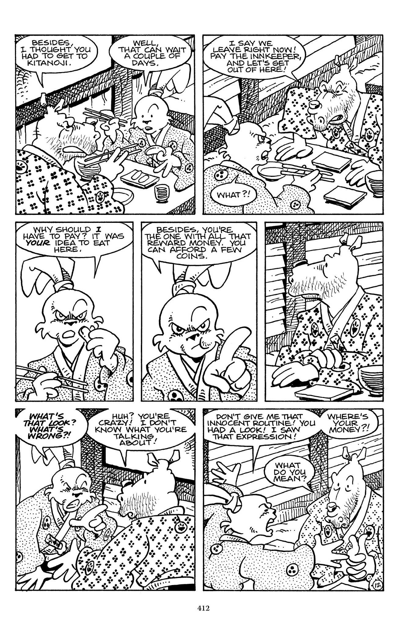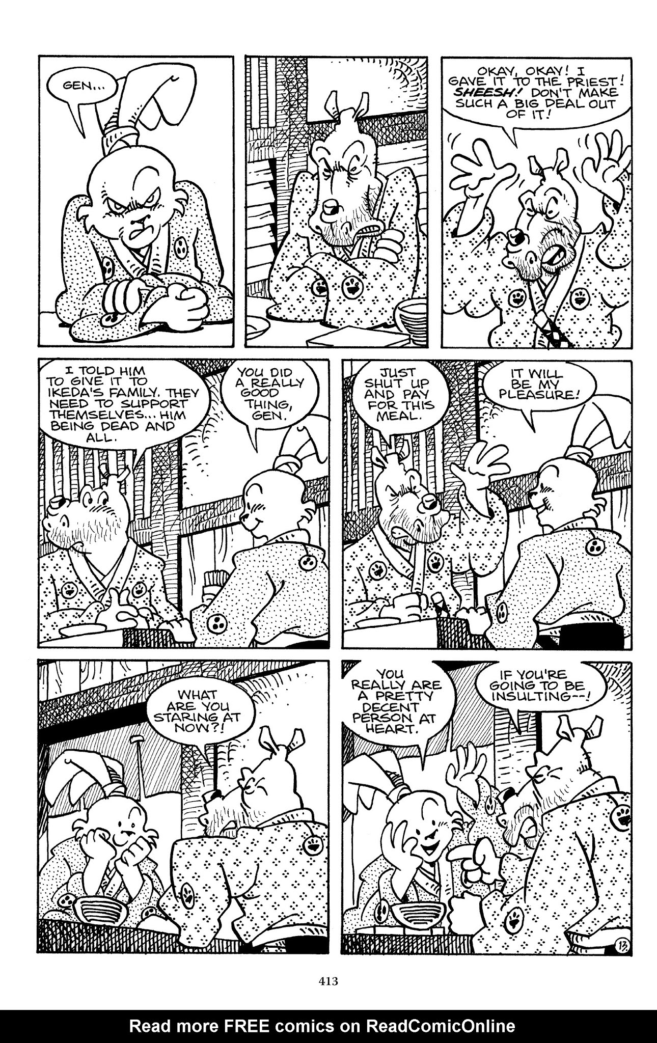 I can't believe how evil Usagi is, encouraging a child to go learn swordfighting with a hermit in the mountain. Does he not get he's endangering him, setting him up to be possibly killed in the future in a fight?