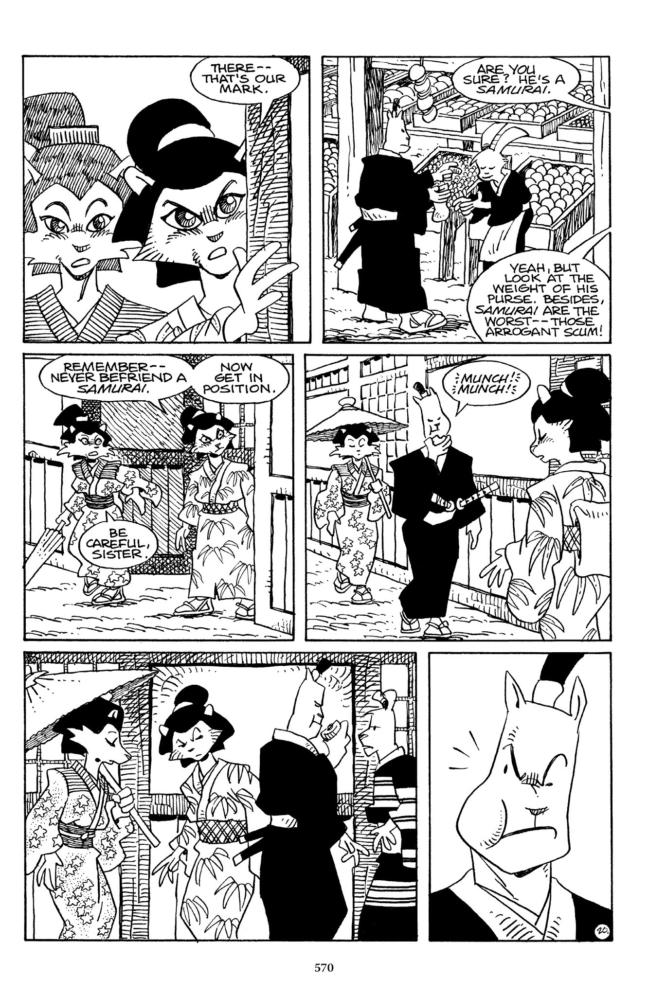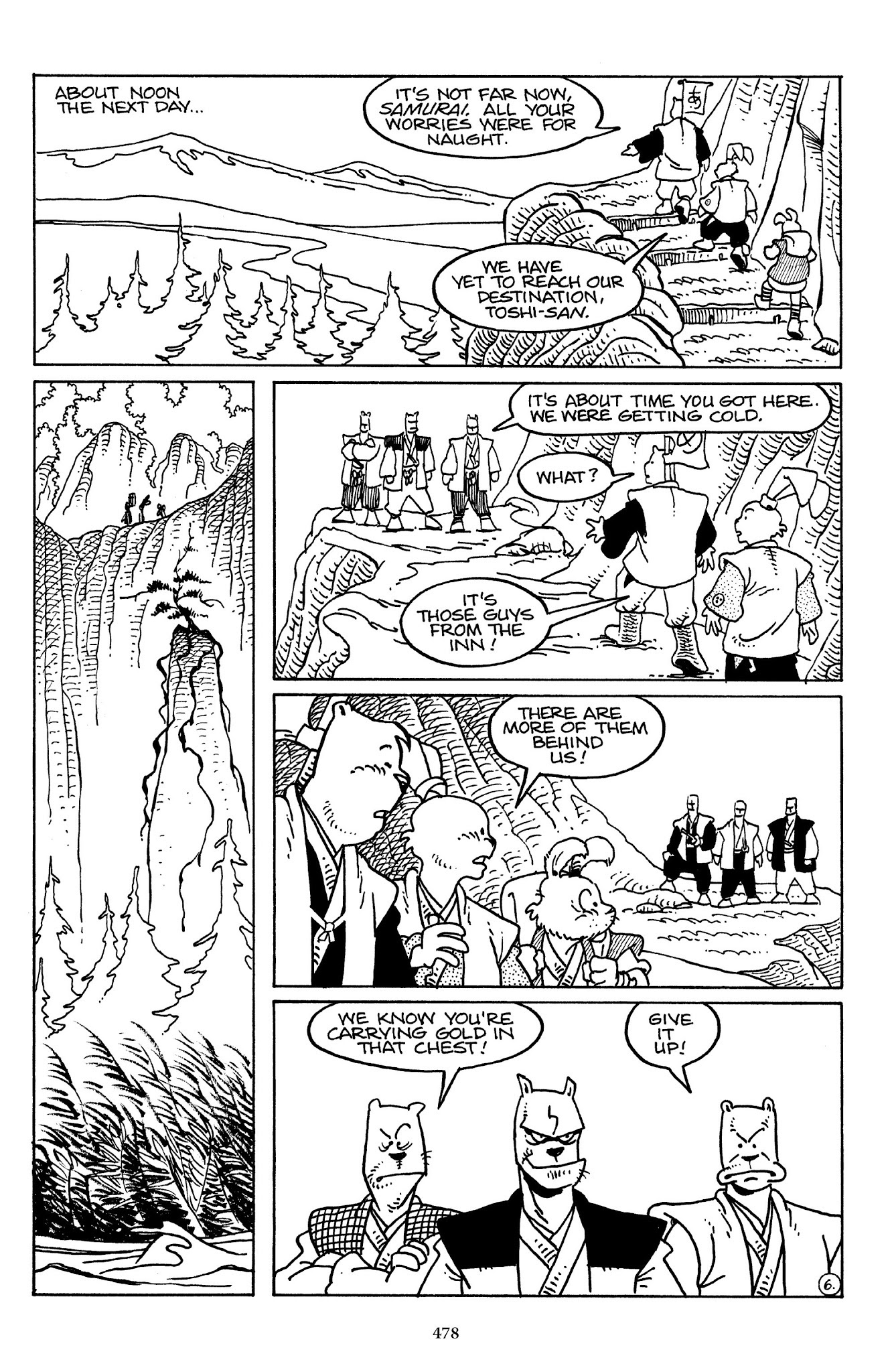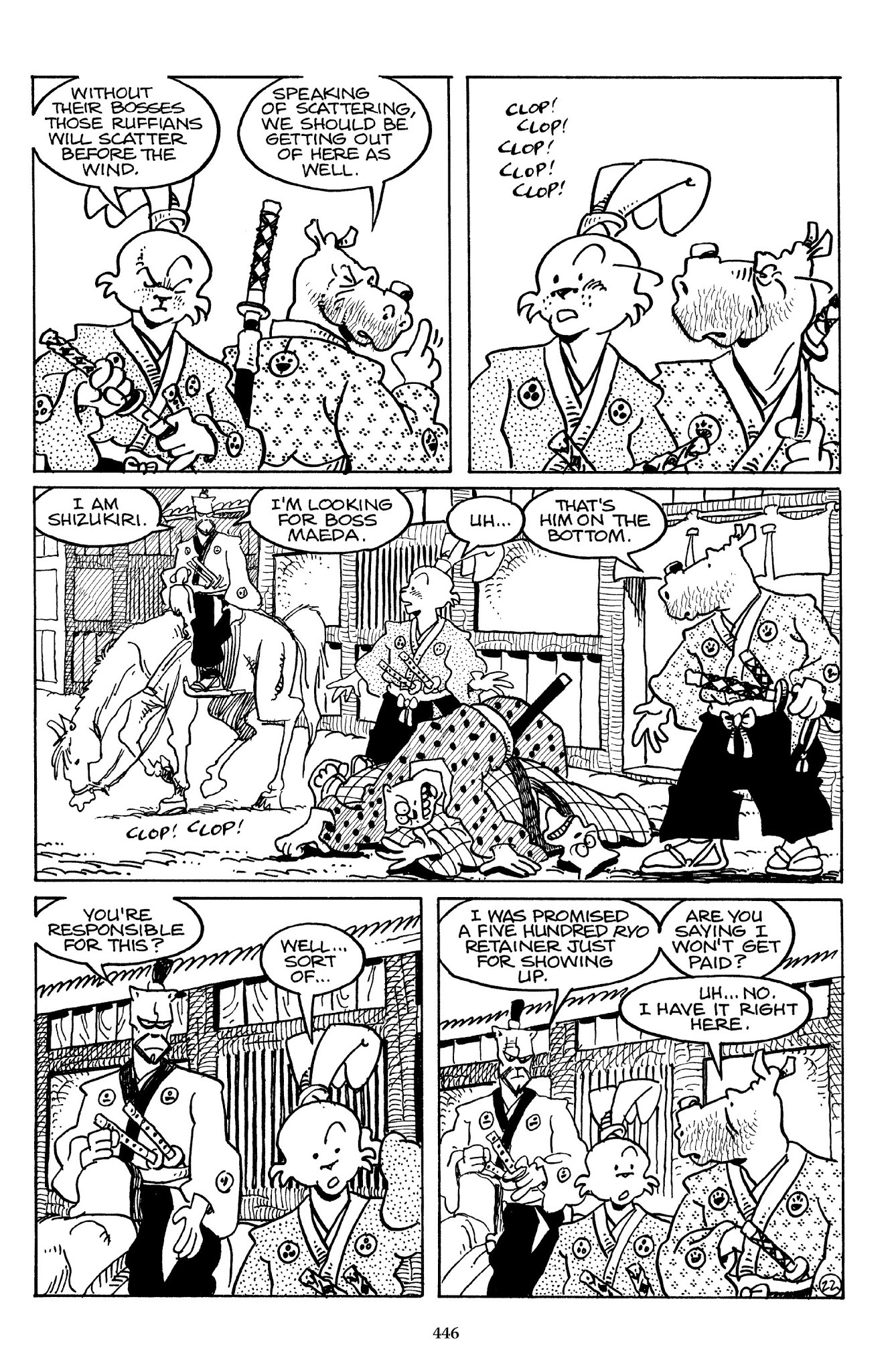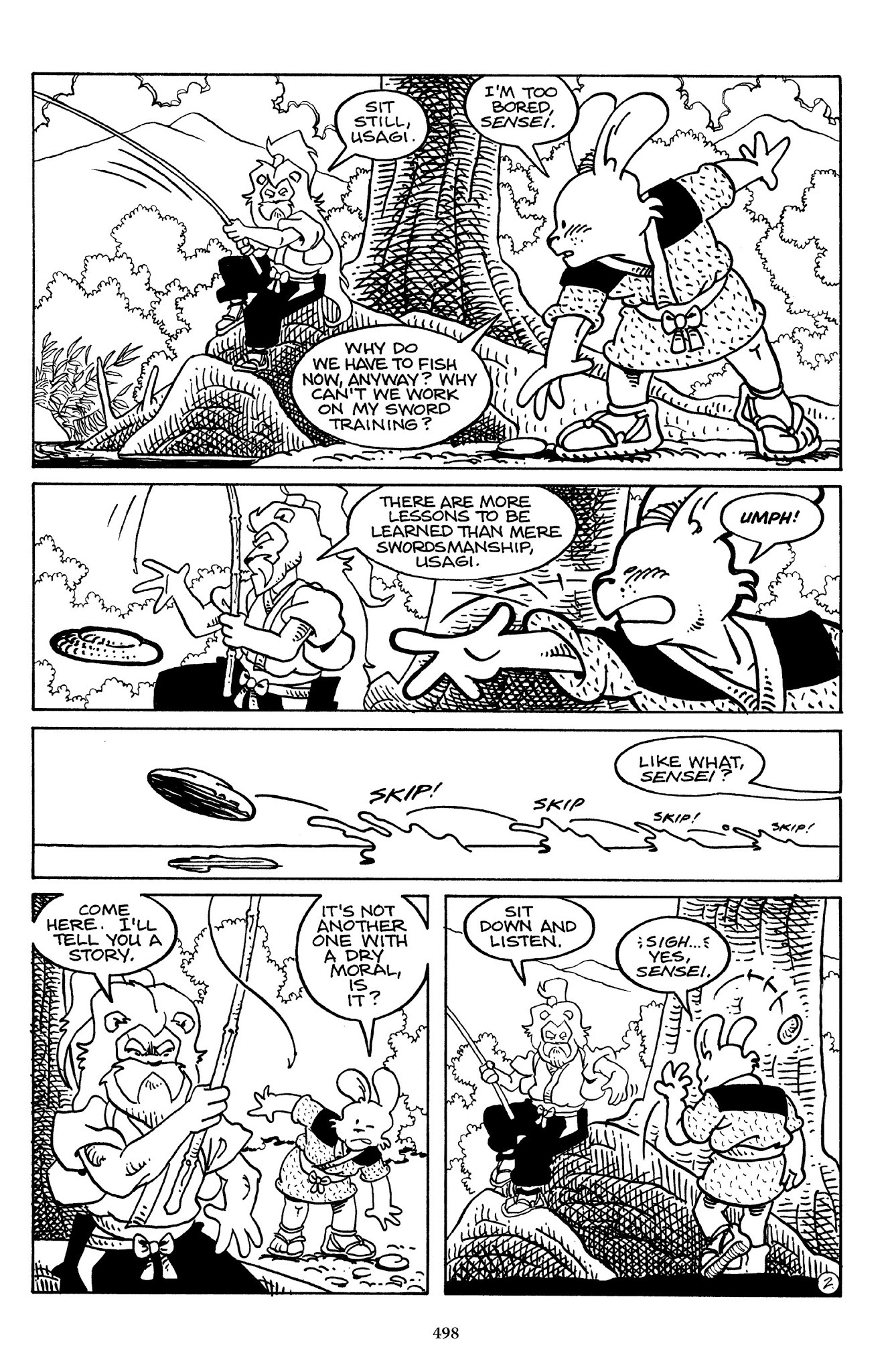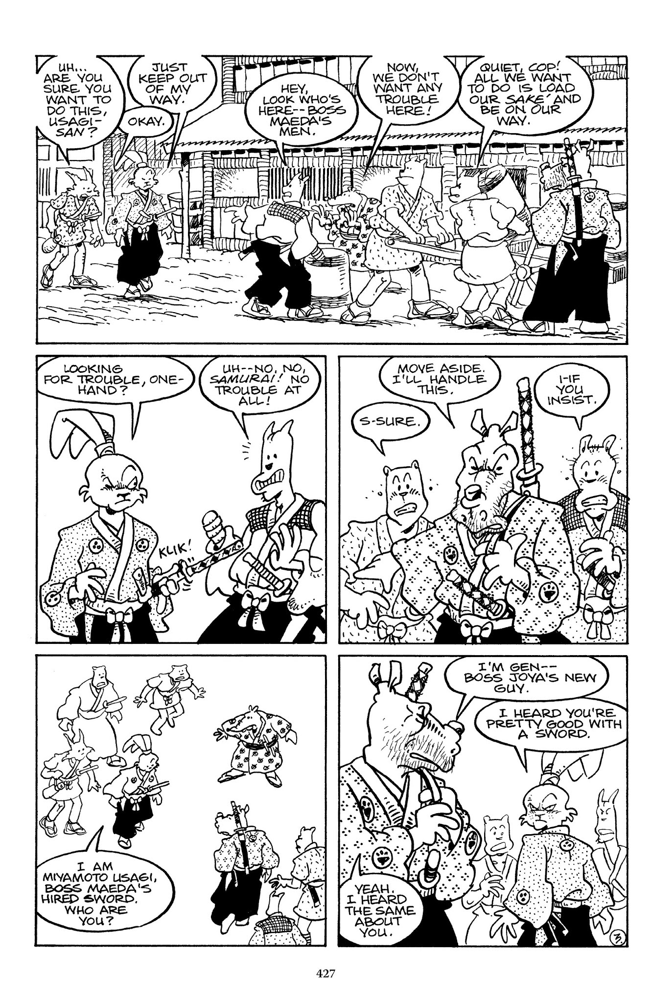 I can't believe how evil Usagi is, encouraging a child to go learn swordfighting with a hermit in the mountain. Does he not get he's endangering him, setting him up to be possibly killed in the future in a fight?