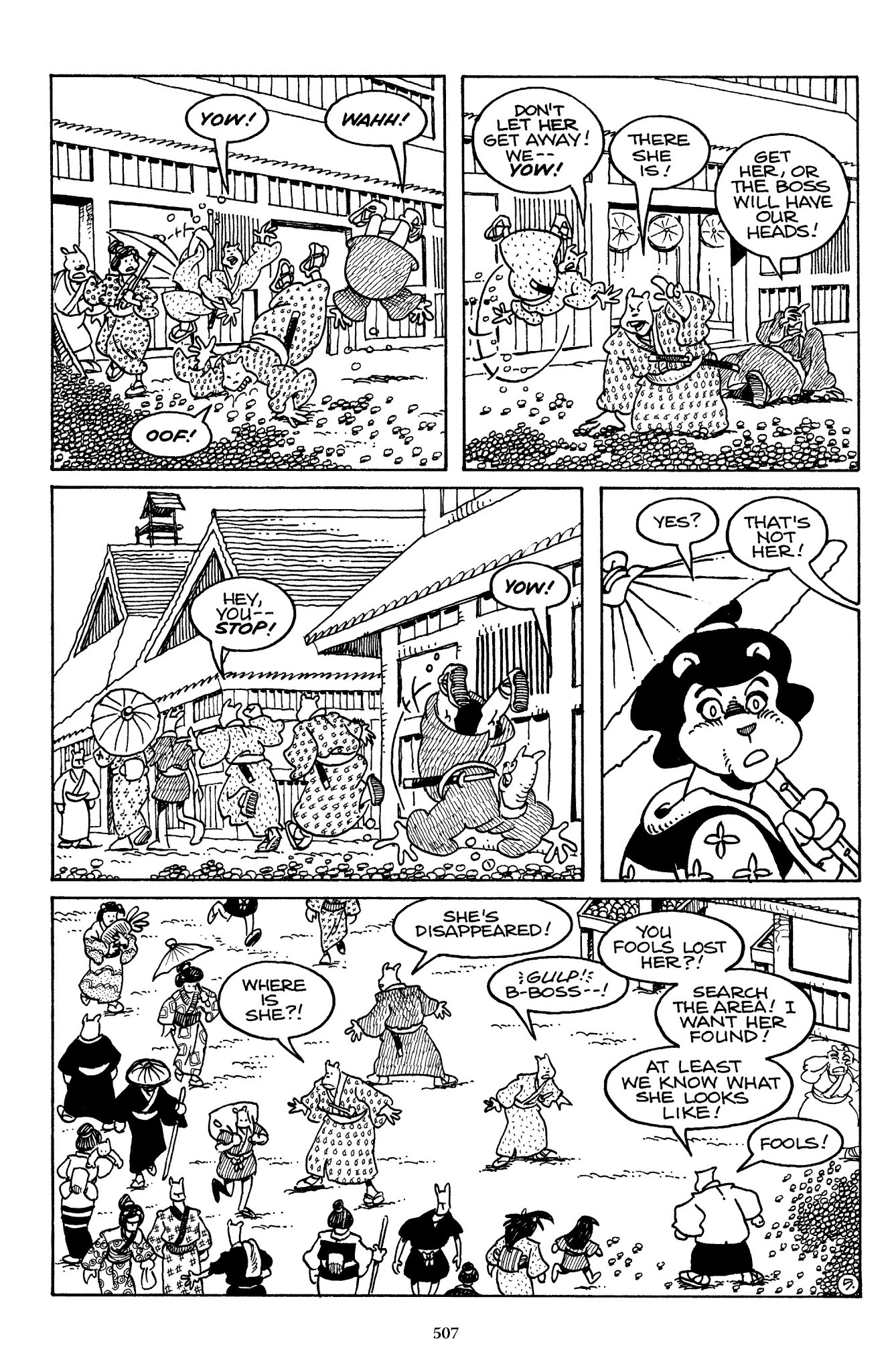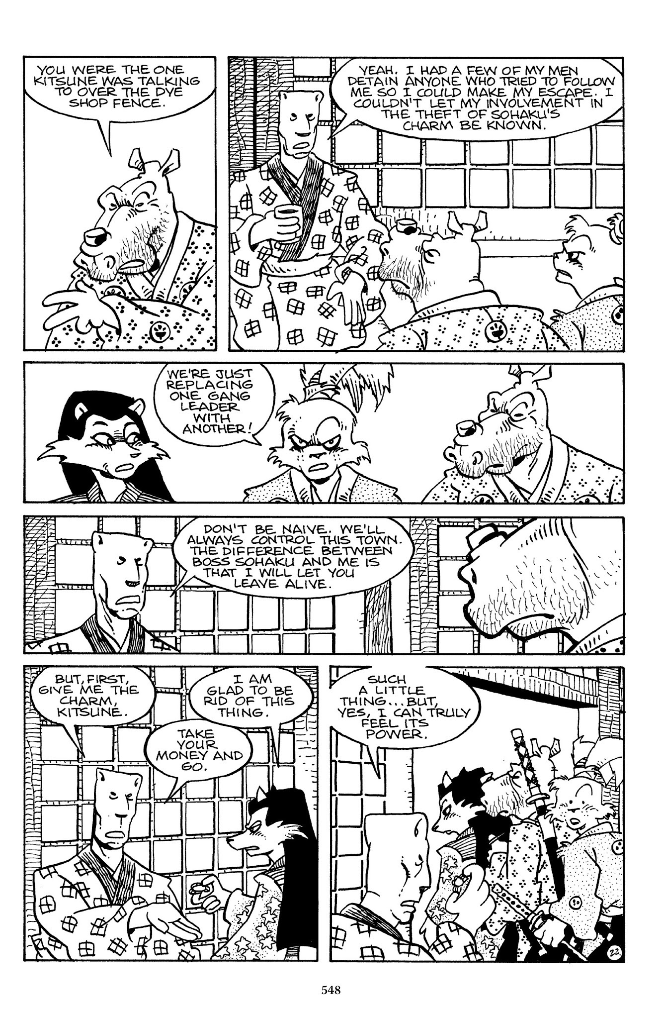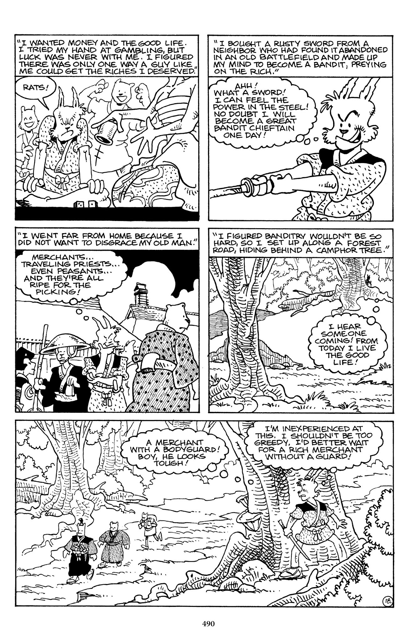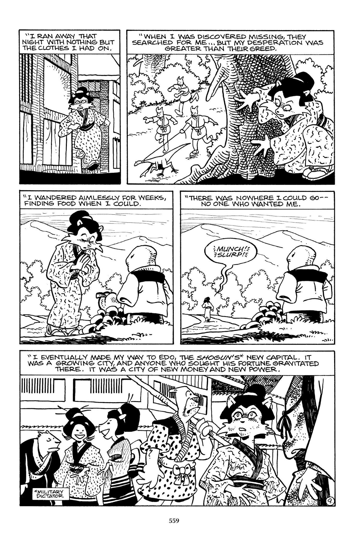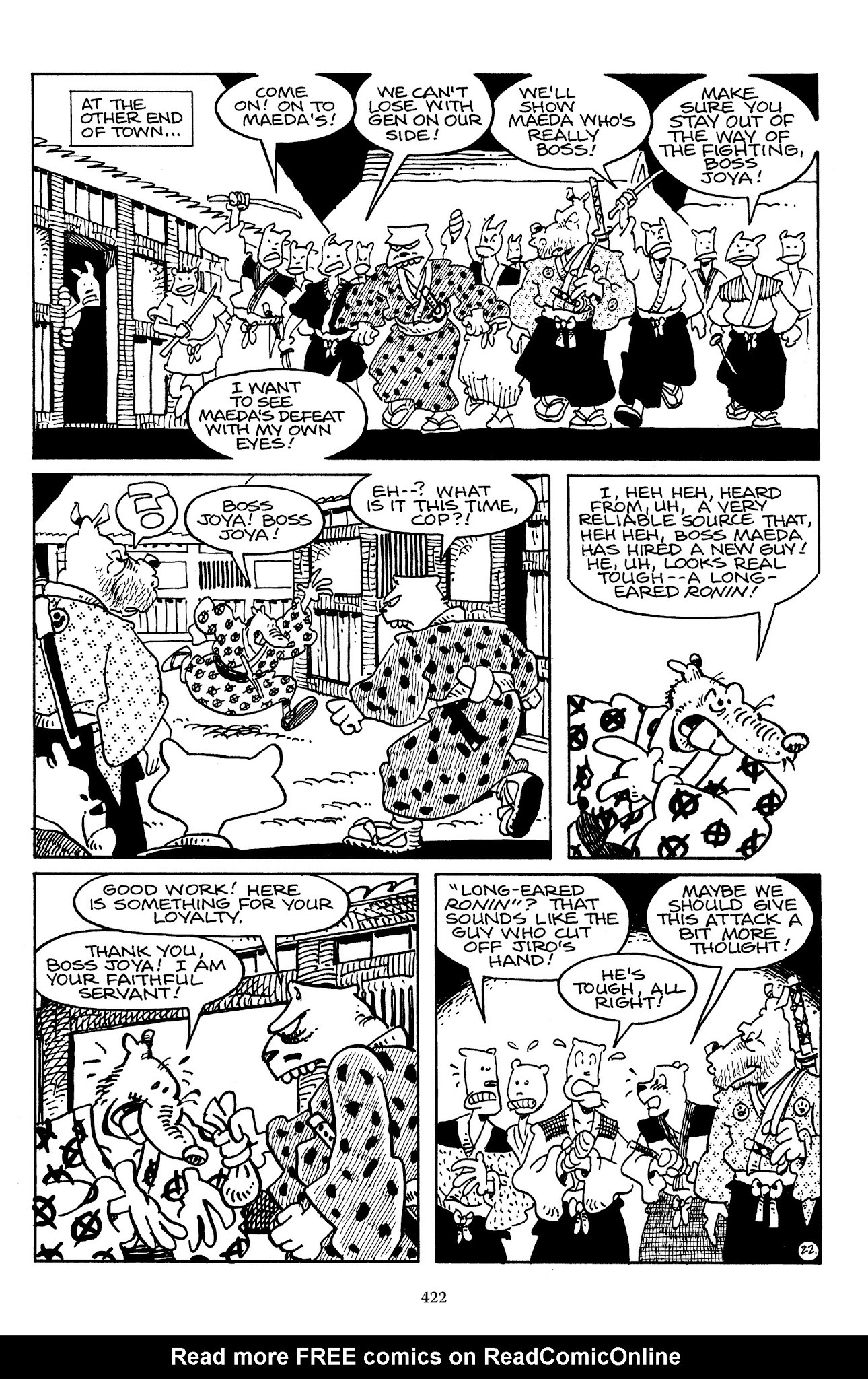I can't believe how evil Usagi is, encouraging a child to go learn swordfighting with a hermit in the mountain. Does he not get he's endangering him, setting him up to be possibly killed in the future in a fight?