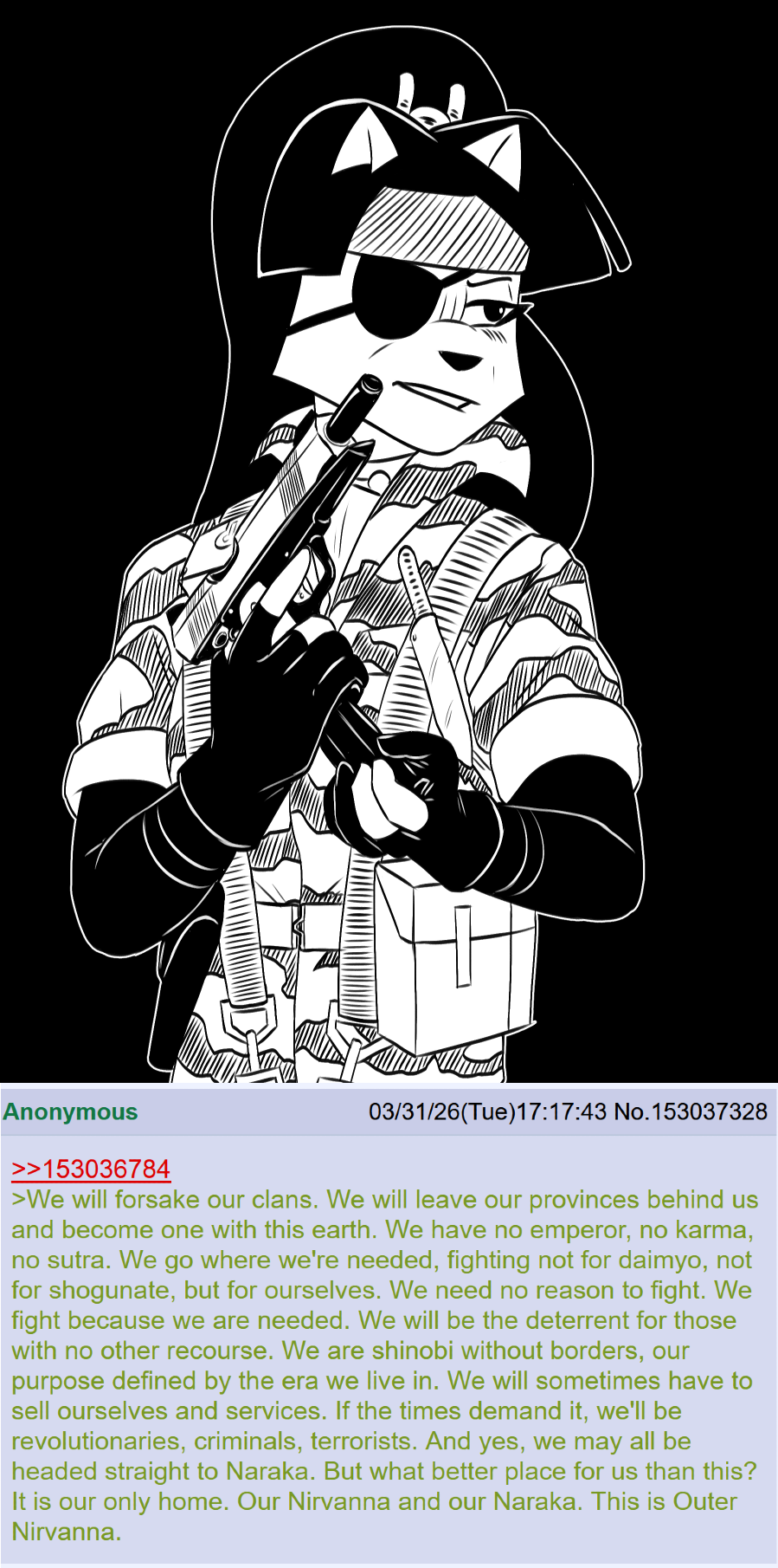 >>153037328What makes this so fitting is that this seems to the path that Chizu wanted to reform the neko ninja into before her plans were cut short by Kagemaru's coup.