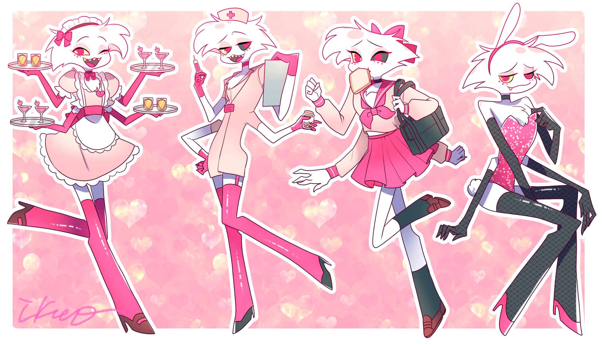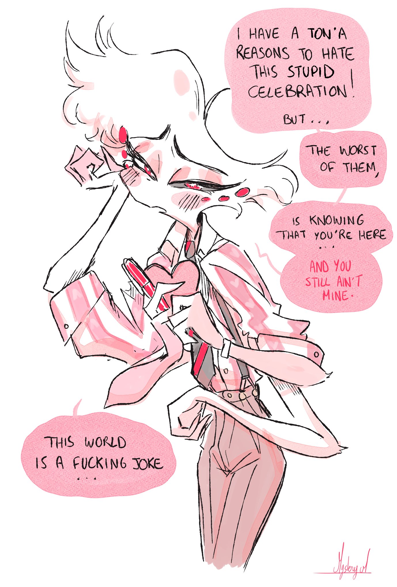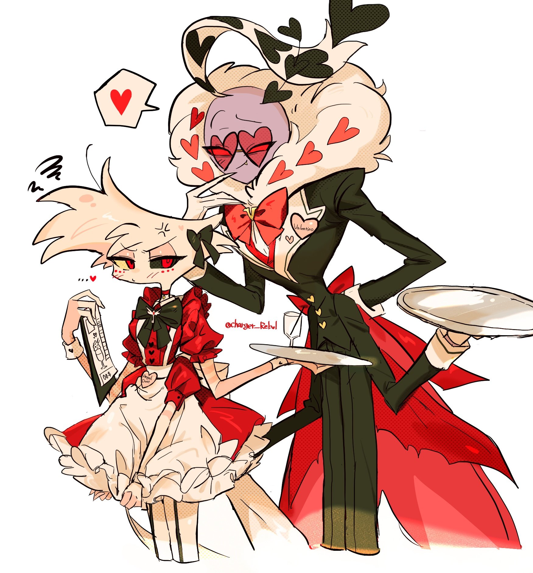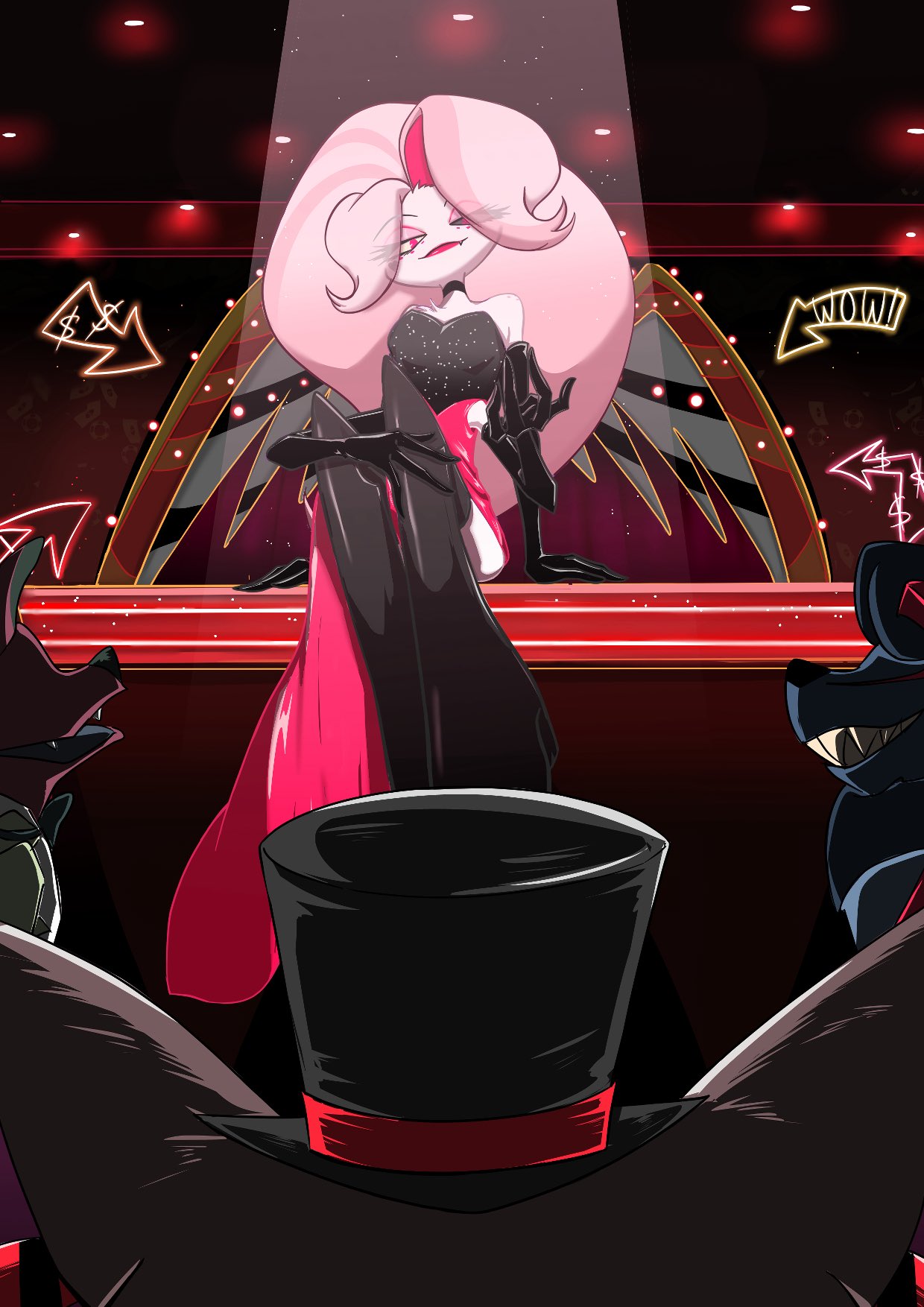 >"AD, why do you always have to crossdress?">"What? It's leanin' into my brand of raw sexual powah.">"Yeah, but don't you get tired of the impracticality or playing the prison bicycle?">"First, I ain't a bicycle. I charge by the hour. Second, naw.">Angel Dust proceeds to pull at least two Tommy Guns (and a couple of Derringers) out of his chest fluff before gunning down some conmen selling bootleg Angel Dust merch.