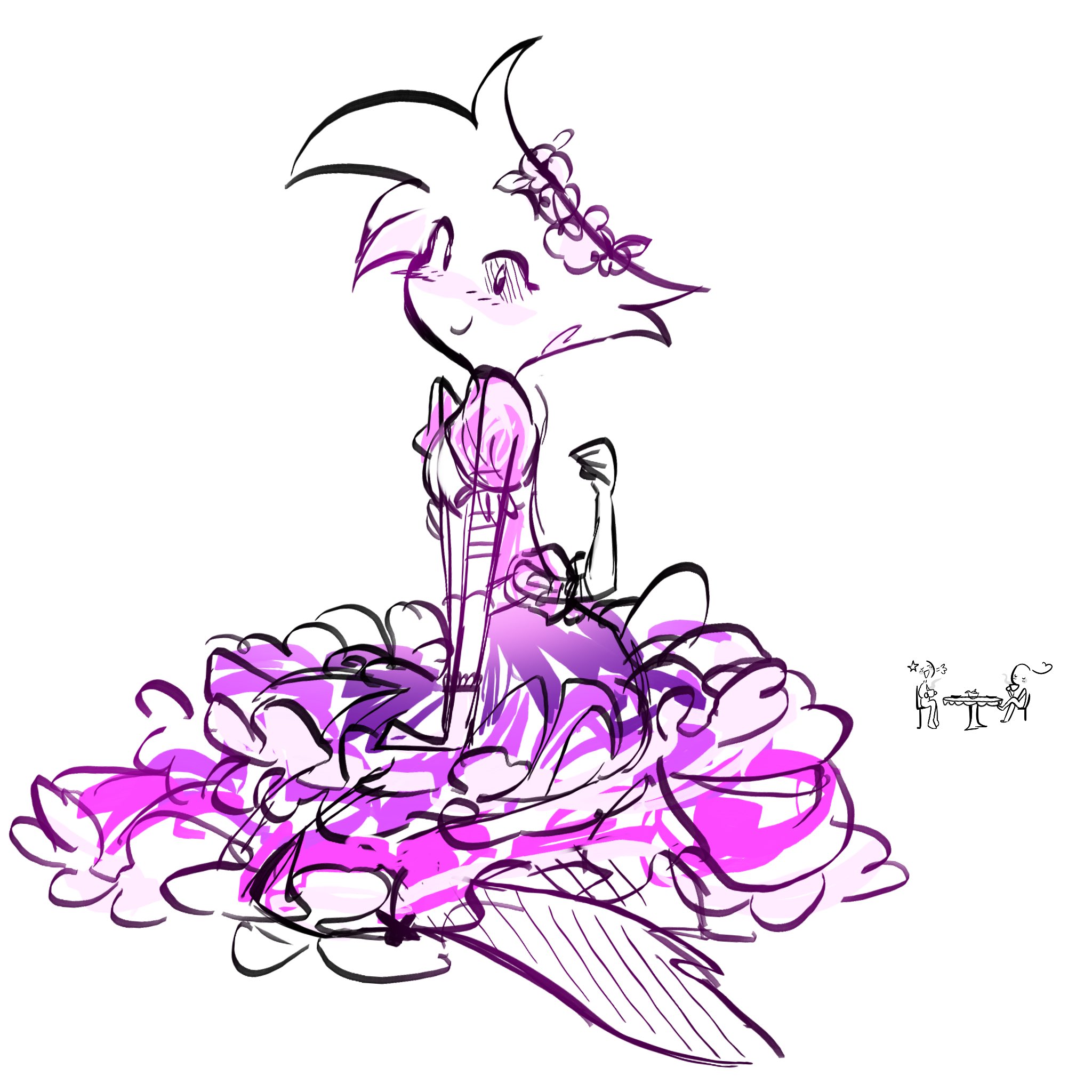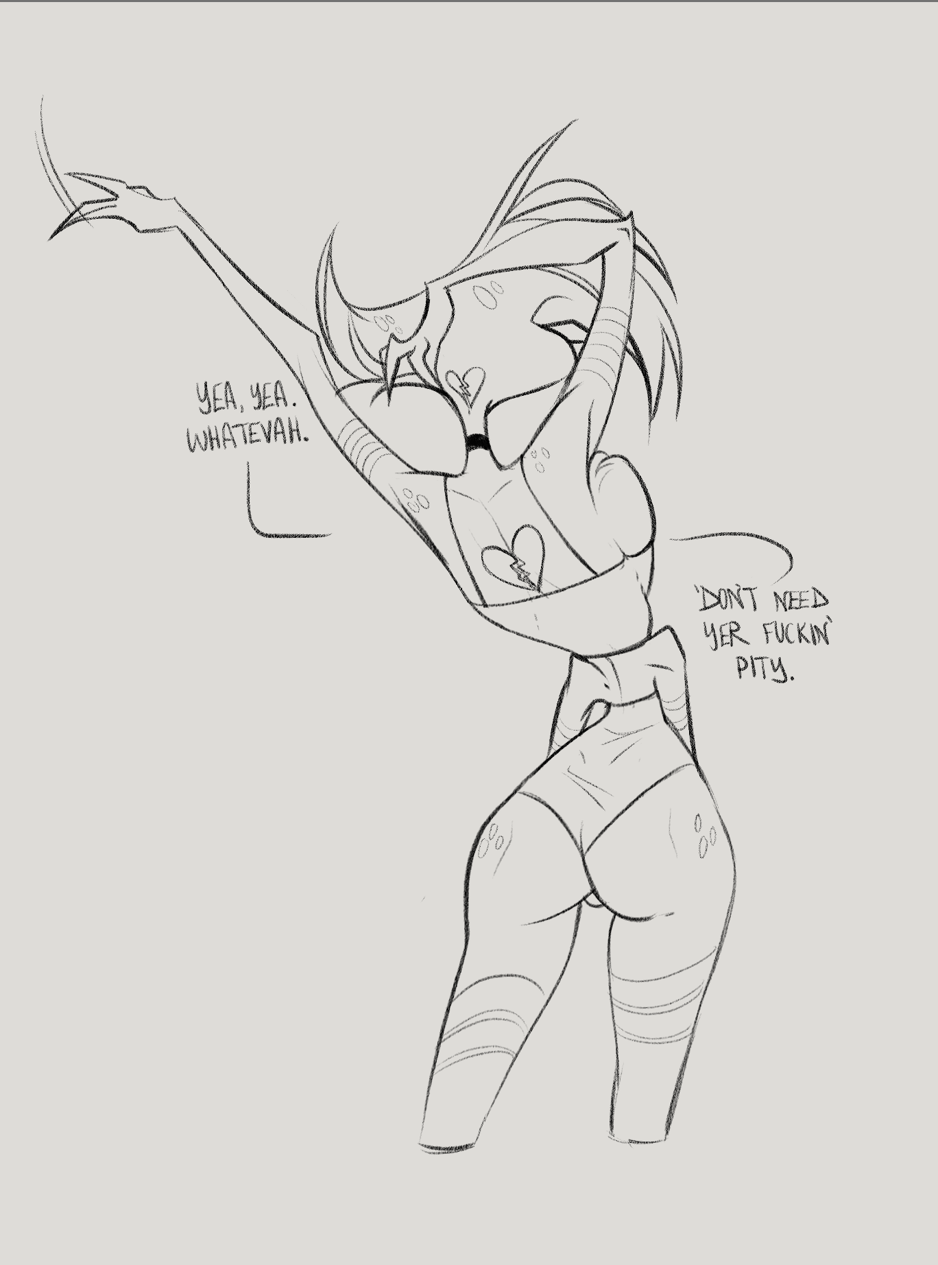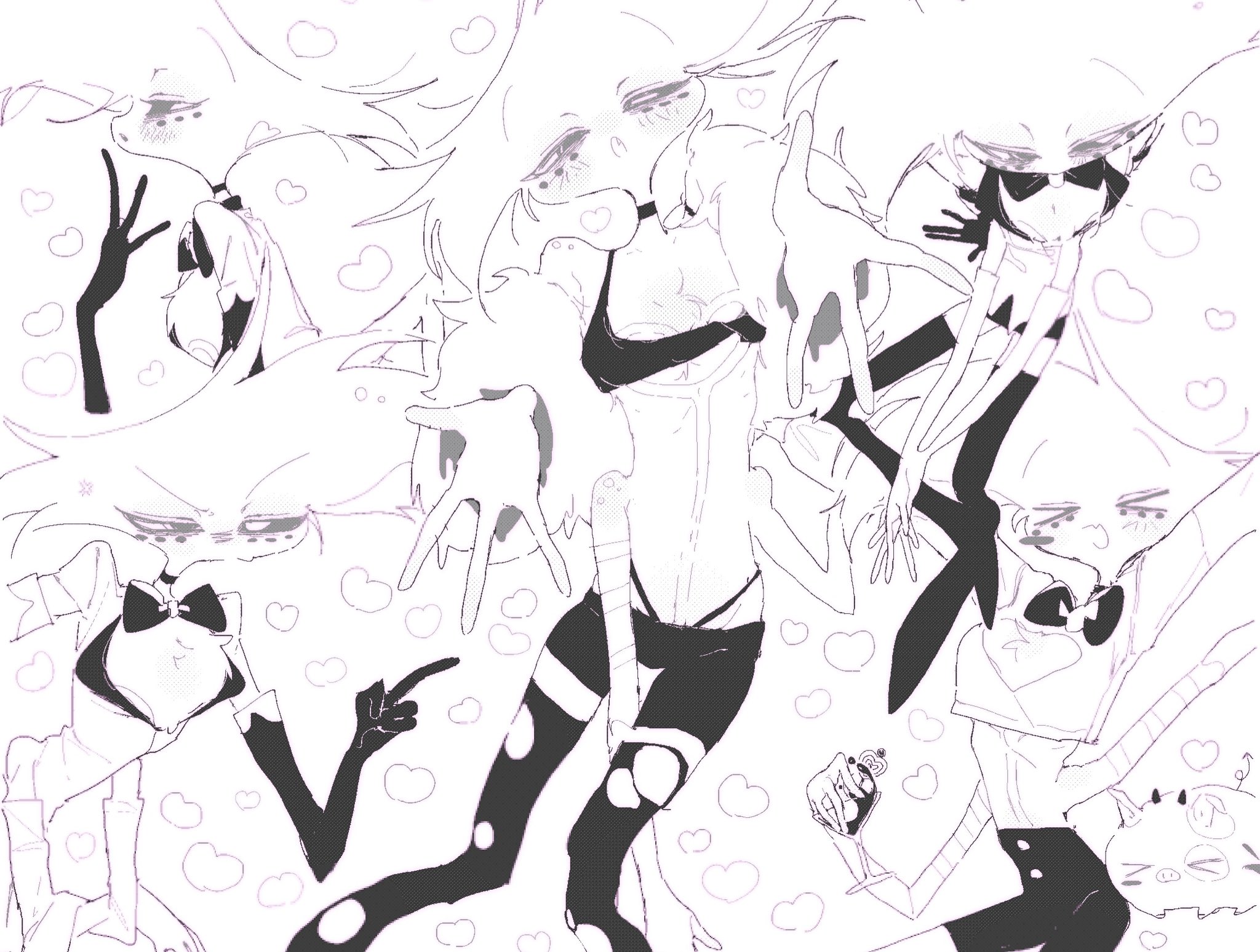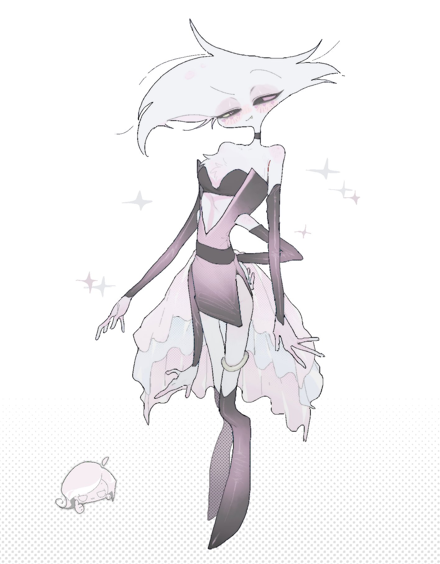 >"AD, why do you always have to crossdress?">"What? It's leanin' into my brand of raw sexual powah.">"Yeah, but don't you get tired of the impracticality or playing the prison bicycle?">"First, I ain't a bicycle. I charge by the hour. Second, naw.">Angel Dust proceeds to pull at least two Tommy Guns (and a couple of Derringers) out of his chest fluff before gunning down some conmen selling bootleg Angel Dust merch.