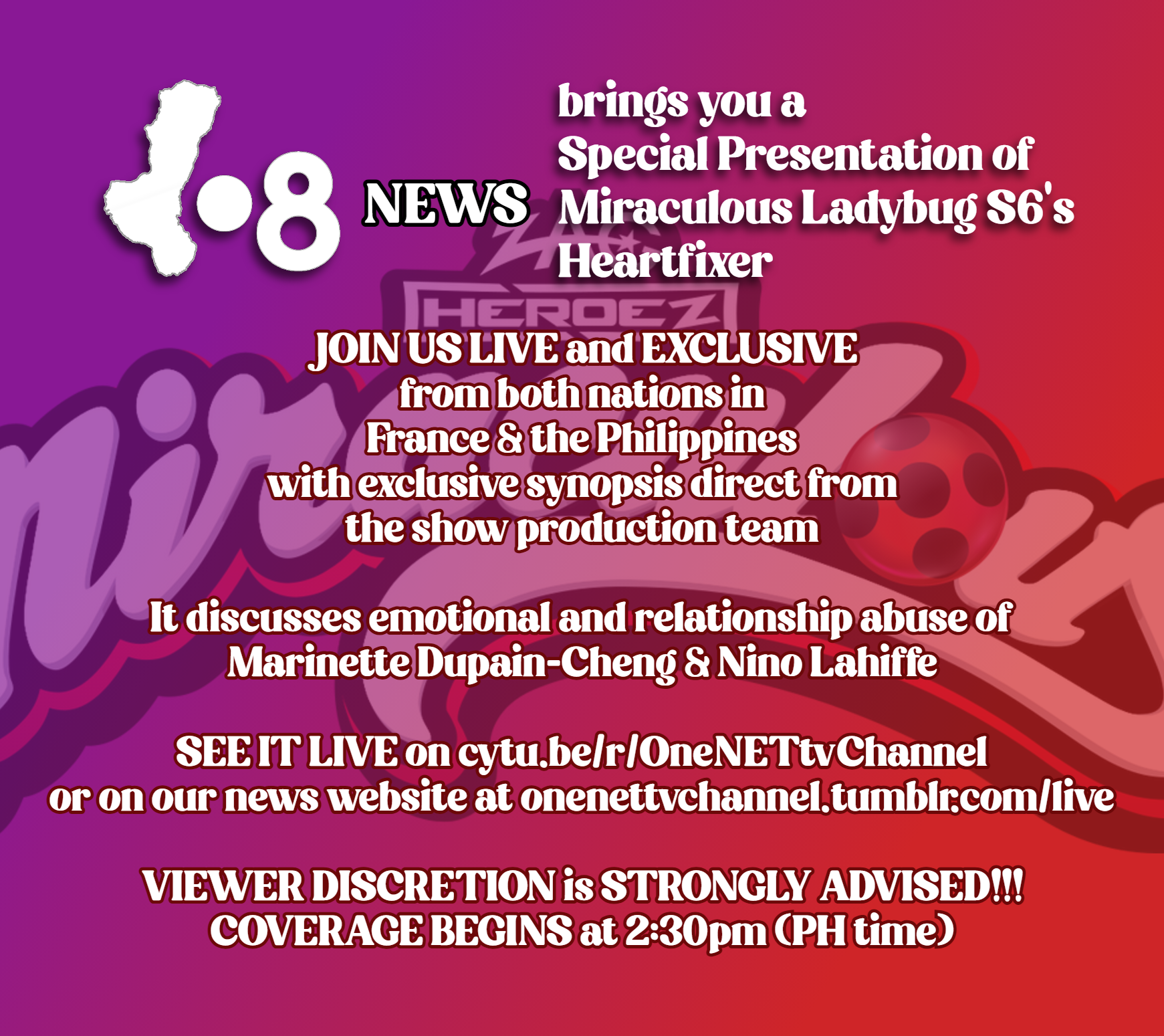 Good day!We go live later today at 2:30pm on my local timezone, for a special pre-show of Heartfixer, along my experience of TF1+ premium from overseas, its a no go outside France. Chat is included for non-Discord thingy.See ya soon.