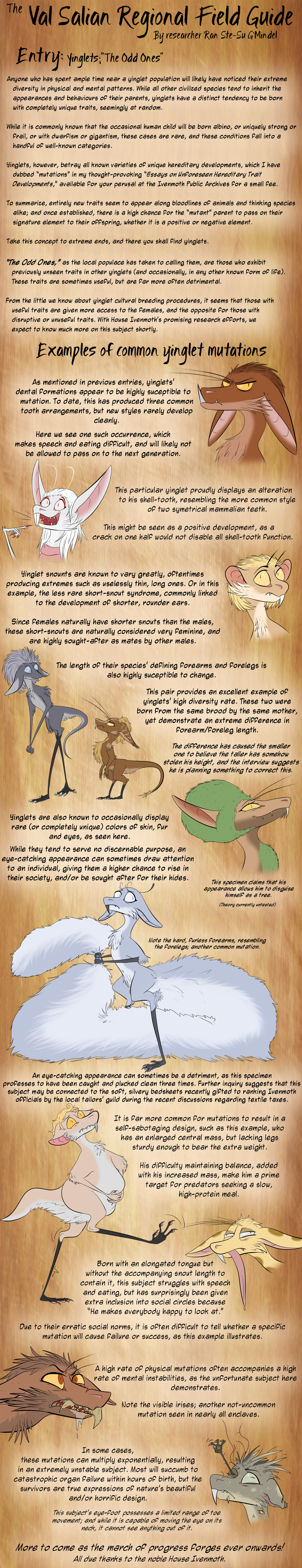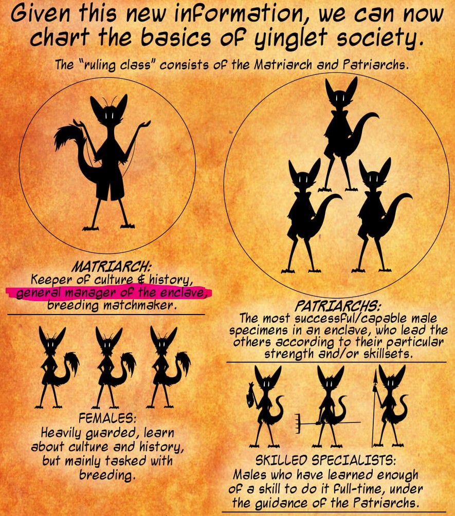 Oh and, it feels like the yinglet's natural social structure is probably something like a hyena pack, with a few alpha females surrounded by males of varying status. It would explain why the females are decorated with the hair tuft, she's the one that has to attract a pack of males to be succesful.In that natural family-pack structure most males would be valued as members of the family, rather than be outcasts.The enclaves are an entirely unnatural accumulation of wealth and power that leaves most males superfluous, disposable and destitute. We read about the great conqueror in one of the field guides, some kind of genghis khan like figure who conquered everything and made the enclaves.The family-pack is the only dignified way for yinglet males to live. The Enclave Revolution and its consequences have been a disaster for the yinglet race.