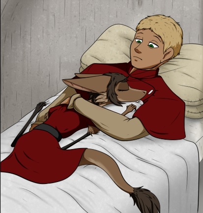 anyway there is some really good stuff too.>kass keeps his male identity, doesn't get cucked out of it or forced to find his inner femininity or some shit like that>shows healthy male bonding>kass warms to lopin in a drunken clam bender instead of a therapy session>kass cries (whines?) about his new body in elims arms, unconditional bro love>kass watches over elim after he gets stabbed day and night, falling asleep in his arms>kass rejects vizlet's overbearing attempts at feminine comfort outrightthe moment where he almost cries and then pushes her away is actual kinographyI think there is some real meat on the bones here, but I fear very much it'll go in some awful direction soon. we'll see.