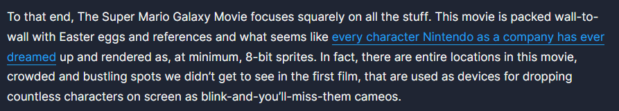 Nintendo seems "almost" comfortable with letting the movies be unrelated takes to the characters, aside from their last second attempt to make Peach's game cover appearance synergize with her movie version (and possibly making her voice deeper in the game, since she sounded normal in Wonder,) but now it does seem like a question worth asking, if such a drastic reveal of Peach and Rosalina being family will ever bleed into the games just because this movie is such a huge cog in the active franchise that ignoring it seems difficult. Like even just teases or some menu/bio saying there's "rumors" of the game versions having some strange connection. Are they gonna do this?I at least... wouldn't think they'd directly impliment it into any new games. That'd be a slippery slope if ever there was one.