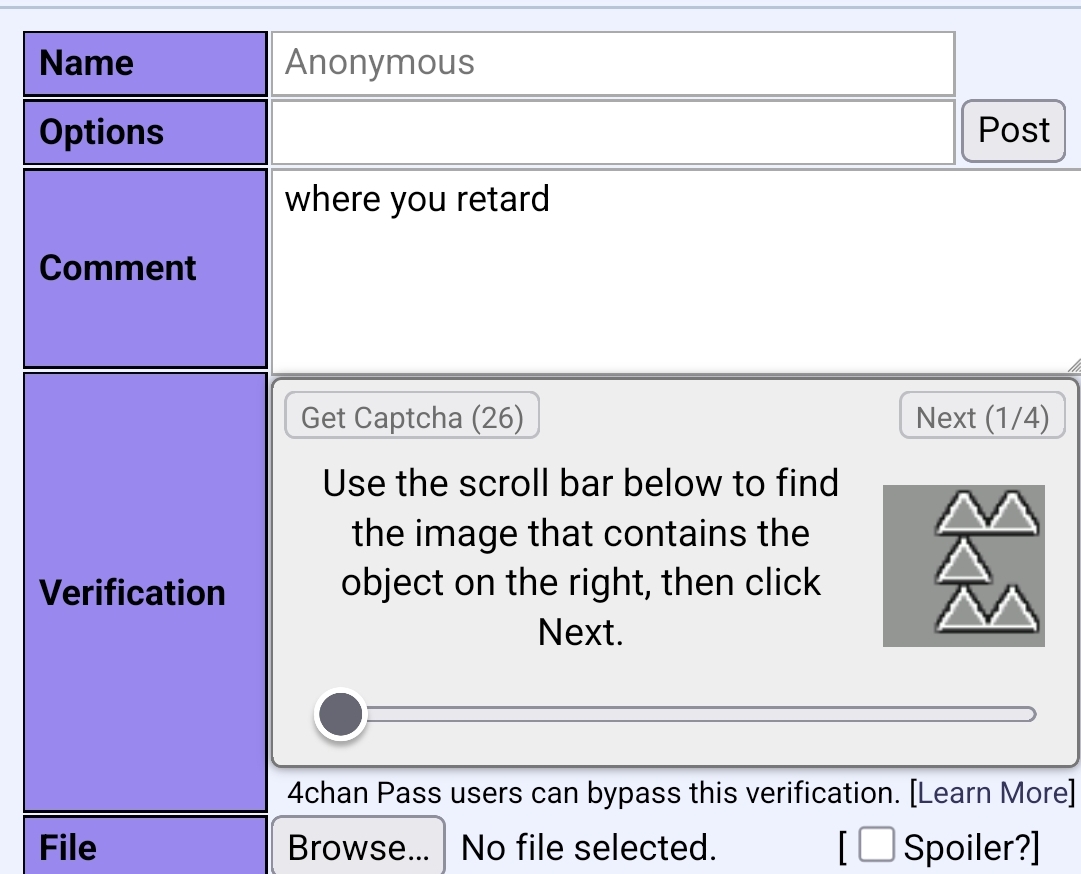 Oh this is tits mcgee. This is absolute tits. I am ... definitely gonna try not to refresh any threads I'm gonna be really active in, but...How is this even working? I thought the captcha was run by a third party.>>153043856wait, was THAT what was happening? we had some kind of control over it?