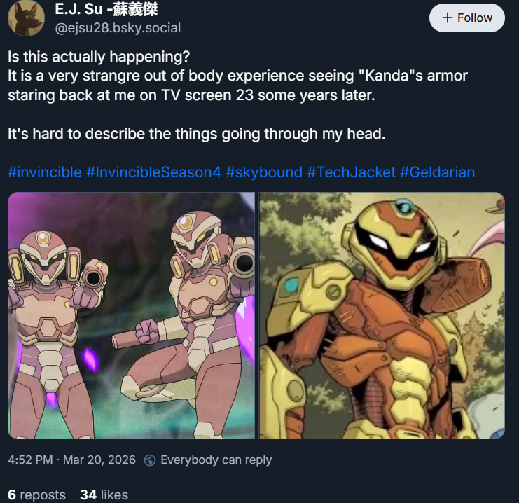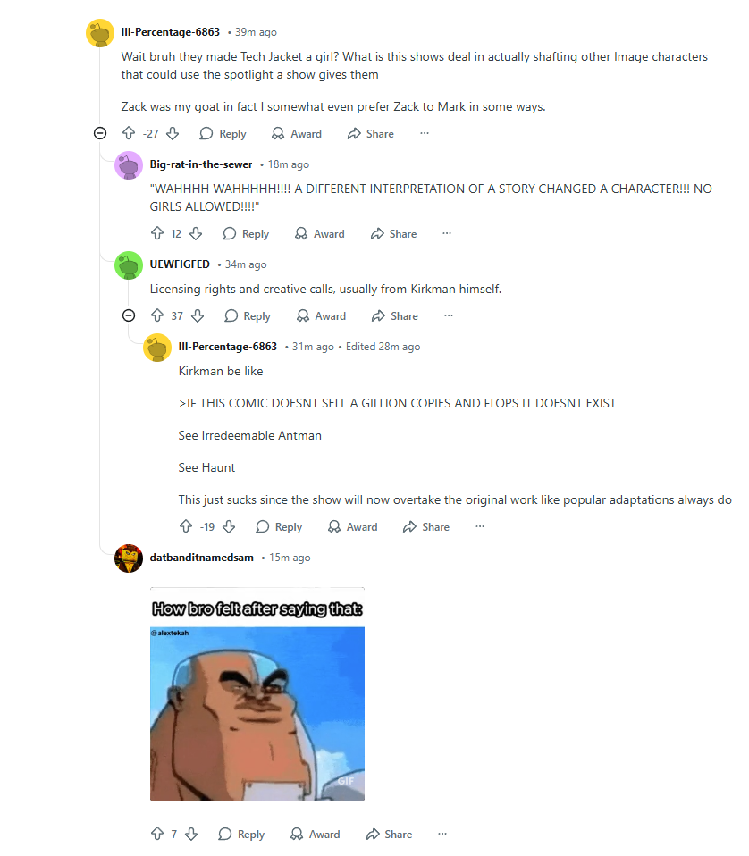 >This isn’t the first departure the animated series has made from the source material. Fans are well aware that the show changed the ethnicity of Mark’s girlfriend Amber Bennett from White to Black. Likewise, the character of Shrinking Ray was originally male in the comics but was switched to female along with the alternate name spelling of Shrinking Rae and an expanded role. In an exclusive interview with Den of Geek, Kirkman revealed the decision to gender swap the character was for a rather sample reason. “When it came time to introduce Tech Jacket, I realized that if we had brought him straight to comics, he’d be very similar to Mark.”https://www.comicsbeat.com/invincible-tech-jacket-reveal-spoilers/