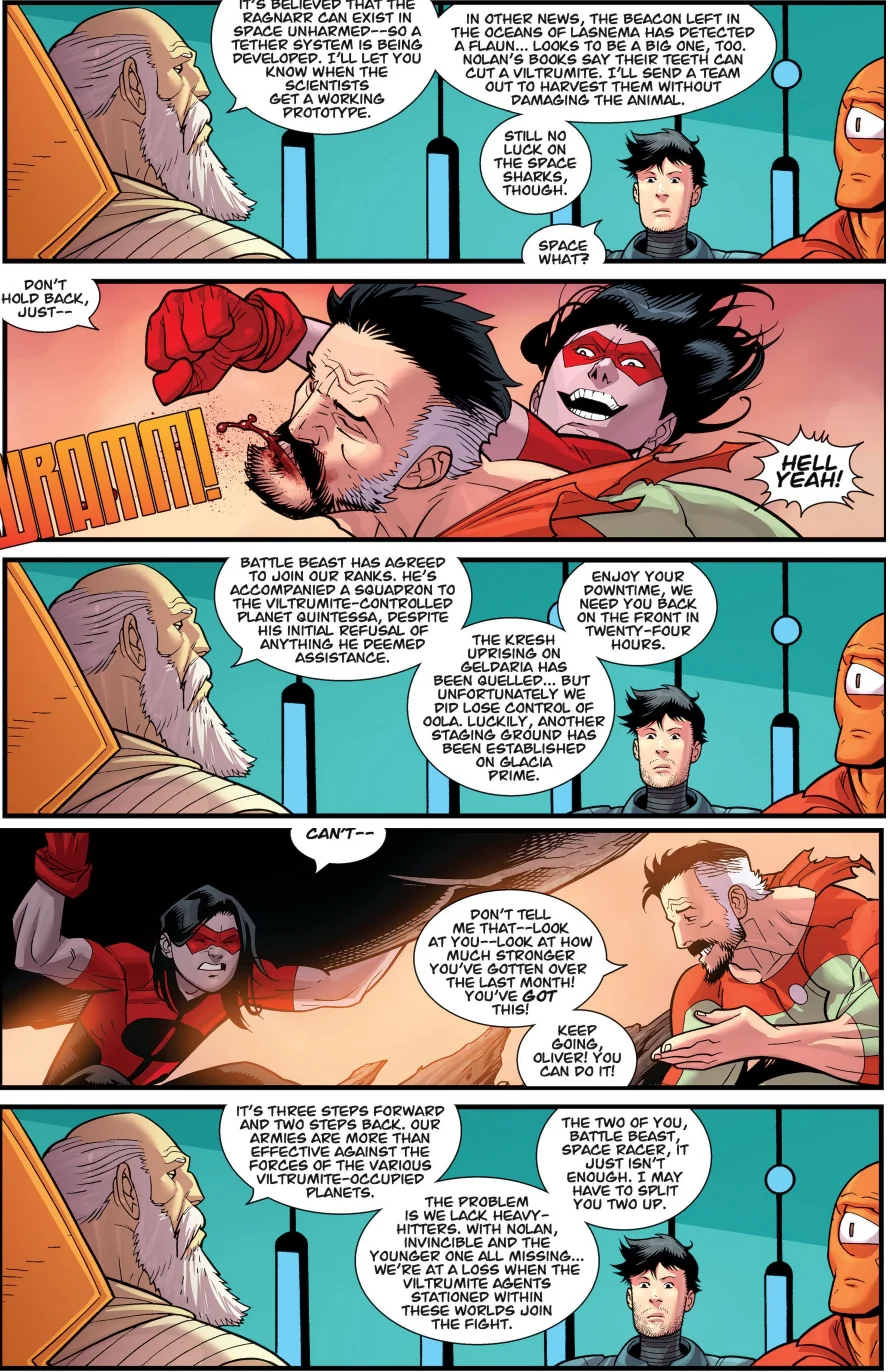 Besides my complaints I do admit the fight was pretty funI just wish the other viltrumites had more personality, so far Conquest and Kregg are the only ones. I guess Anissa exists but meta knowledge about future rape doesn't mean I enjoy her right now. Now the Conquest is gone I'll have to learn the name of the black guy I guess