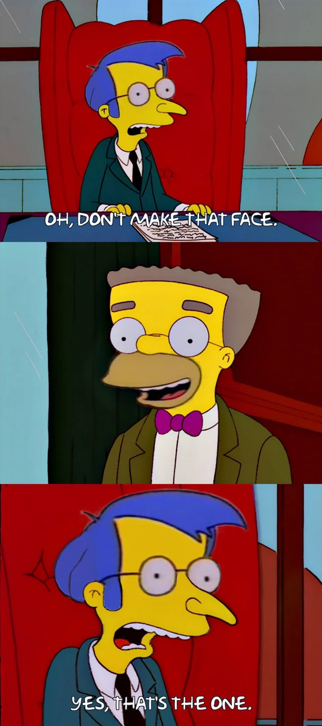 >>153075474The point of Simpsons is that Springfield is not a quaint little town. Everyone is dysfunctional. Apu sells stuff past expiration date, Krusty is a jaded husk of a man making a show for kids, Moe does shady shit when not tending to bar, lawyer Lionel Hutz and mayor Quimby go without saying etc. Smithers' homosexuality fit that world better as a dirty little secret that was part of the joke just like everyone else's vice.