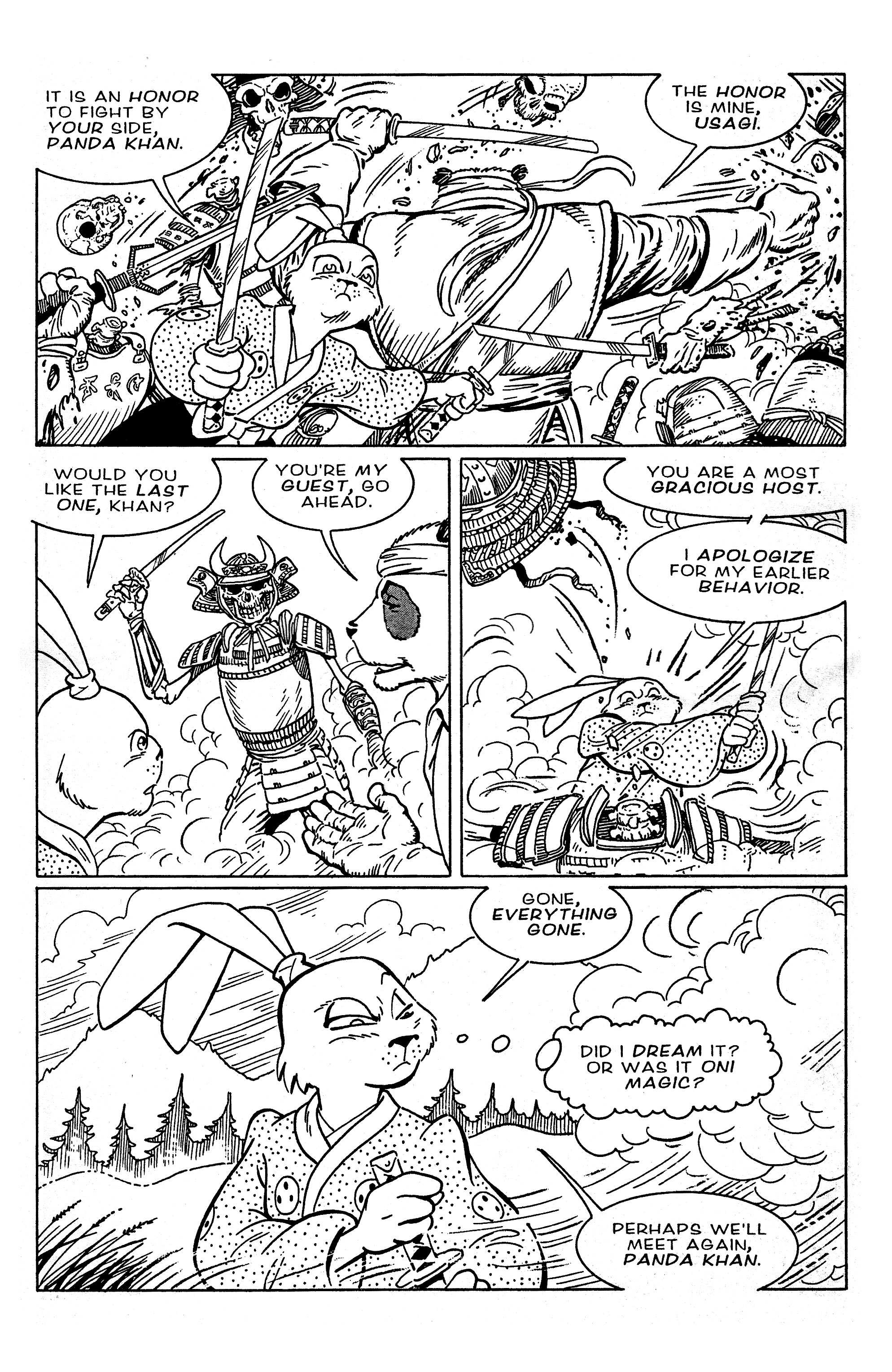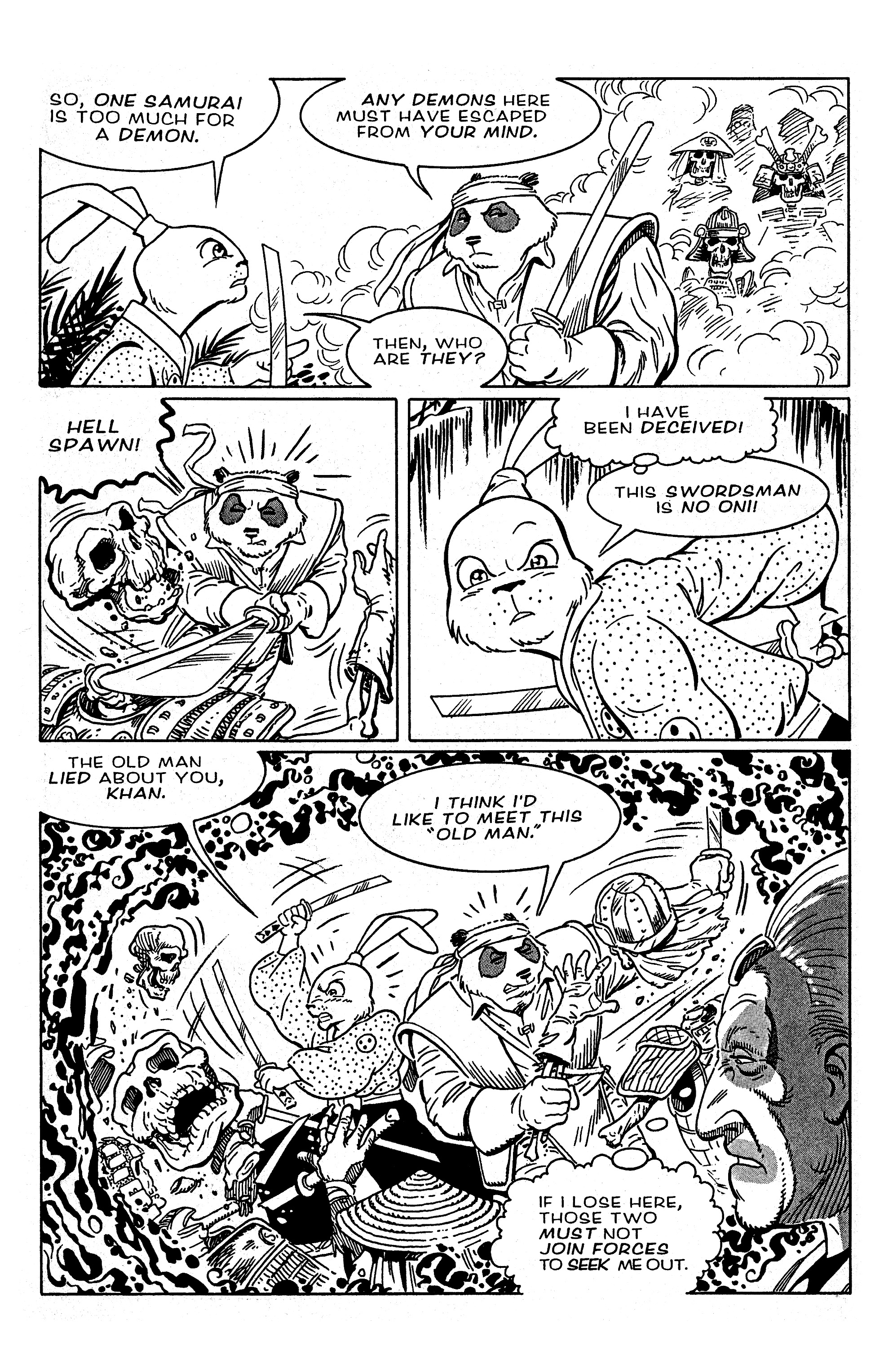 Usagi Yojimbo Meets Panda Khan was originally part of UY v1 (Fantagraphics) #34, the issue with Gen pt. 1 (Lady Asano's Story). Panda Khan appeared earlier in UY v1 #21, the issue with Blood Wings pt. 1 that immediately preceded his cross-over story with Space Ark.Even though Panda KHAN's name doesn't really suggest it, I think PK is supposed to be ethnically Chinese. Could this be the mysterious Chinese person that Stan hinted at in his Letters To Stan column?