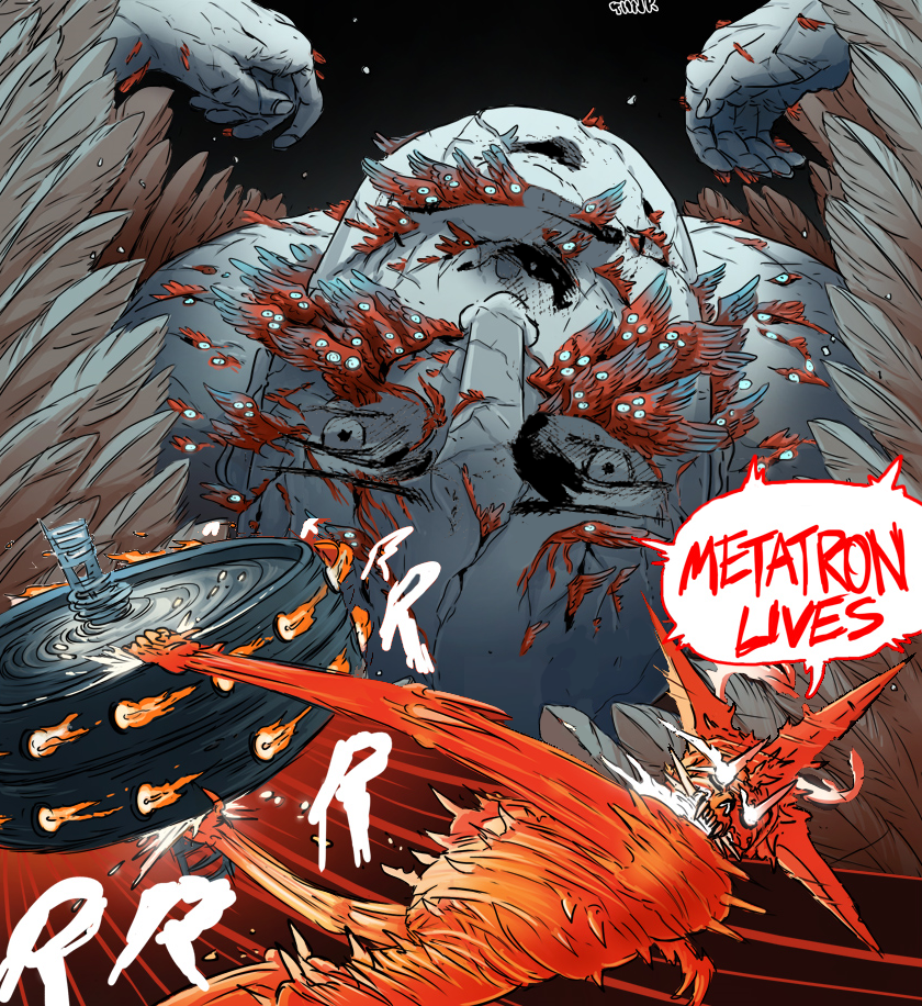 >>153080502I know big complex detailed fight scenes are Abby's favourite thing, but I'm not loving the pacing. I really think this could have used some more breathing space and lead-up. Metatron just popping up in the sky in the middle of a fight is almost anticlimactic. Maybe better to have taken some of that lengthy downtime from before and interspersed it with bits of cool fighting, rather than all the crackers followed by all the cheese?