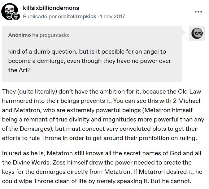 >>153080502>But the scribe was mute, and had nothing to say,>He had sworn himself to silence a long time ago,>Sworn to seal his mouth,>So that not even one ounce of love could not depart his body.”Interesting. Metatron is supposed to have made a vow of silence, but in the modern era he speaks and even spoke to White Chain, with a dreadful voice that obliterated thought. Perhaps the reason why he's not supposed to speak is that he's so powerful his mere words warp the world and harm those around him. Also "so that not even one ounce of love could not depart his body", this dude has no love for the world. The unpleasantness, uptightness and disdain for life of 2 Michael and Juggernaut Star elevated to cosmic, multiversal levels. All the suffering in the world spun by the ultimate antagonist, the one true demiurge, who makes any attempt to beat him part of his great design.