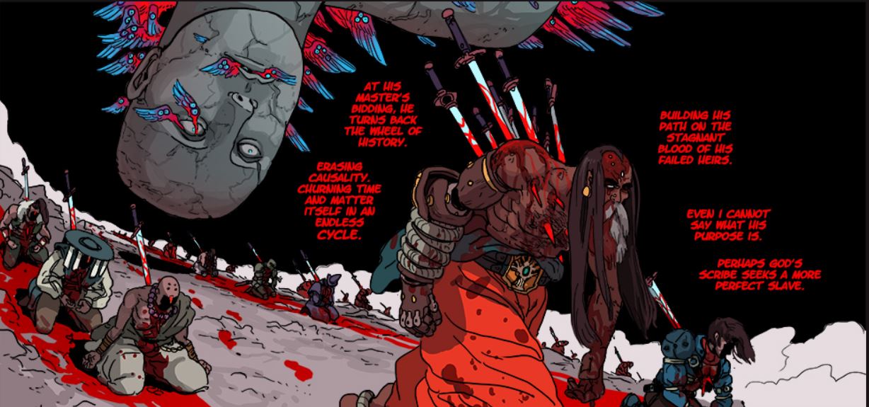 >>153081705You might. It's a story about a girl whose boyfriend is kidnapped by angels who believe he is the heir of all creation, while she is given the key of power of the previous, fallen king of creation and the mission to dethrone the seven kings currently ruling the multiverse, although her initial concern is to find the guy. The story is pretty good, the art even better. The characters are endearing, specially the antagonists. There's some great designs as well as plenty of influences of eastern philosophy and mythology, both in aesthetics and themes, as well as influences from anime, heavy metal and a bunch of other sources. Most of the pages are accompanied by in universe religious texts that thematically complement the story. As the story progresses there's some influences of absurdism and existentialist philosophy that not everyone vibes with, but Imo it's consistent with everything else presented up to that point. It criticizes some narrative tropes while playing on them,although I believe it's well incorporated into the in universe logic.