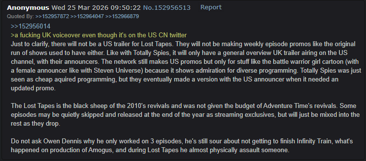 >>153082401Version with sound:https://www.youtube.com/watch?v=BoLAG8fZp4MHoly shit, man. That insider anon from previous threads wasn't joking when he said that the staff wasn't given the same budget as the Adventure Time revivals.My last cope though is that this is an animation made for this preview, which is why it looks so shitty.