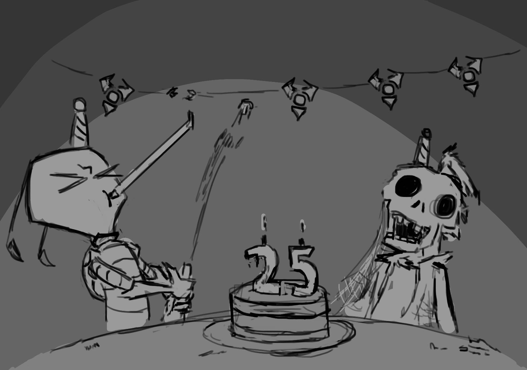 >>153086697Zim and Gaz gaming marathon to celebrate 25 years, Dib and Gir in the background are unsuccessfully playing cards. Gir is eating the cards(They smell like piggies)