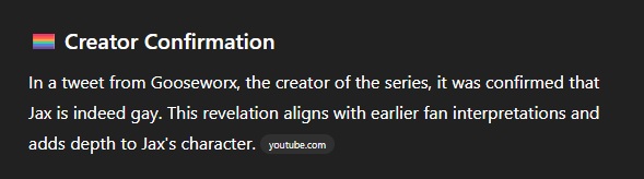 So that fake episode 8 leak of Jax seeing an abstracted Kaufmo turned out to come from this fan songhttps://www.youtube.com/watch?v=piJEhP6t8CI(As a general fan song hater, this is both the worst thing I've ever seen while also somehow being kinda close to slapping)