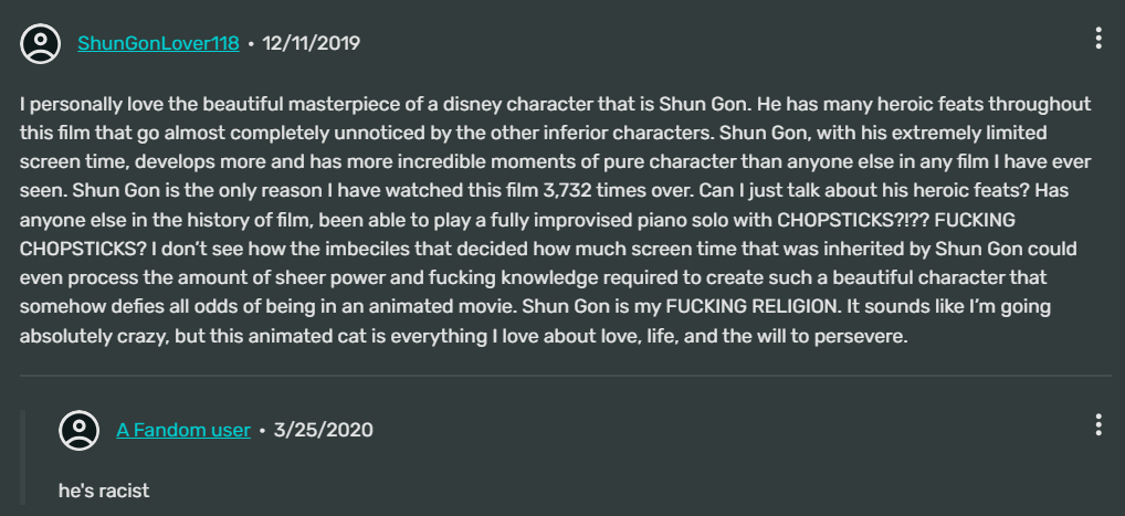 >>153095133This scene isn't racist and anyone with a brain would realize it if they just looked at it.The Siamese cat is a stereotype BREAKER, he's part of the cool cats. This was TRANSGRESSIVE in the 70s, literally the modern equivalent of girlbossing, the movie going SEE, LOOK HOW COOL THIS ASIAN CAT IS, AND HE'S LAMPSHADING ALL THE ASIAN MYSTICISM IN HIS SONGExcept nobody actually understands media or racism today so they look at this scene and go OMG HE SAID HONG KONG?? DISNEY WAS THE REINCARNATION OF HITLERRRR!!!