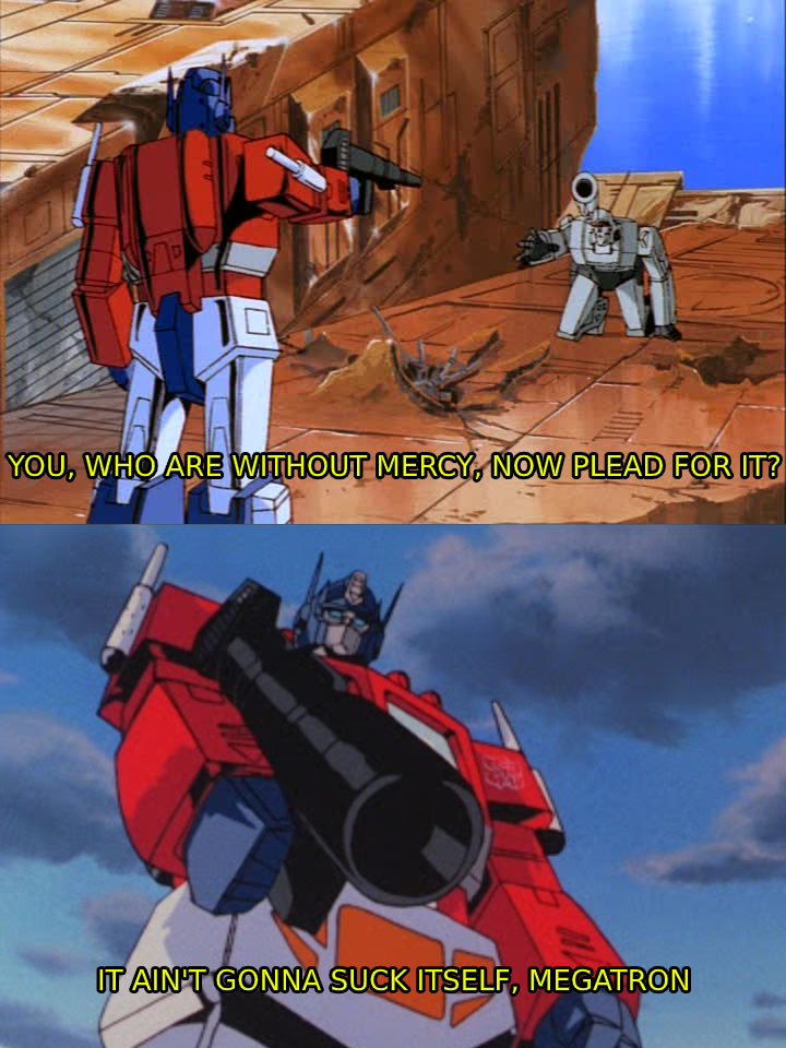 >>153105006OH SHIT YEAAAAAAAAAAAHHHHH!!!>Also apologise for killing Brawn, Prowl and the others in such a grisly fashion