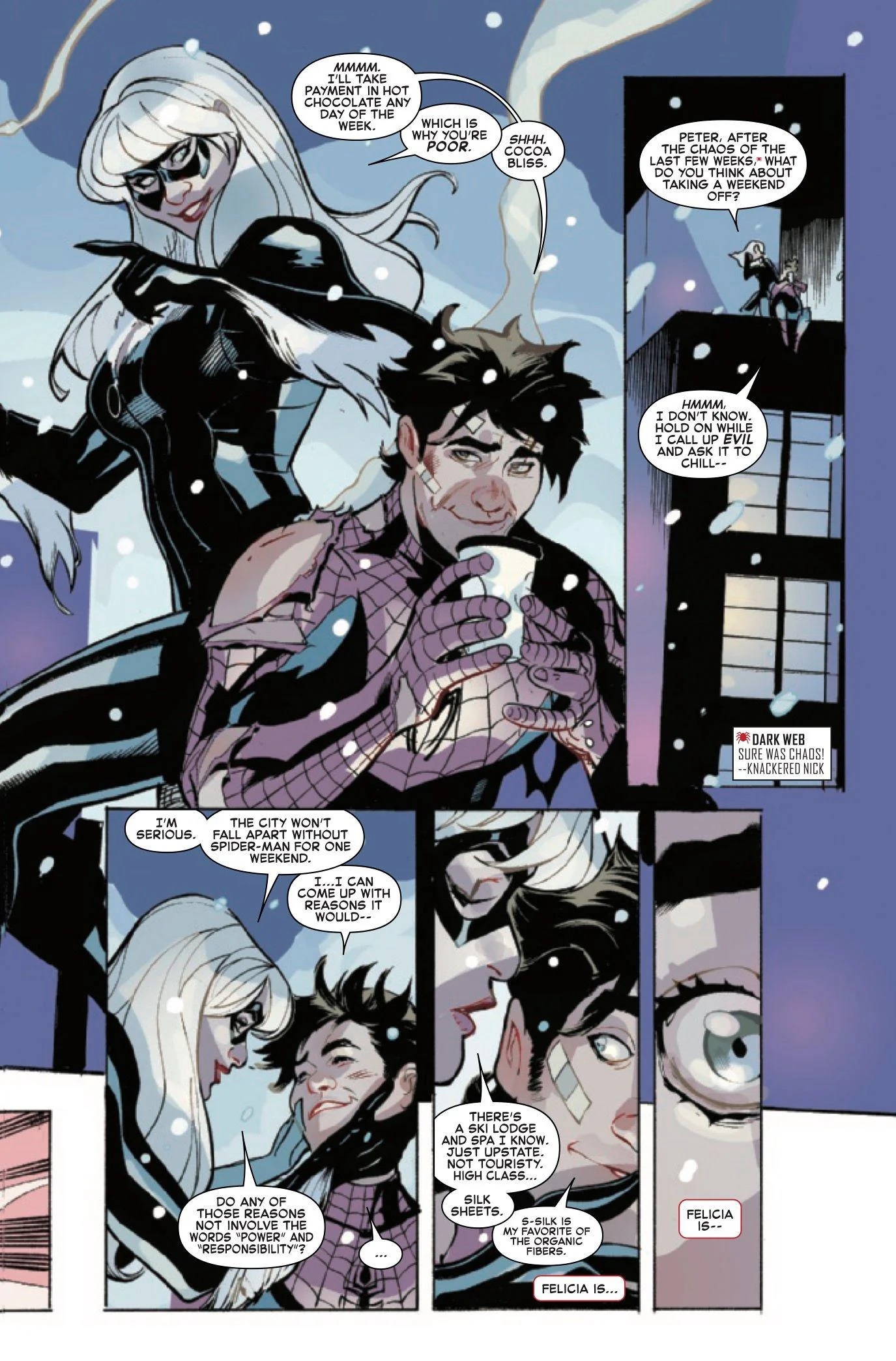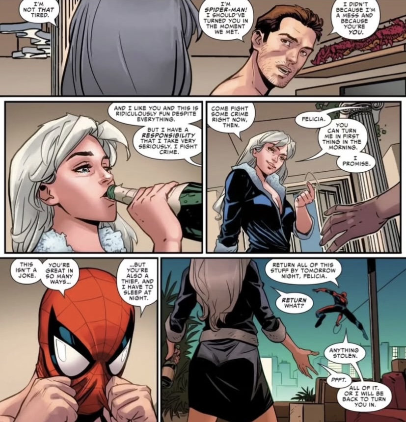 The sad irony here is that Felicia is perhaps the only Spidey supporting character to get character development in years. Outside of baiting fans, the only reason why they can't function as a couple is due to writers pretending nothing has happened in decades