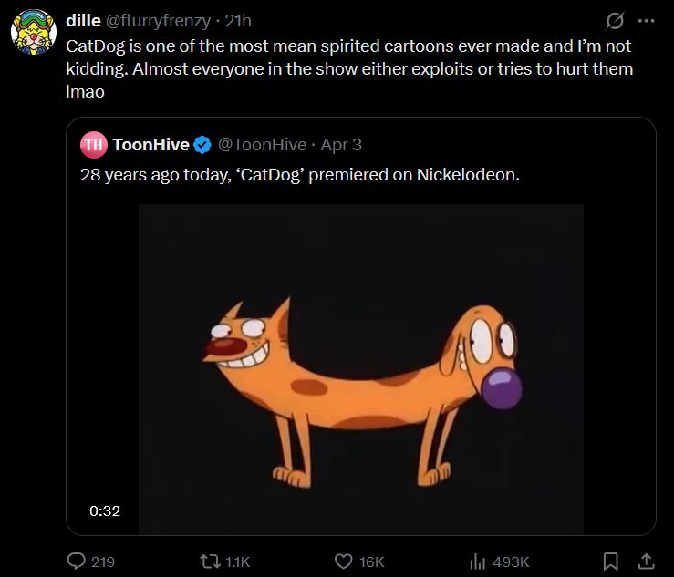 >>153099374What so bad about Catdog? it's just a goofy show about them being beat up and made fun of because they're stupid.