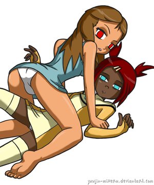 What if you draw her wearing only socks, holding her own panties on one hand (but this is not a sexual scenario), and she's sitting on the lap of a skinny blonde teen, and they're watching Zaboomafoo together on VHS?