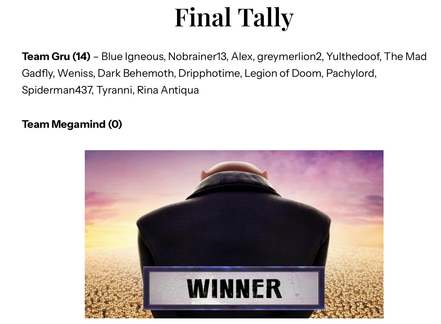 >>153110635I think Megamind will win based off his equipment and its powers which will be enough to offset the speed/minions advantage that Gru has. It also depends on if they scale him to Metro Man, but I actually think he wins even without that.