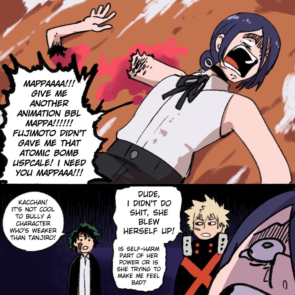 This waiting period actually made me appreciate BnH more.The fact that a single series mindbreaks /dbg/ so fucking hard to the point they start hallucinating things that never happened in the episode is beyond based.Death Battle shows Bakugou destroying a chunk of mountain, on screen, on a canon movie written by the author of the manga, basically saying that even if downplayed feats only Bakugou is so overwhelmingly powerful even Reze with scaling can't beat him.This is, by all possible interpretations, a featschad Victory. But even with that you have people here hallucinating some kind of "All Might Scaling" or Continental Calc that in the episode never happened at all.Even the "light speed scaling" was only for Bakugou's reactions, not his movement speed, and this was only brought up as a benefit of the doubt thing because Reze got Gun devil scaling, and even with Said Gun Devil Scaling Reze wasn't even massively faster, just slightly more./dbg/ hates Boku no Hero sp fucking much that they legit made shit up and seethe over the series winning, and the worst part is that they keep winning every single time.That's just beyond Based in my opinion