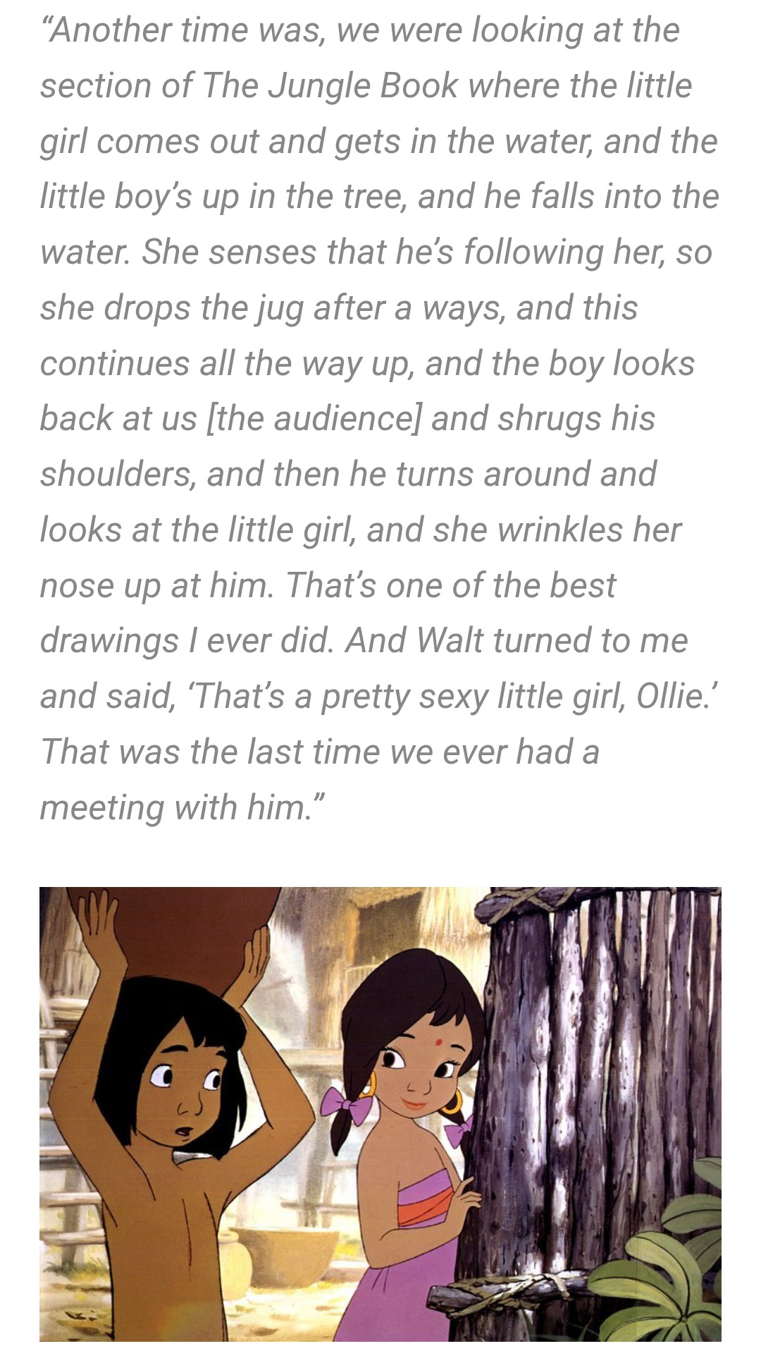 >>153118550Oof. One of the last words Walt said to one of the animators on The Jungle Book was "That is one sexy little girl, Olly."