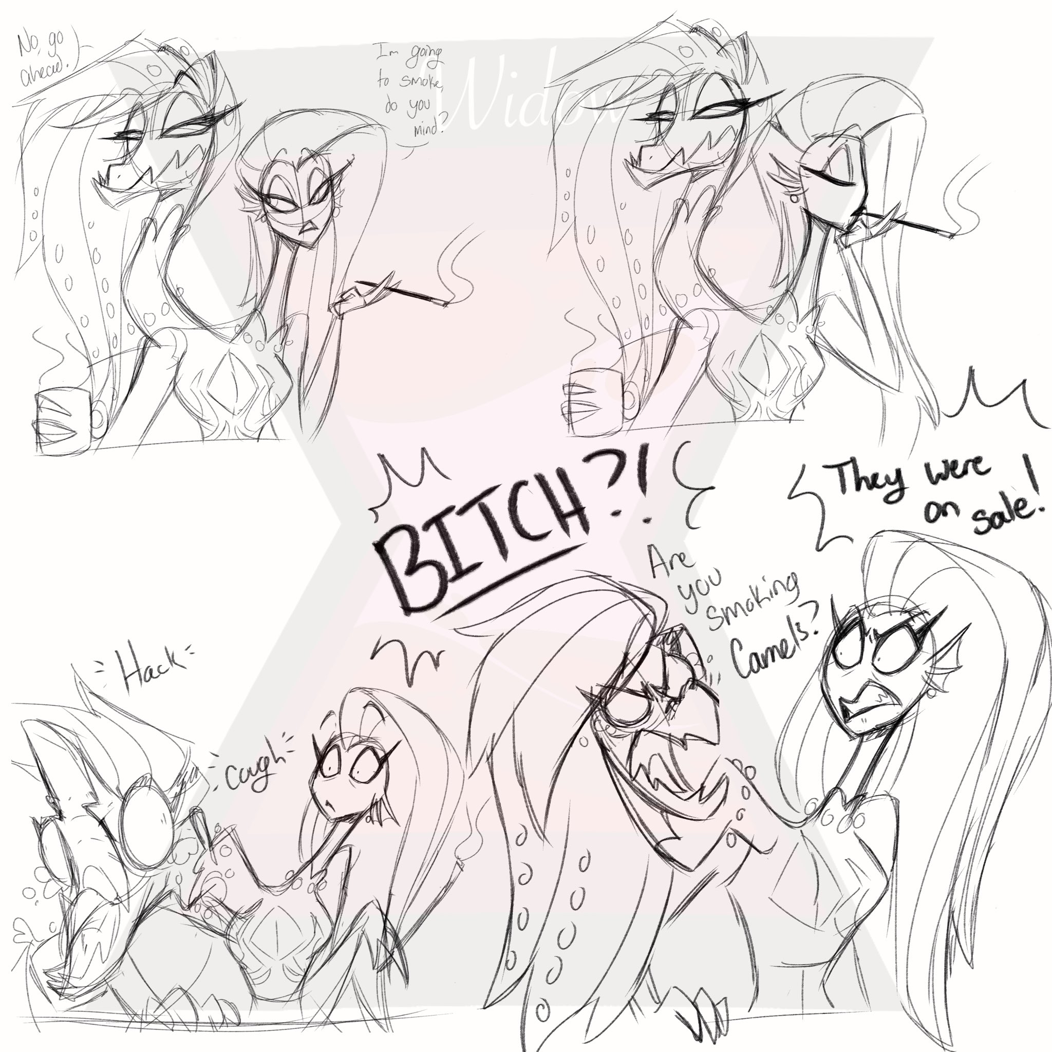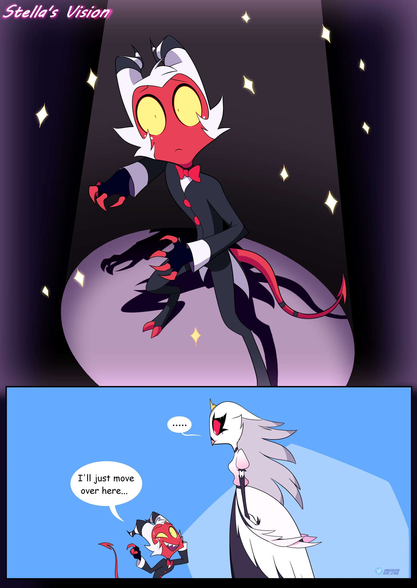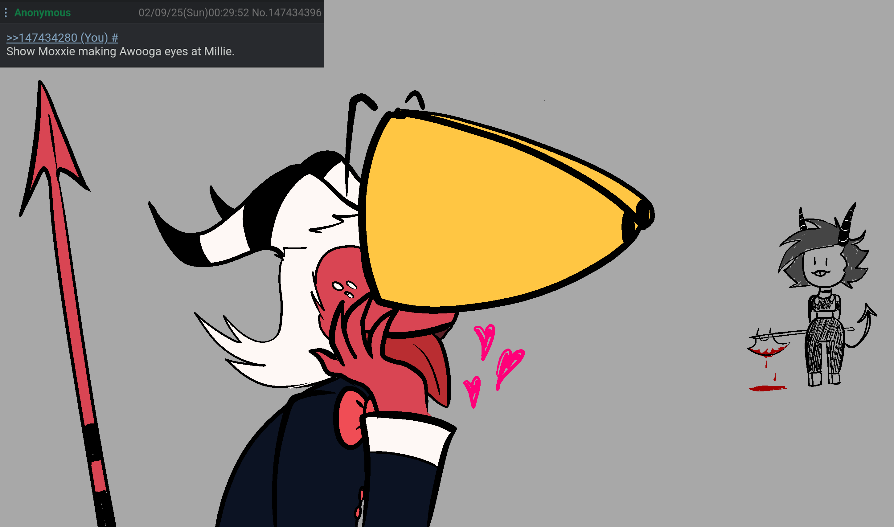 >>153127231Idea: Millie thinks Stella would be less of a bitch if she got some good dick, so she volunteered Moxxie for the job.