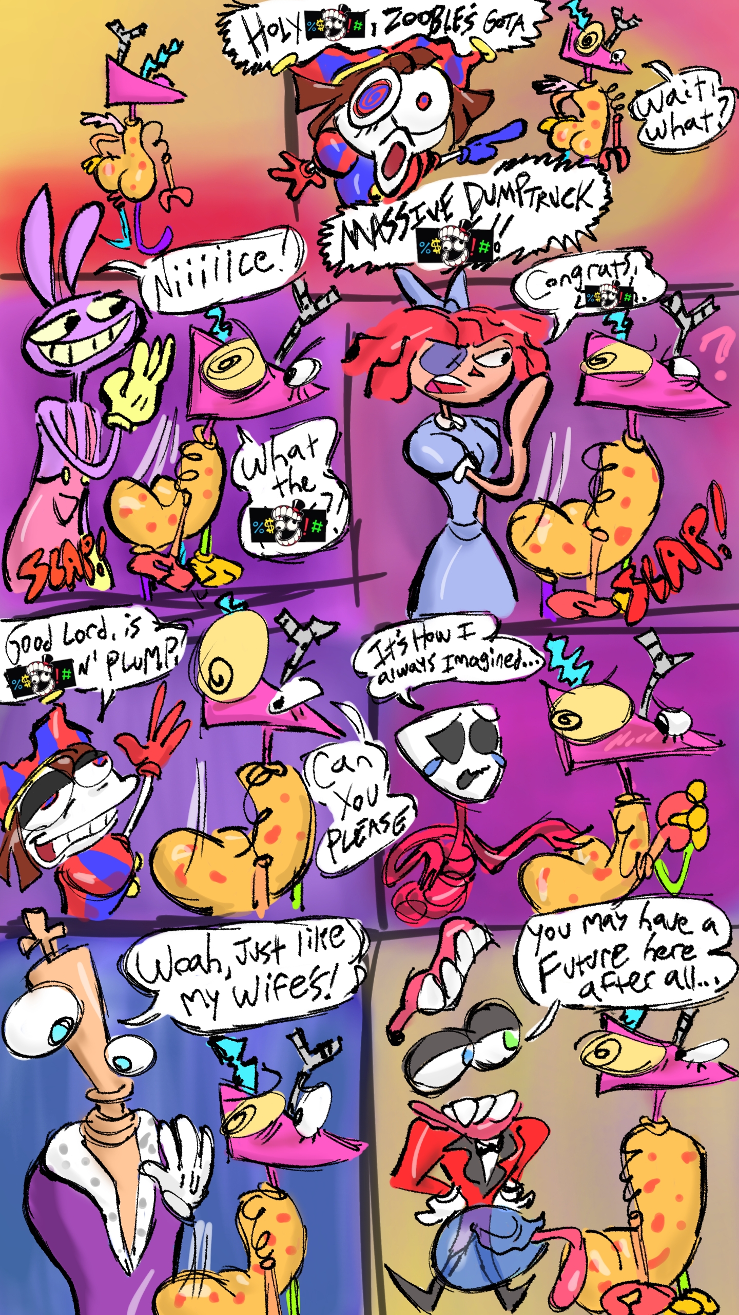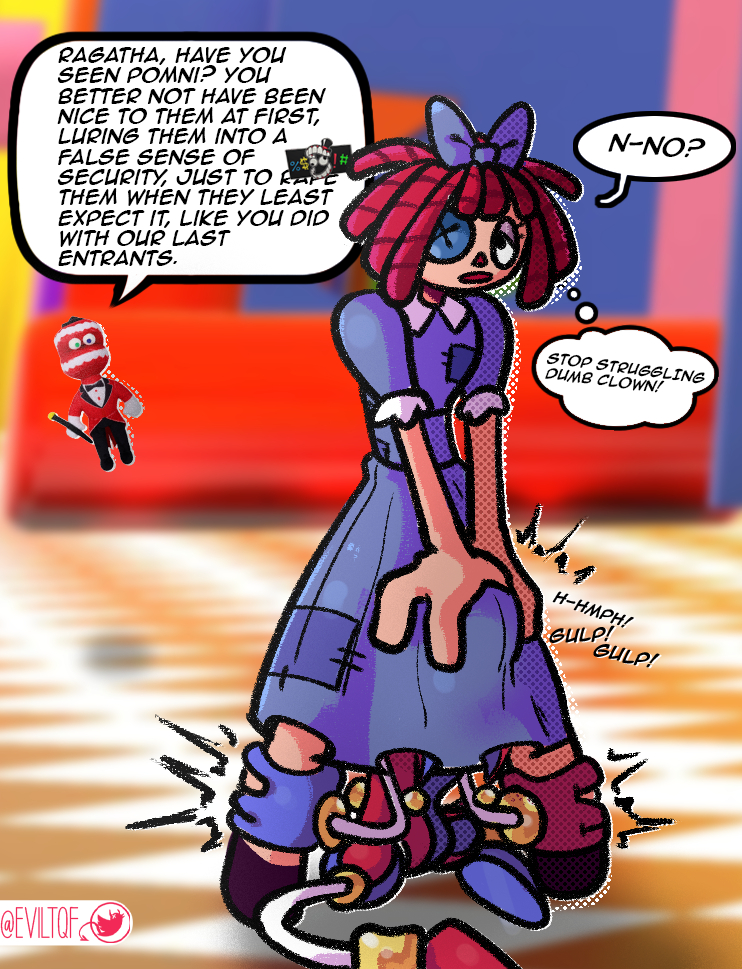 They add sex to the circusZooble and gangle do it constantlyPomni masturbates her little body, but wishes it wasnt so lonely. Its good but its not the same as the real worldJax is in a much better mood recently, downright pleasantPomni asked ragatha how shes enjoying the new featuresShe's embarrassed, says she prefers to keep that private"Hey Jax""Hey Pompom, hell of an adventure today""Yeah, um, I have a... question... its kinda... personal""Yeah?""You know how can all, you know, jerk off?""Yeah, look I've had this conversation with zooble""Uhhhh""And I admit it, I am a lot happier""Oh, uh, i mean, how do you... you know""How do I what?""Did cane give you ugh, a dick? Because I'm still smooth but just sensitive""Oh pomni, wouldn't you like to know""Yeah, I would""Uh haha, real funny Pom""Seriously, I won't tell anyone""I uh... no, I just rub myself. There, happy?""It feels better with a pillow or something, right?""... yeah... its uh, i kinda wrap my legs around a pillow and uh... jeez this is actually super embarrassing""How about instead of a pillow, you use me""...what?""If a pillow feels good, imagine how much better another person would feel"