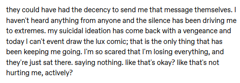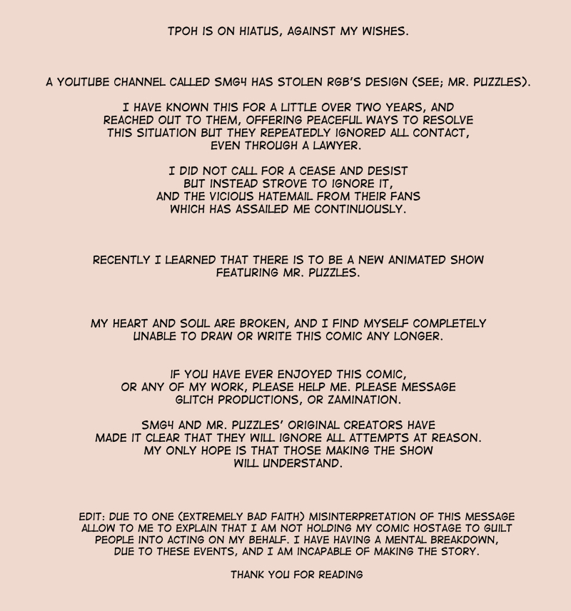 >>153150426She received 3 anonymous messages on Tumblr from, likely from the same person based on the writing style. Instead of temporarily shutting off anon messages, she contacted Glitch.The first time pretentiously asking them to change their character design.The second time with a $4000 legal threat.Then she crashed out publicly, ended her webcomic, and this resulted in an actual wave of mockery from Twitter.