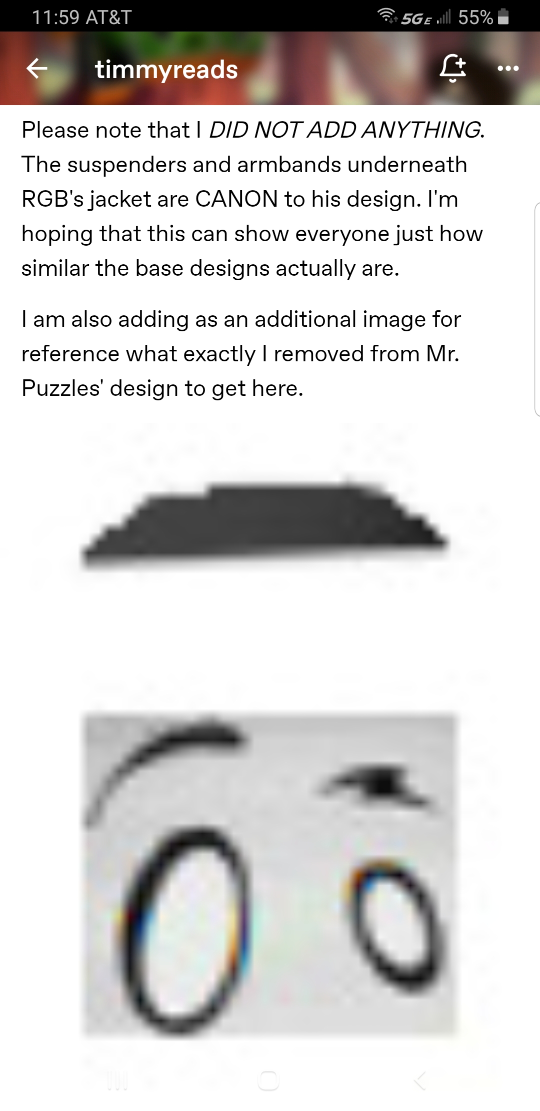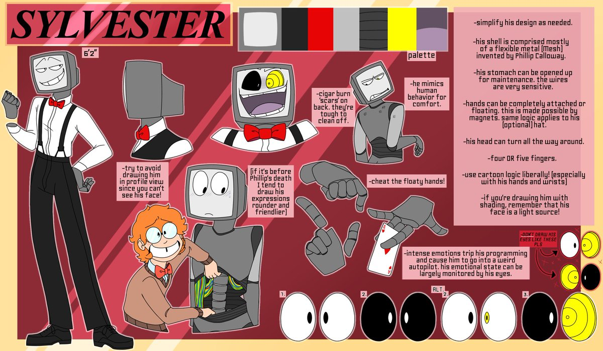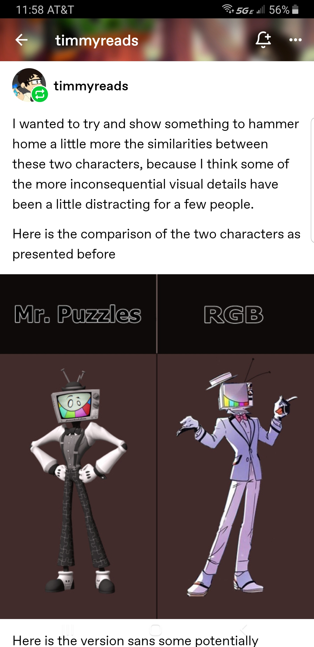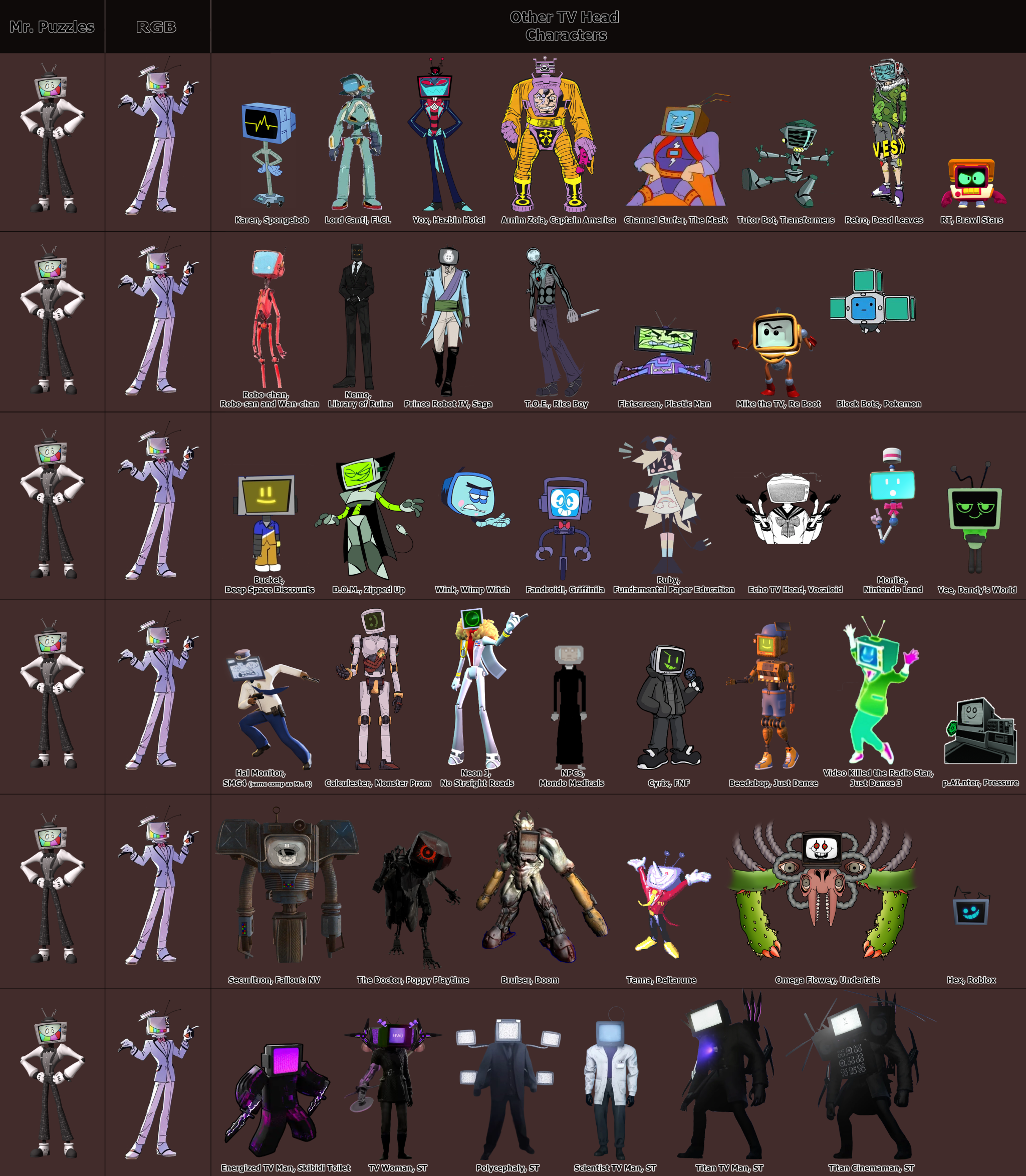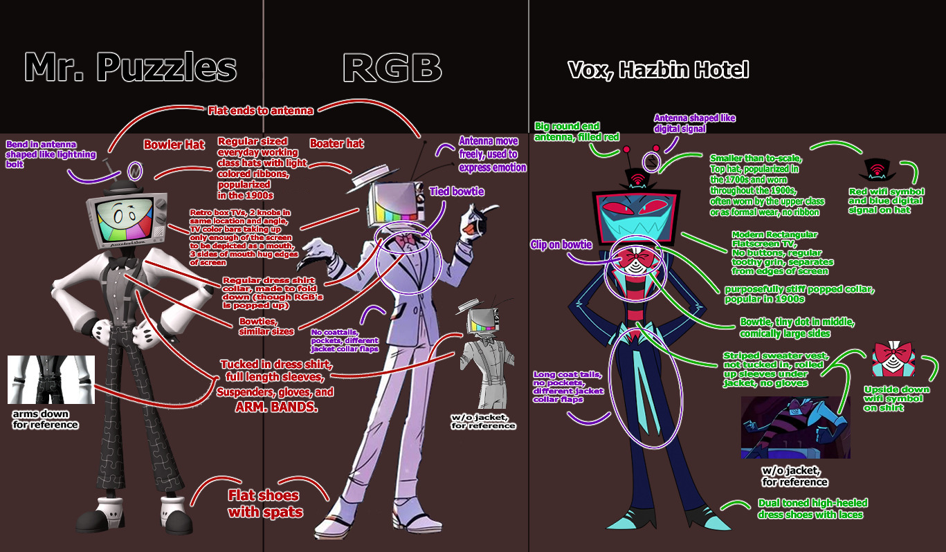 >>153138715>no contenders for a pair as similar,Vox is more similar. The one in the black suit is also WAY more similar, having a similar proportion and posing in addition to a near identical outfit(notched suit jacket, slacks, gloves, heeled leather shoes). In fact, all this proves is that "TV head + classic menswear" is a really, really common combination, as there are 10+(I stopped counting) characters here with that combo, not counting RGB and Puzzles.>>153138735And A Wizard of Earthsea predates both, and has a number of commonalities with Harry Potter. There's only like 8 plots - less depending on who you ask - so this isn't a shocker.>>153138792This is incredibly disingenuous.>two tiny detailsNo less than four different details in the shirt ALONE. Even the details of the TV head differ; RGB's has a second plane further back, his antenna are offset, his screen has less framing around it, RGB's knobs are two-tone, Puzzle's has a logo and additional buttons, and so on. You can't just count similarities, and making them look more alike purposefully(like by not using RGB's more common jacketed appearance) is showing the weakness of your argument.>>153138852Honestly, it's just the most dynamic way to place them. Either they would have been pointing inward out outward; it's a fifty-fifty design wise. Putting them both vertical or horizontal is a no-go, and one horizontal and one vertical is more stable, but not fitting for the character of Puzzles.