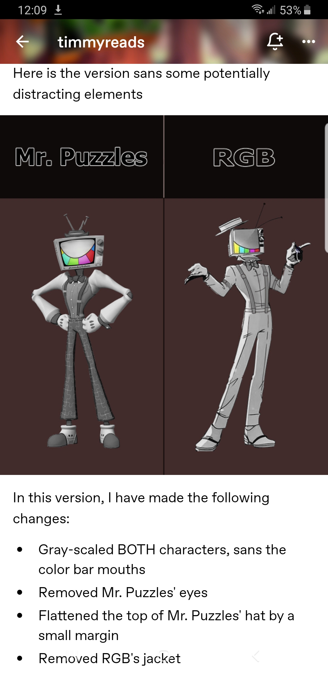 >>153134370Mr puzzles is likely a copped design. Not in an evil way, but more in a looked up TV head characters on google images, saw this design, thought "hey this looks cool" and just copied it subconciously. Happens to a lot of artists