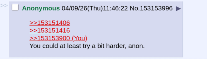 >>153151406>>153151416>>153153900You could at least try a bit harder, anon.