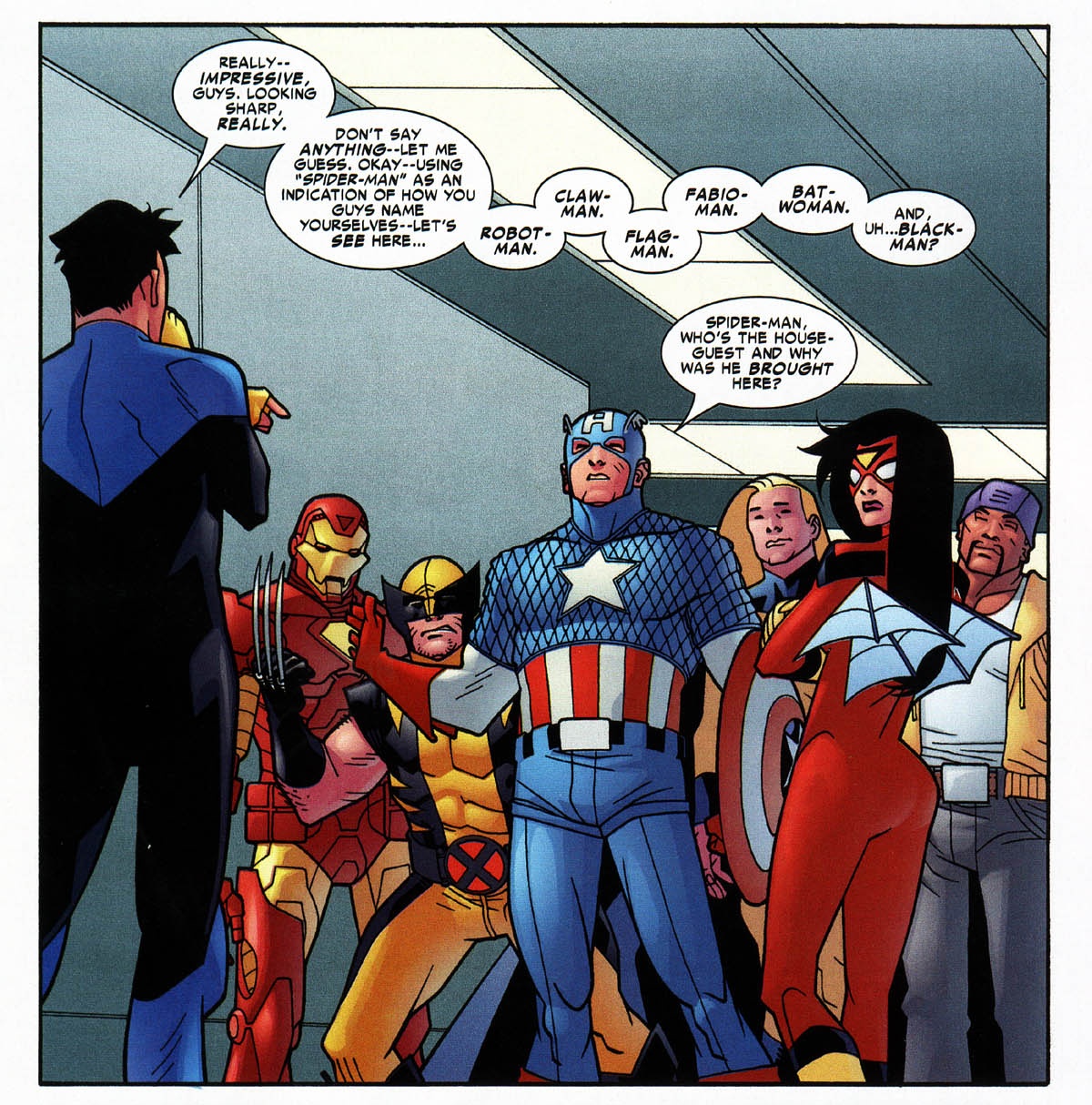 >>153140802Invincible is kind of a bitch, the only thing Kirkman had him do upon meeting the Avengers (and later Batman) was take shots at their naming conventions for supposedly being stupid and uncreative... despite his own teammates being called shit like Monster Girl or Robot.